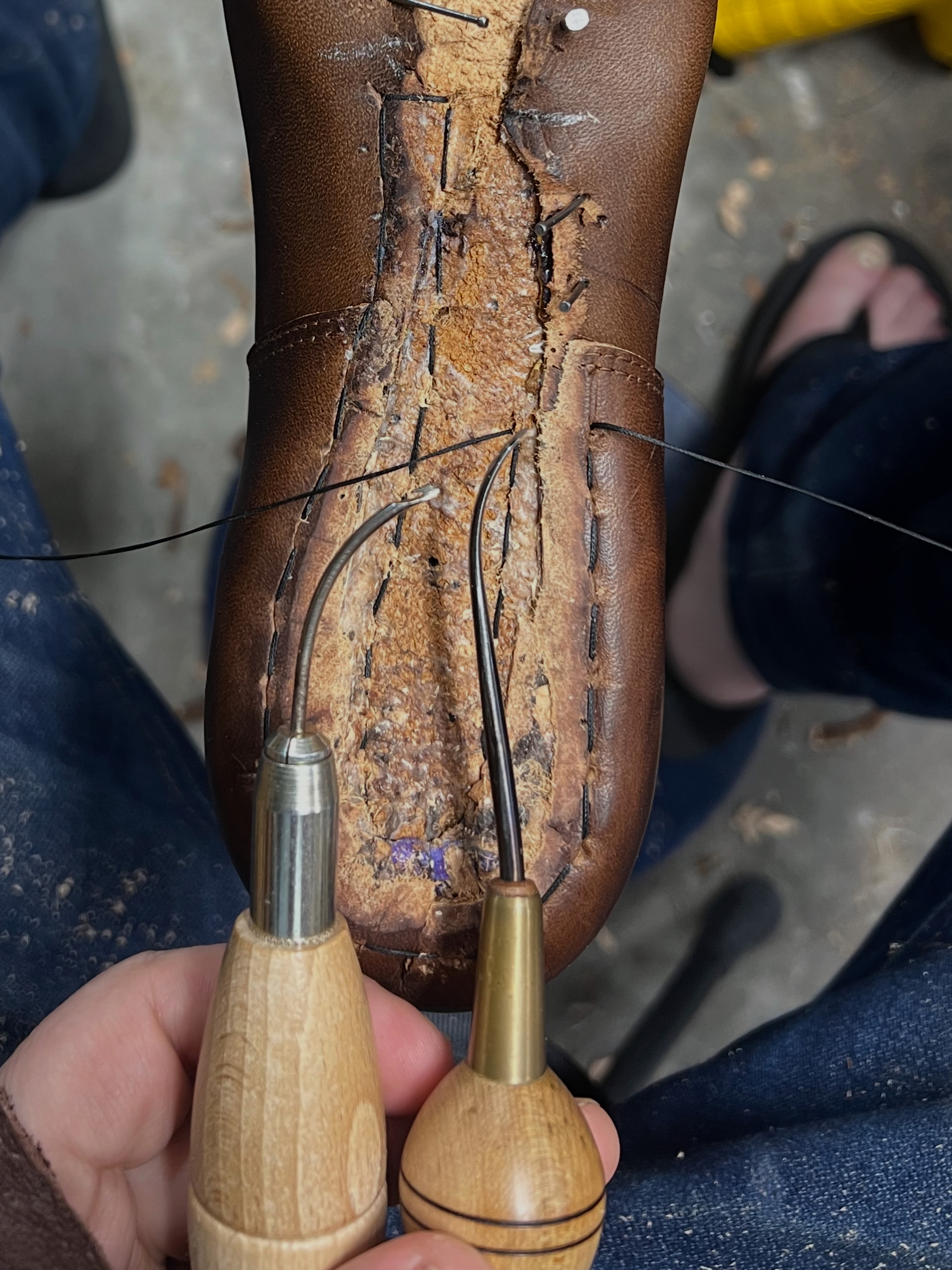 I have sewn the waist and heel seat in addition to pegs/nails a couple of times now, I just use the same carbon inseaming awl for all of it.