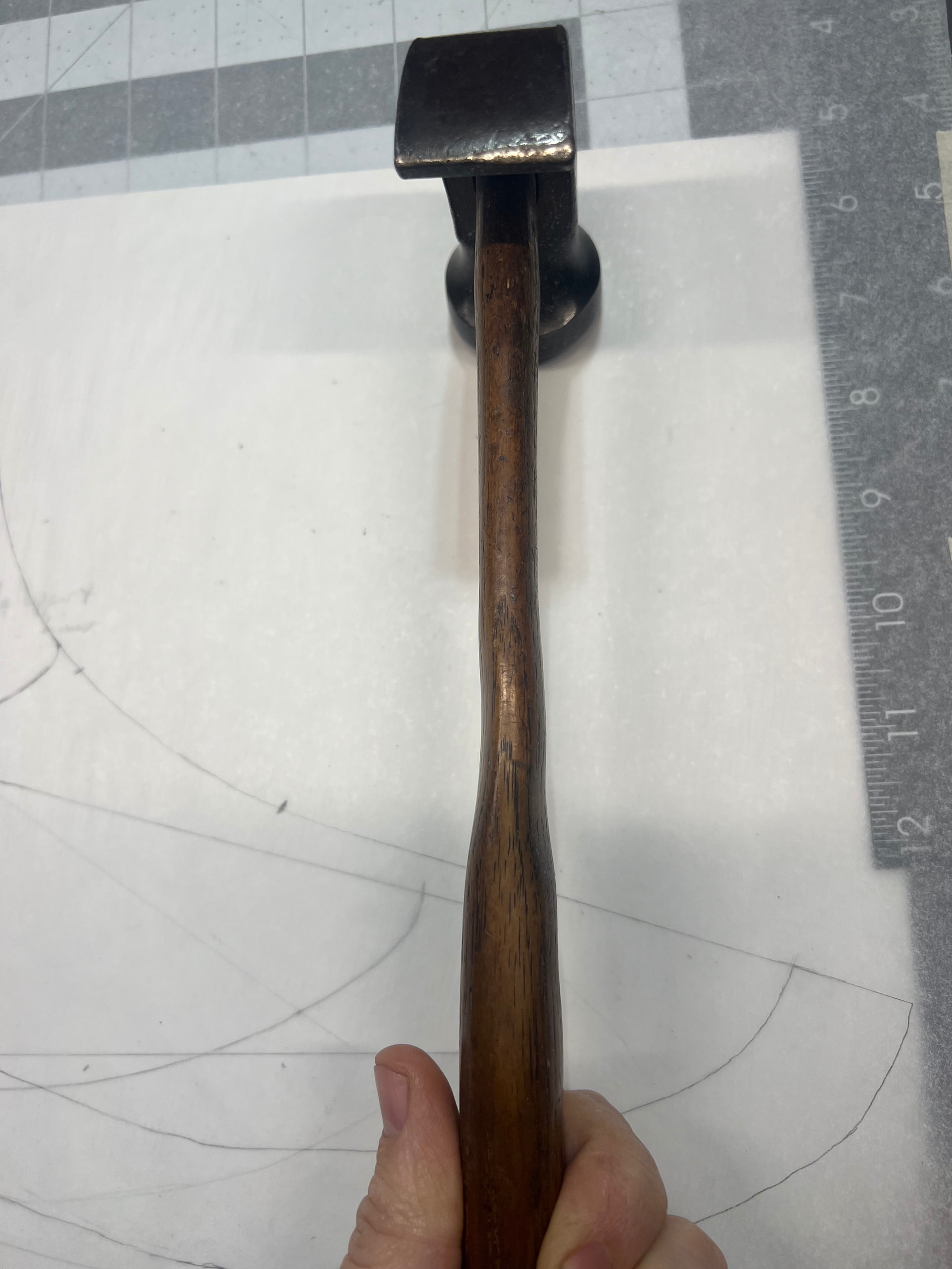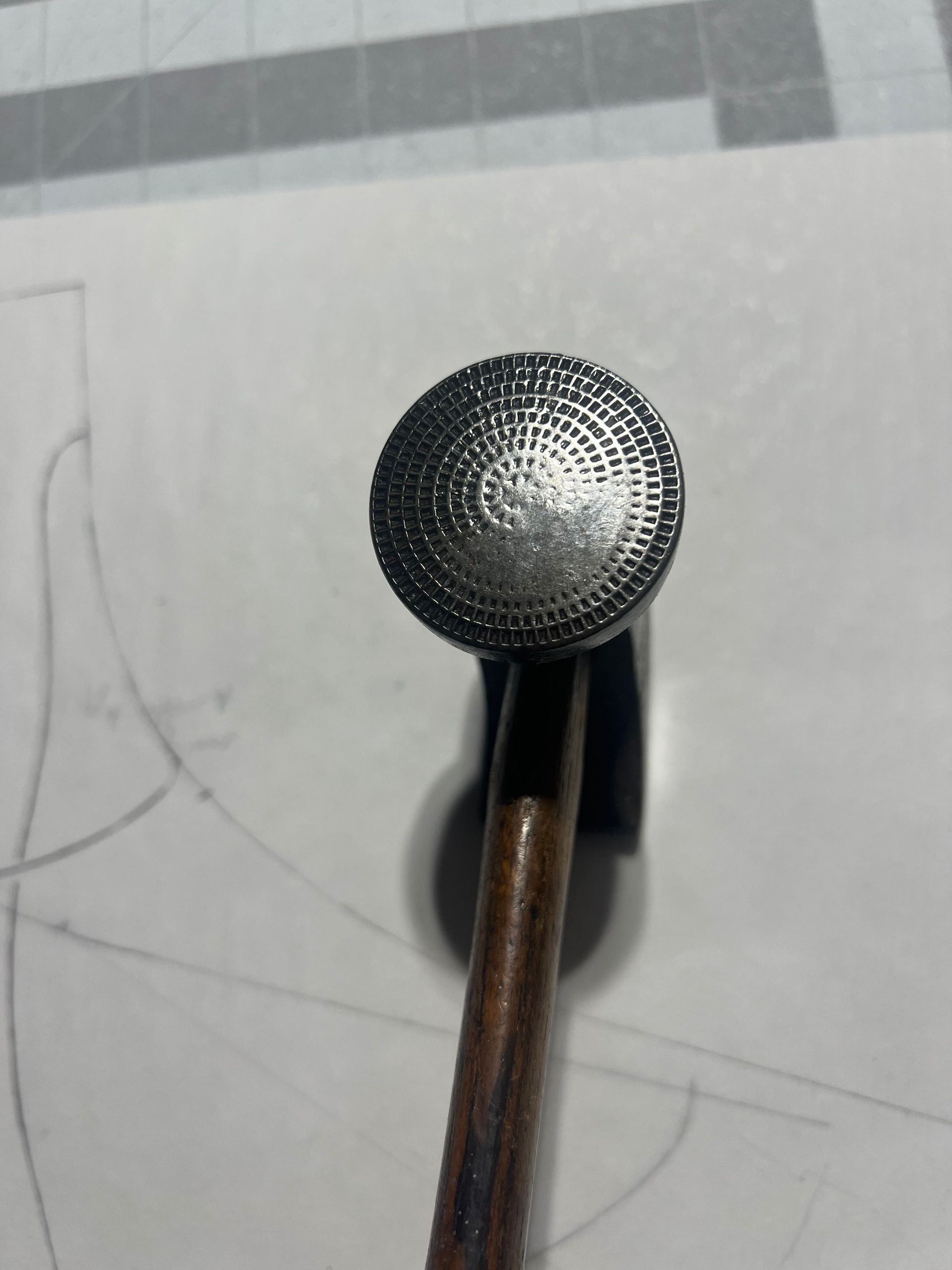 the Crispin is nice cause it has a waffle face to prevent slipping off the peg and a downward angled face (like a couple other shoe hammers) designed so that the face of the hammer is parallel to the ground when your elbow is at a right angle and the work is at your waist height (sitting with the boot in your lap or standing at a standard lasting jack). If you try to hit with it like a regular carpentry hammer you’ll kind of hold your elbow in the air and the face will strike the peg at an angle. I also find hitting the peg with the part of the face closest to you helps with a square blow. I started doing that when I saw the old pegging hammer I got from Carl Chappel’s shop had the waffle worn off the bottom of the face. (I love that hammer so much. If even has grooves from palm and fingers worn into the handle. It’s really cheating cause when you take hold of it it feels like it’s guiding you a bit. Cheesy as that sounds. )