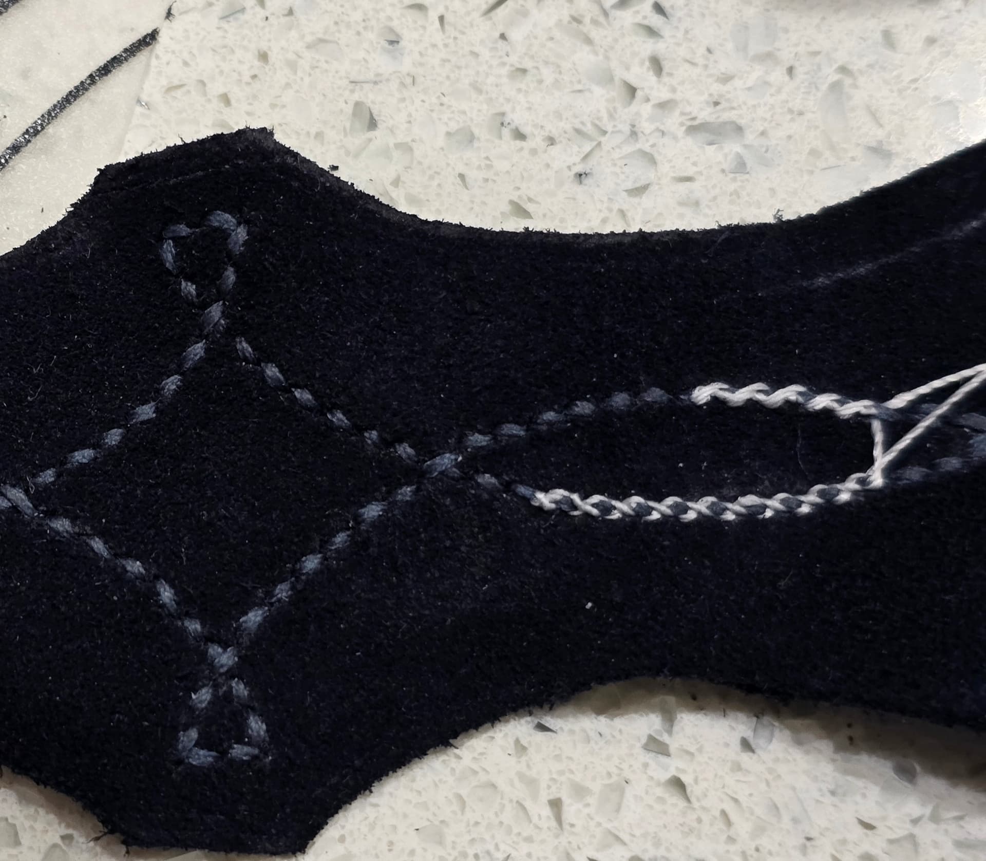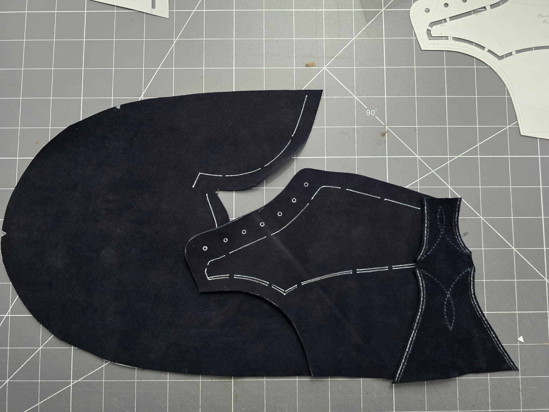 It’s the same basic pattern as my previous boots, but with a backstay instead of a french seam, a little curve added to the topline, the herringbone stitching simplified, and the counter pocket line pulled all the way up to the vamp with it defining that character line rather than it going all the way down go the sole.