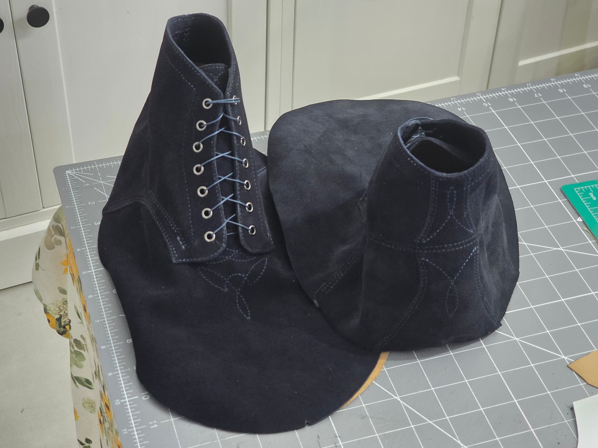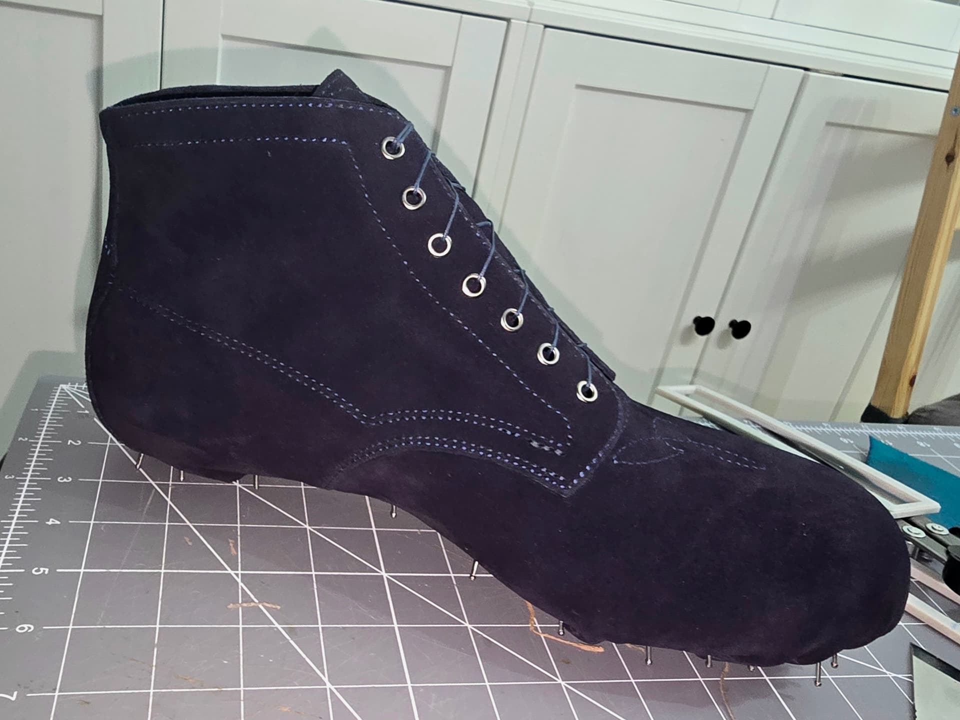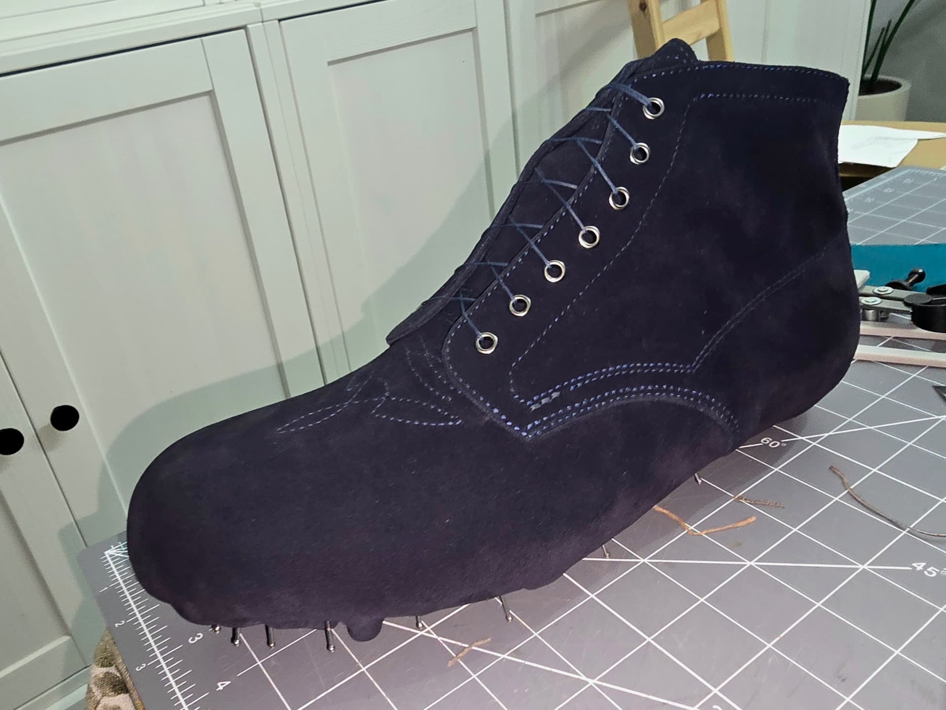 Uppers are done and ready to go. Have the insoles wrapped and forming to the lasts. Probably pre-last this weekend, although with this suede, i don’t know there’s much point to prelasting