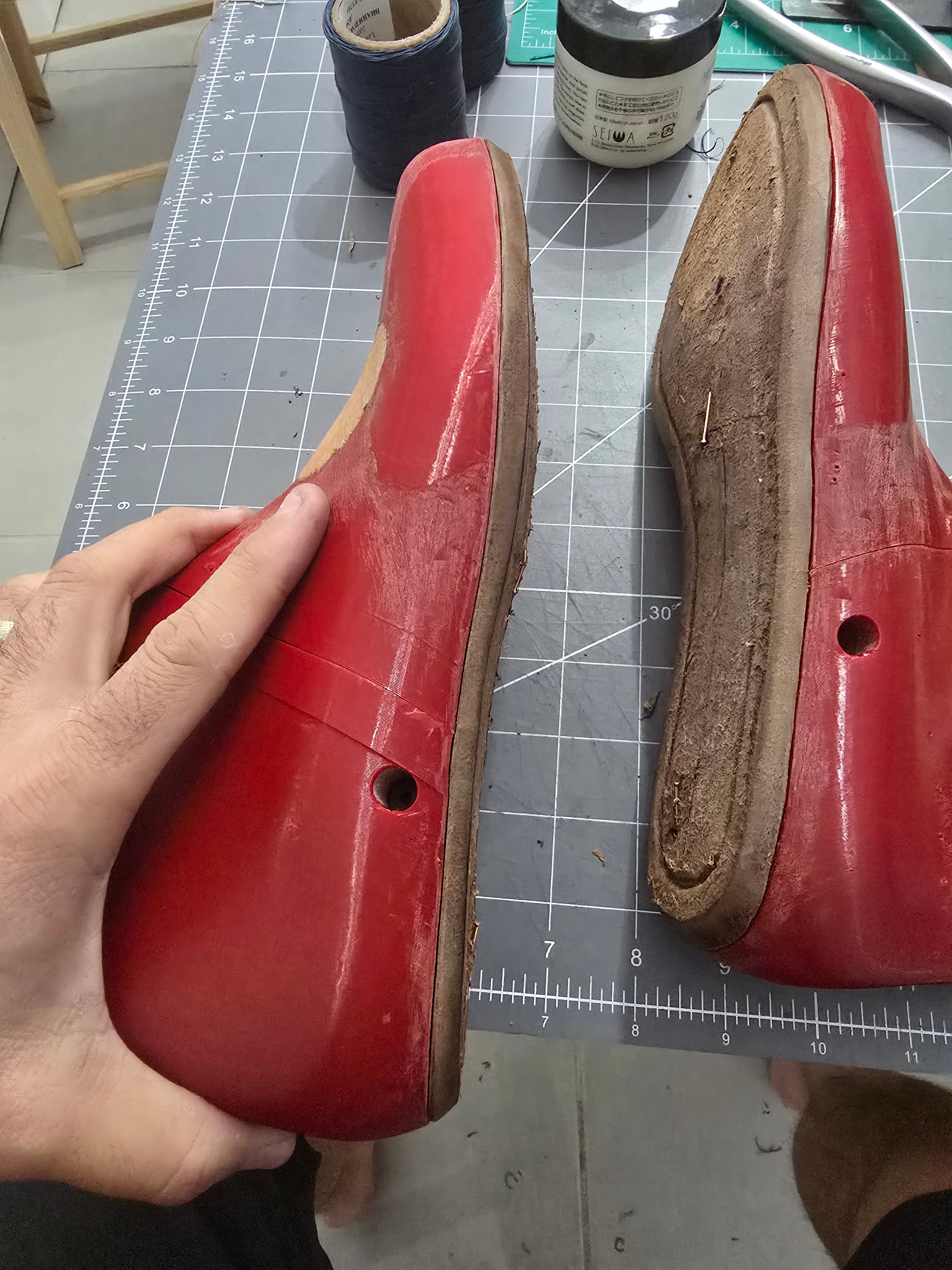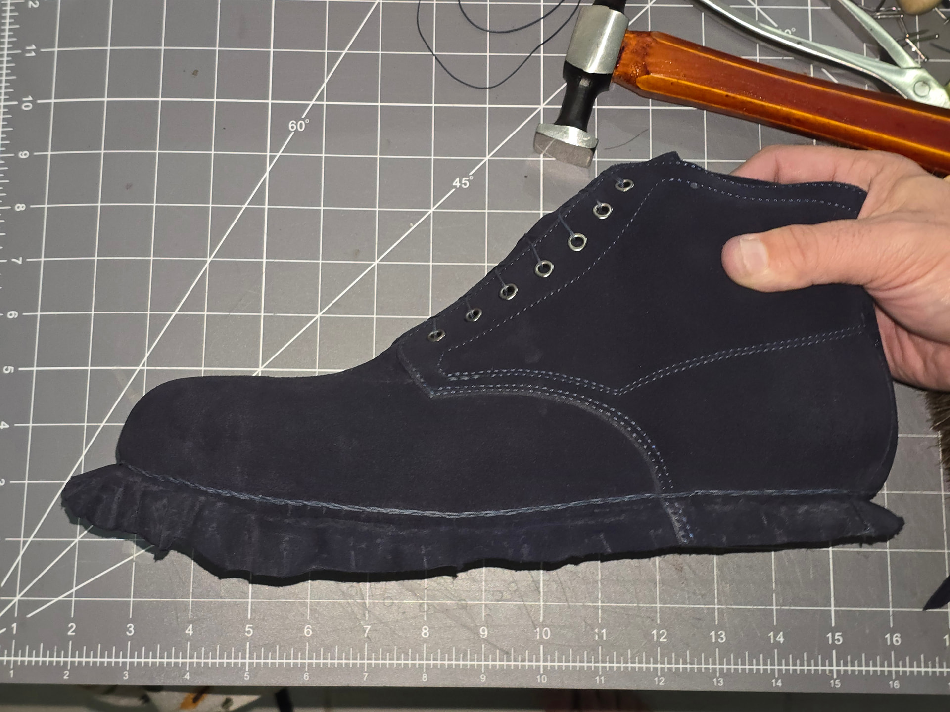 One of the things I wanted to try on these is to do a stitchdown-based construction without the visual bulk in the soles. The info I have seen on norvegese builds usually suggests a vertical sidewall on the insole, which I am sure helps make the chain stitch pop, but it seemed like one could really use the side stitching to pull the upper in really tight on a stitchdown to get closer to the silhouette of hand-welting.