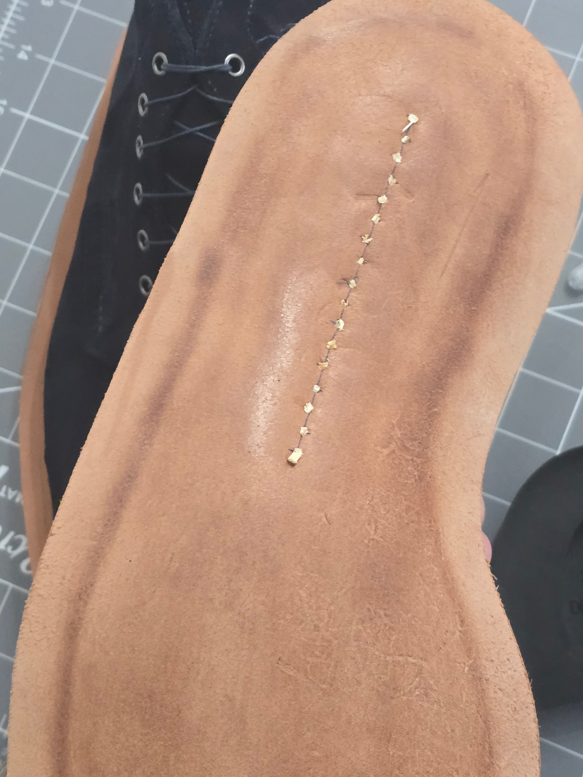 Midsole in place and about ready to start stitching. I pegged through the midsole into the shank in-between the previously placed pegs with every other one at opposite angles