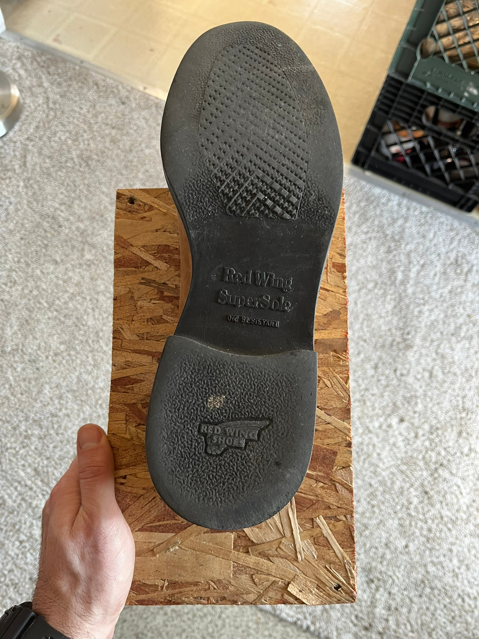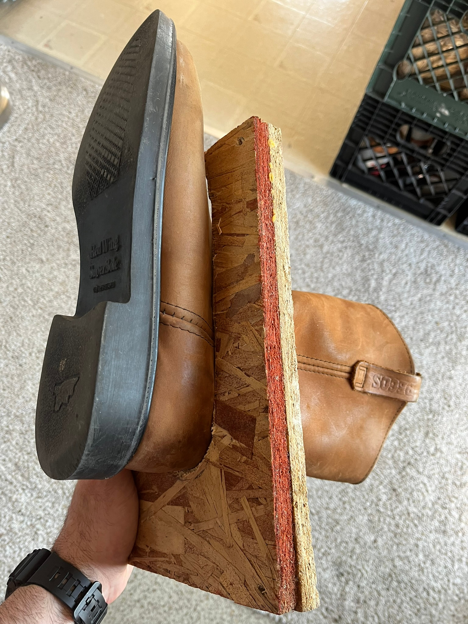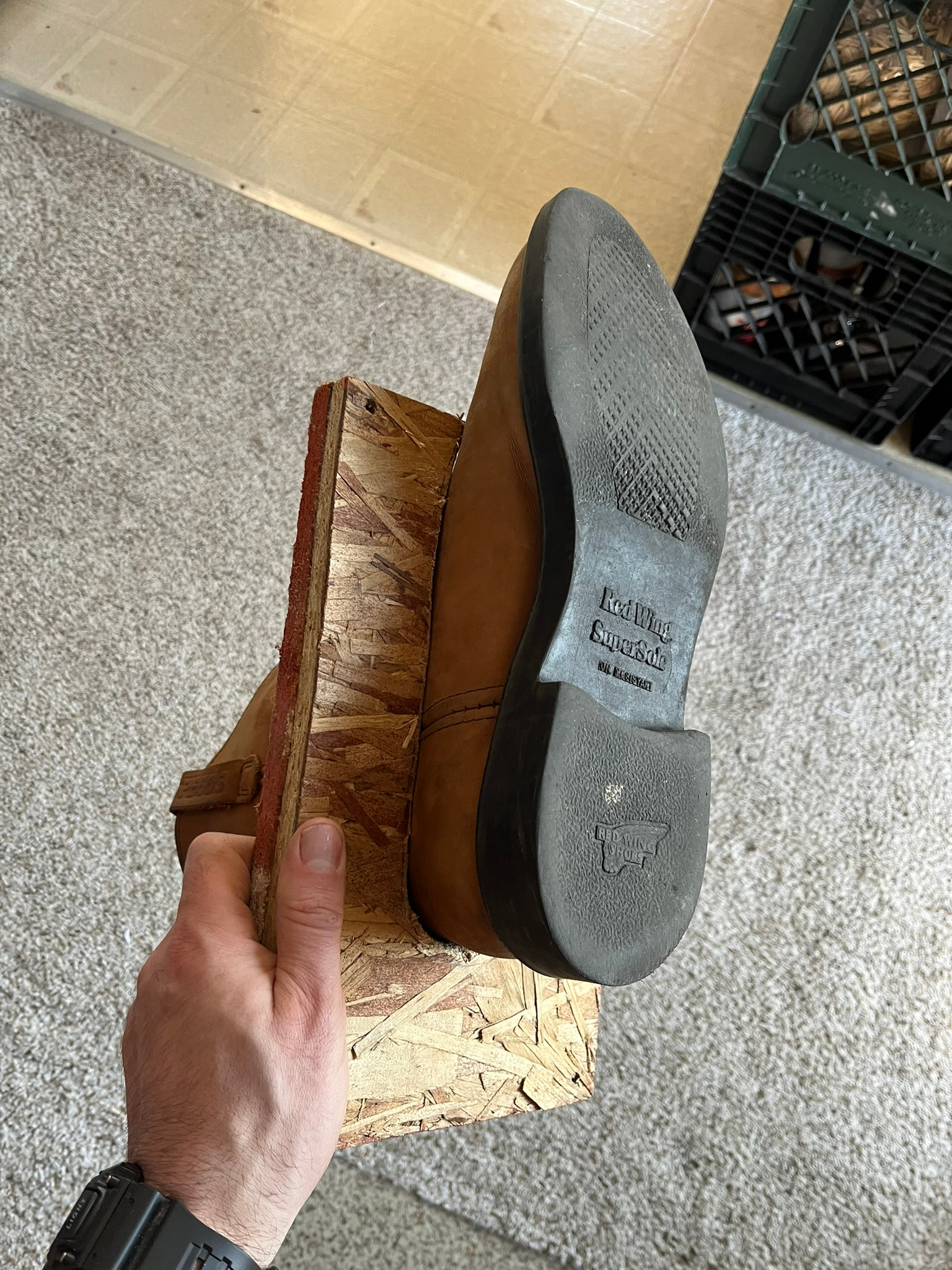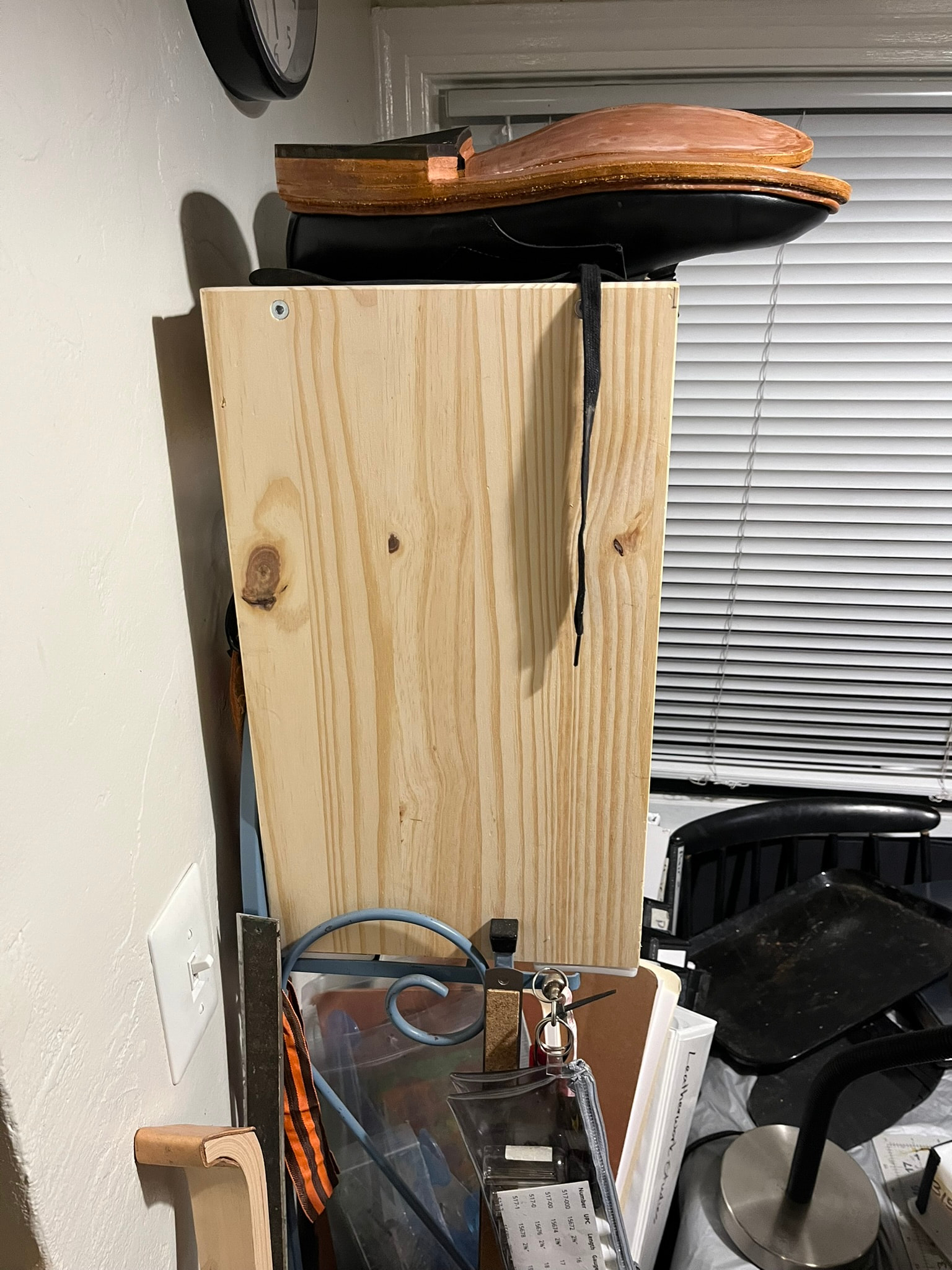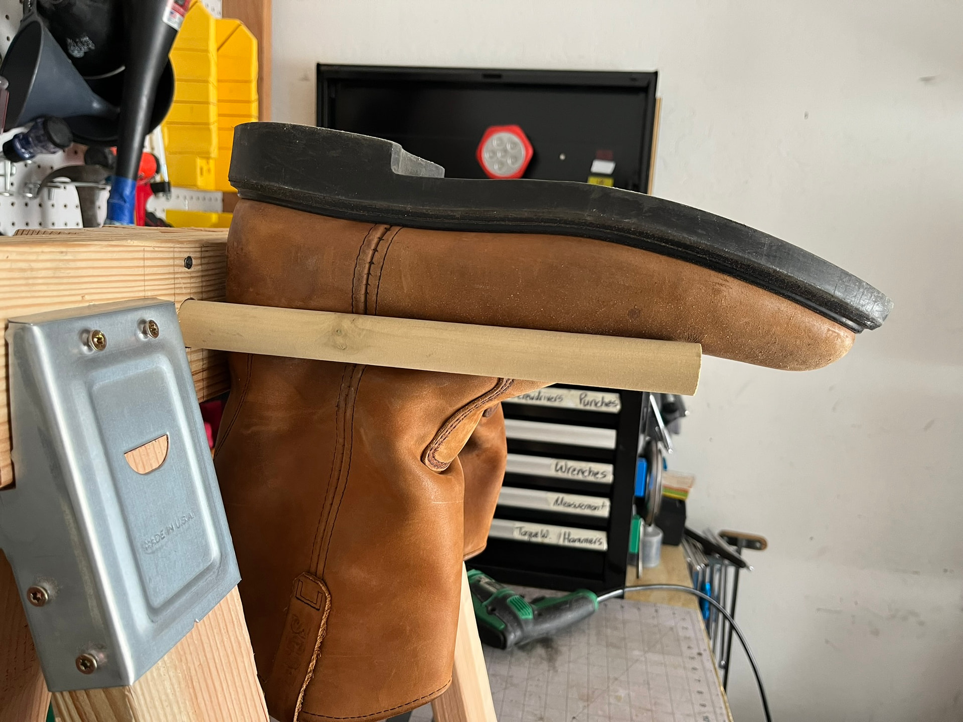I recently had a bit of damage on a pair from setting it down while working and having it fall down and hit the ground. I’ve mostly just been keeping projects on plastic lunch trays laid on shelves so far, so this was a good prompt to finally figure out a better storage solution for shoes and boots in progress.
