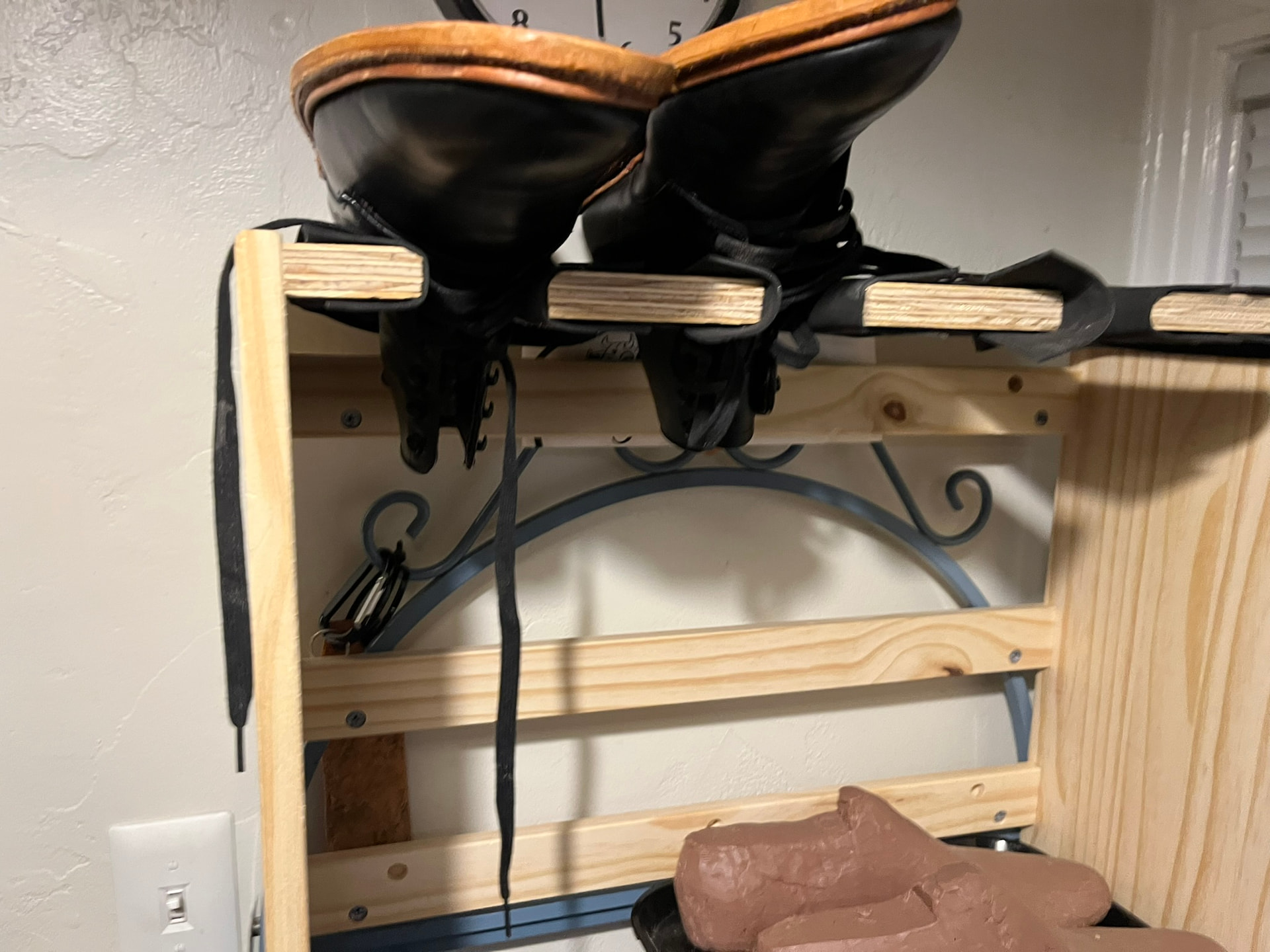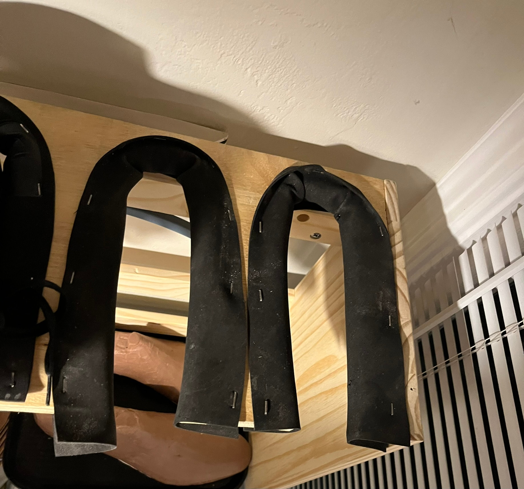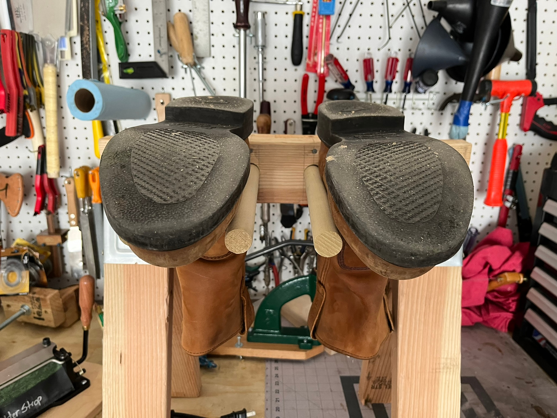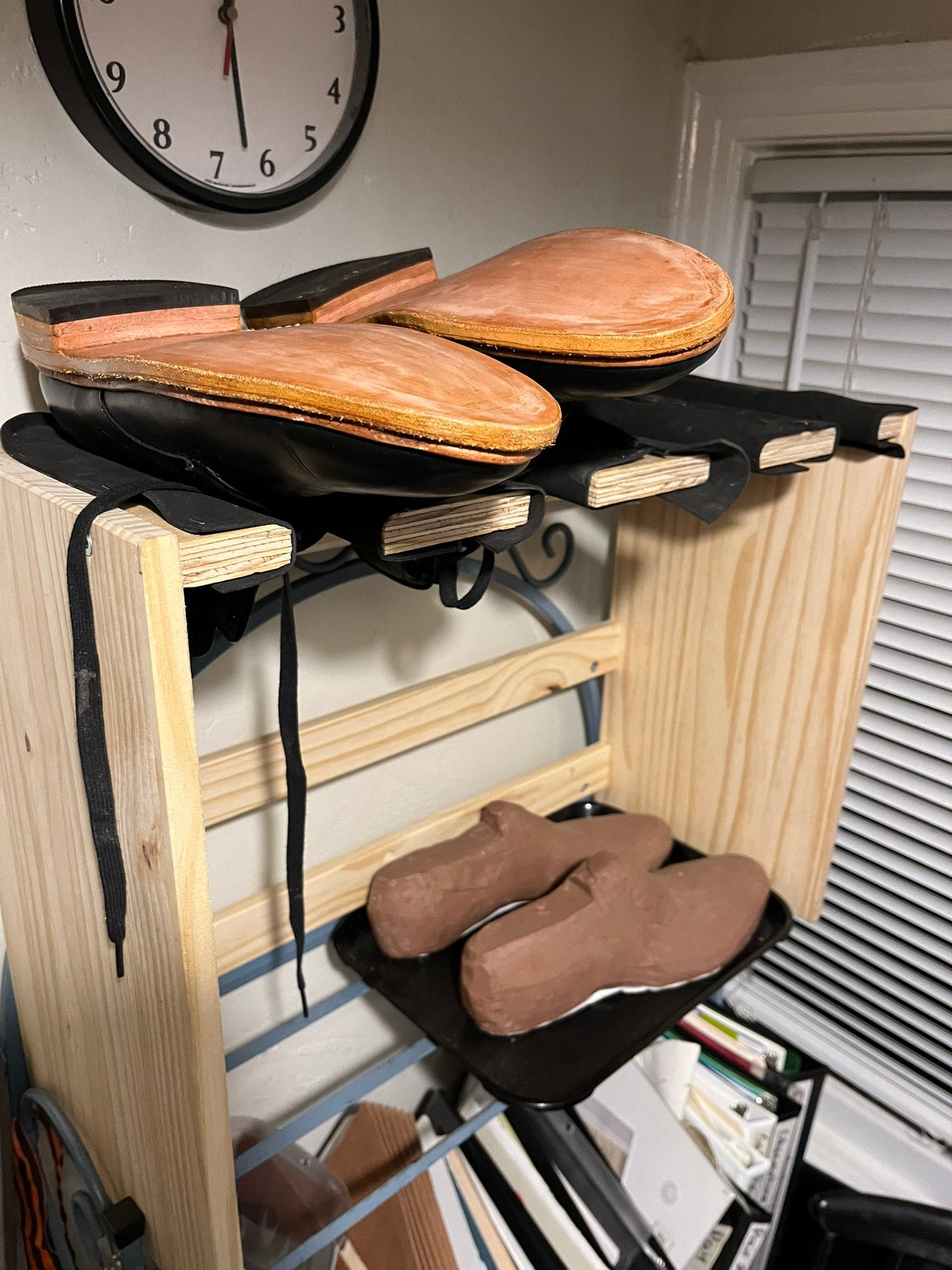 Most of the racks I’ve seen in factory and shop photos are true “pin racks”, basically shelves with rows of thick bars or dowels between which you can hang shoes upside down. There are also some domestic products built like this, often marketed for mudrooms, hanging gaiters, and the like: