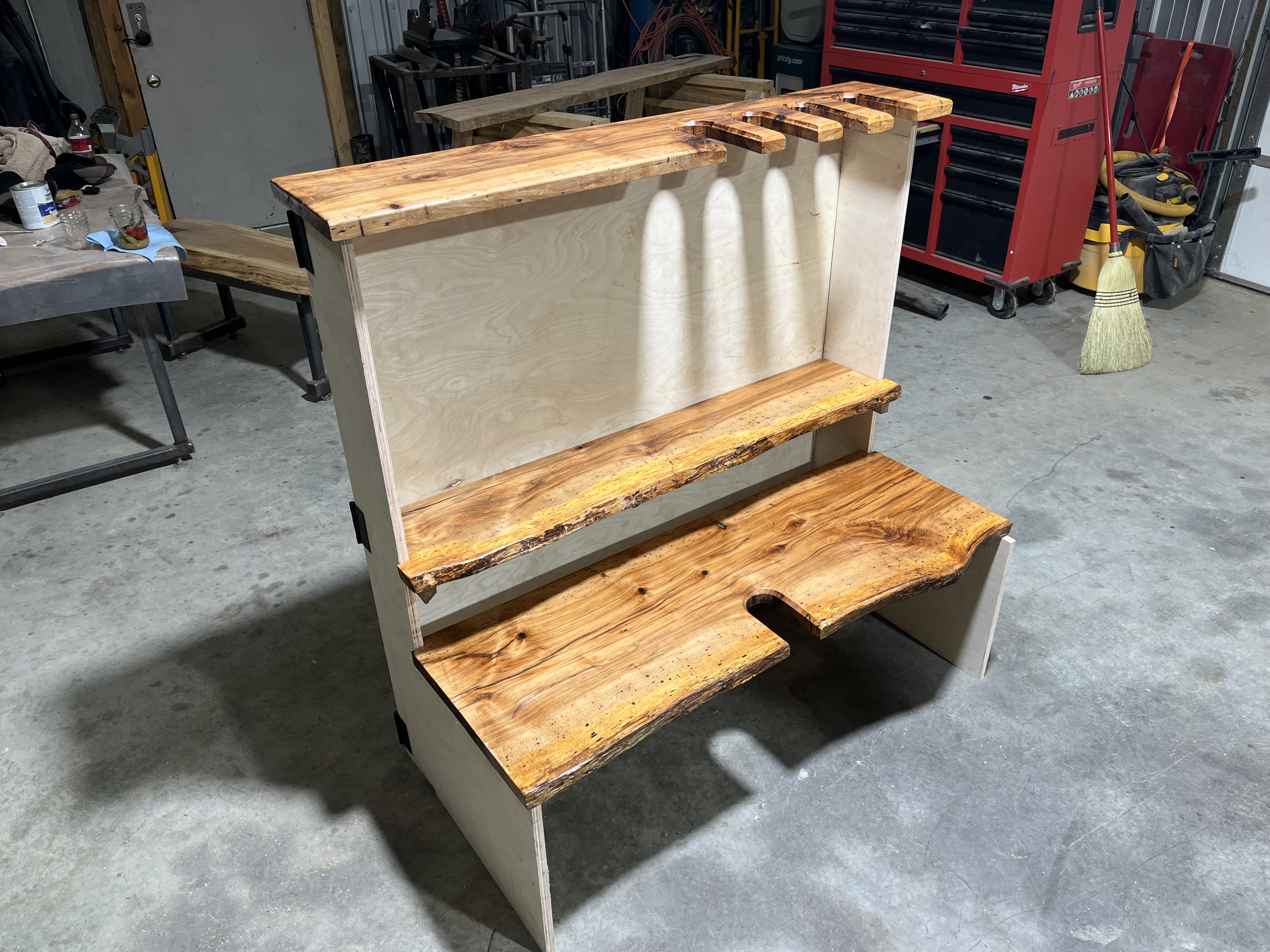 After doing all kinds of arm contortions to keep lasts from sliding up and out while lasting heel seats, I finally got around to building my first lapjack—basically a last pin set in the top of a stick tall enough hold between the legs while seated. My direct inspiration was D.W. Frommer II’s Western Packers book, where he mentions the tool and gives a rough plan.