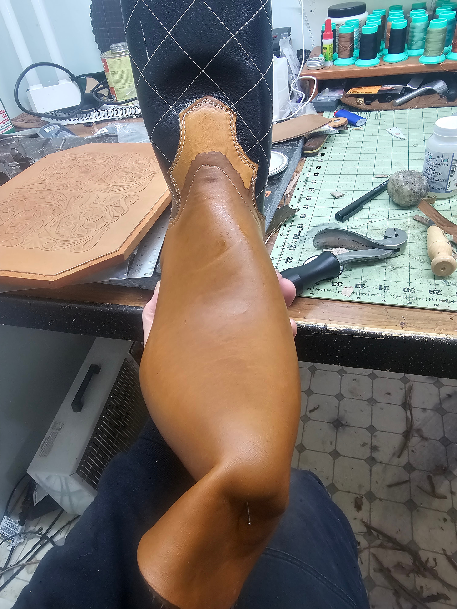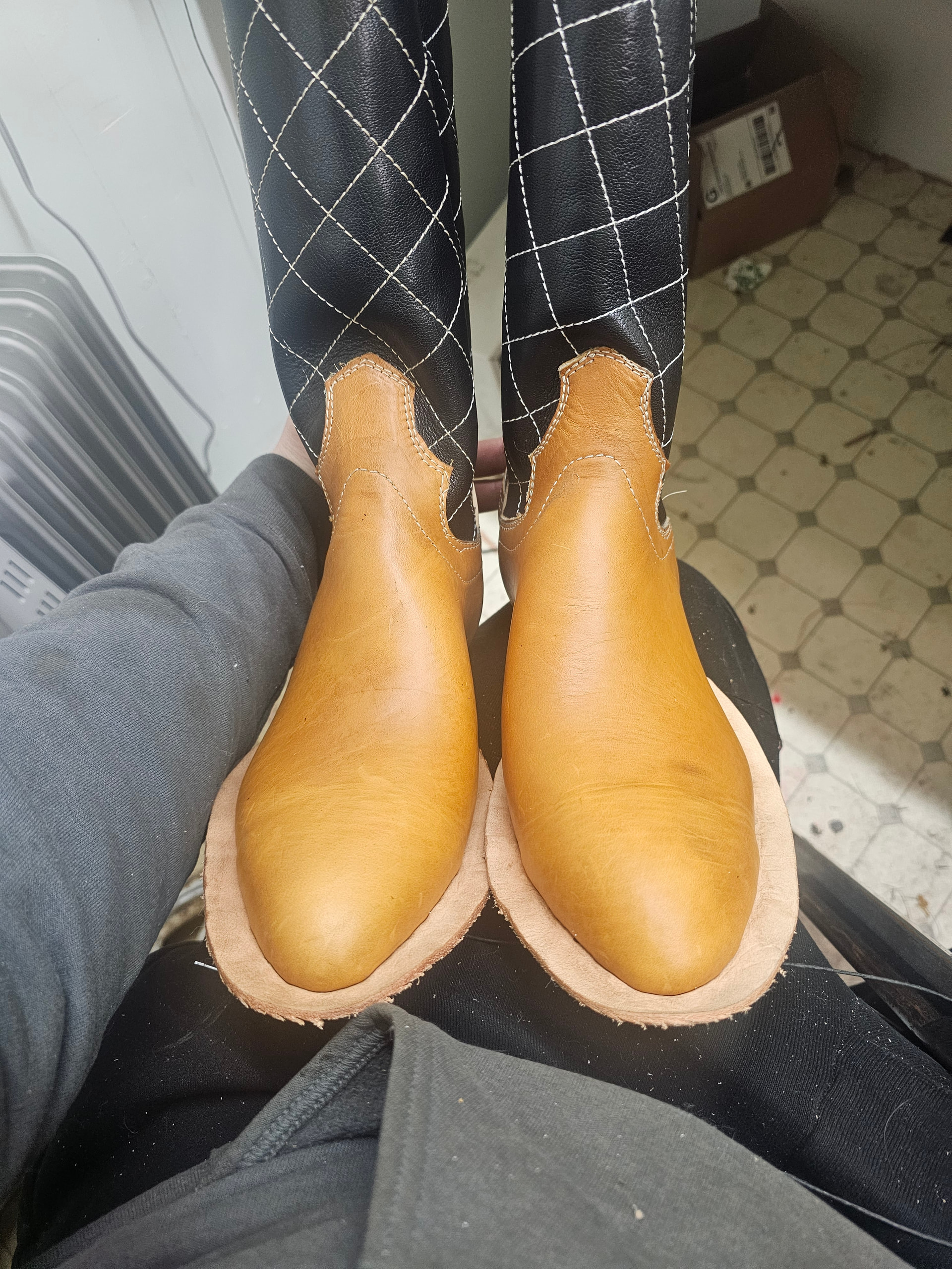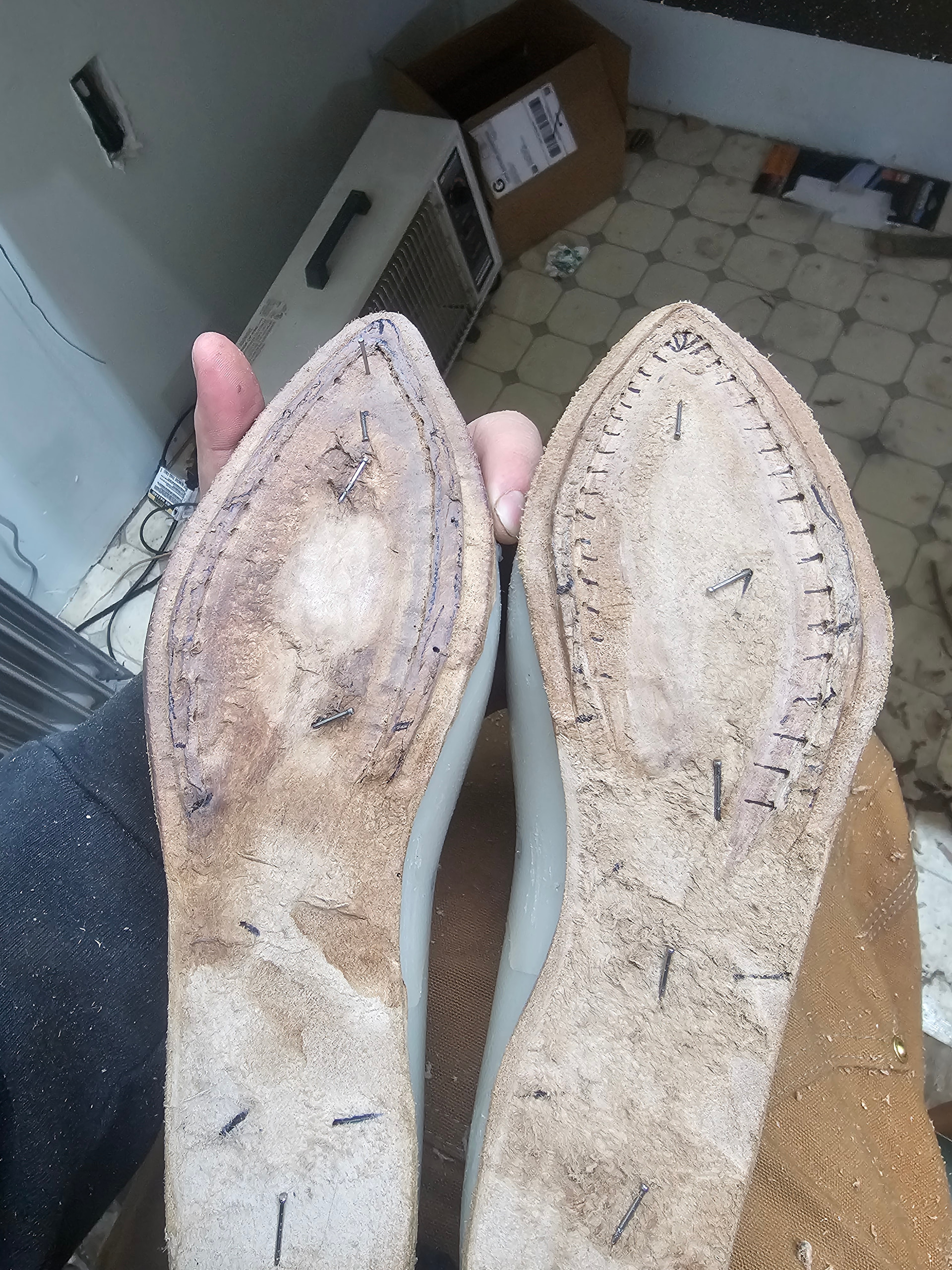 First time doing a leather toebox, and found put after lasting the toe on the first boot, that i needed to feather my transitions more heavily, and it went significantly better on the 2nd boot.