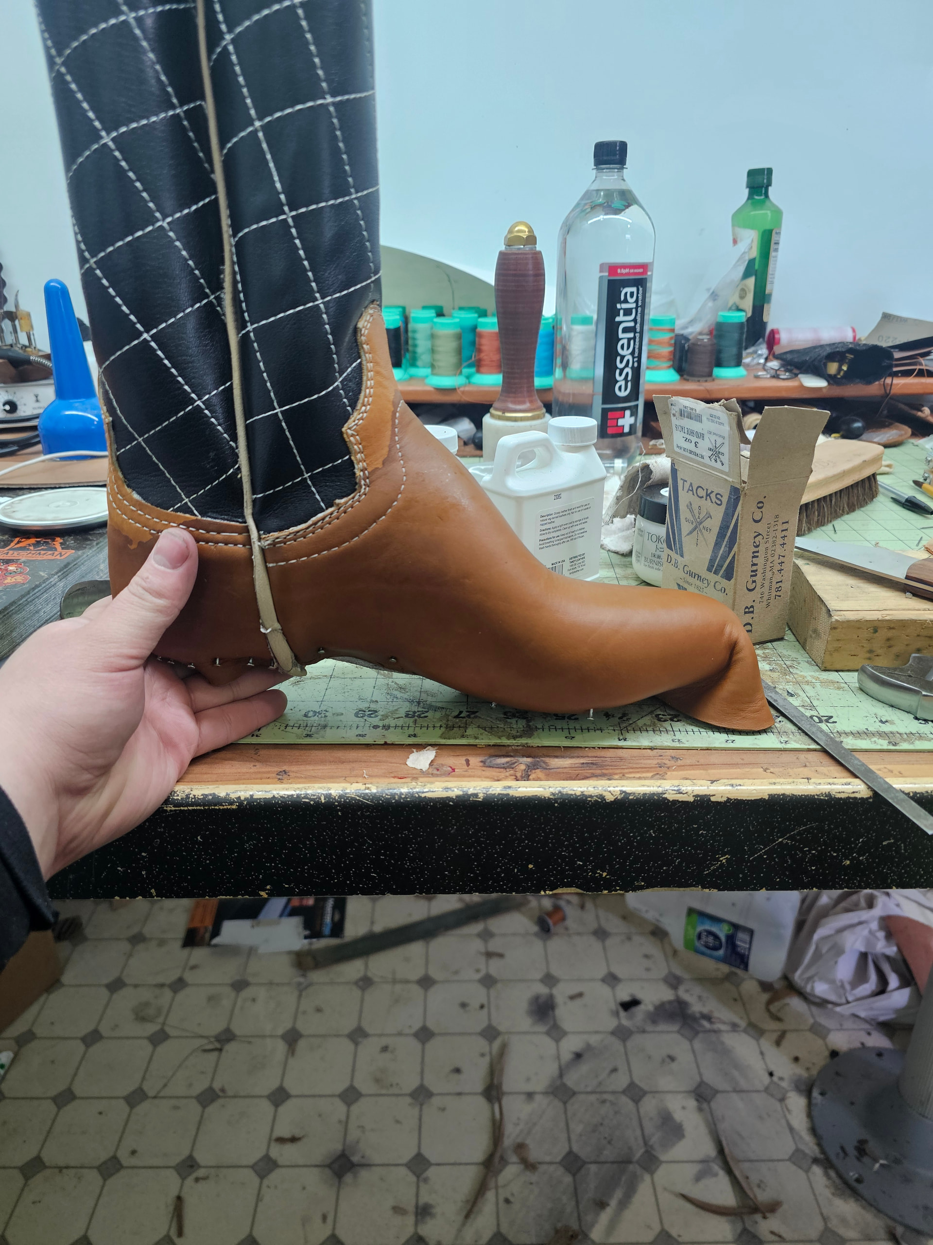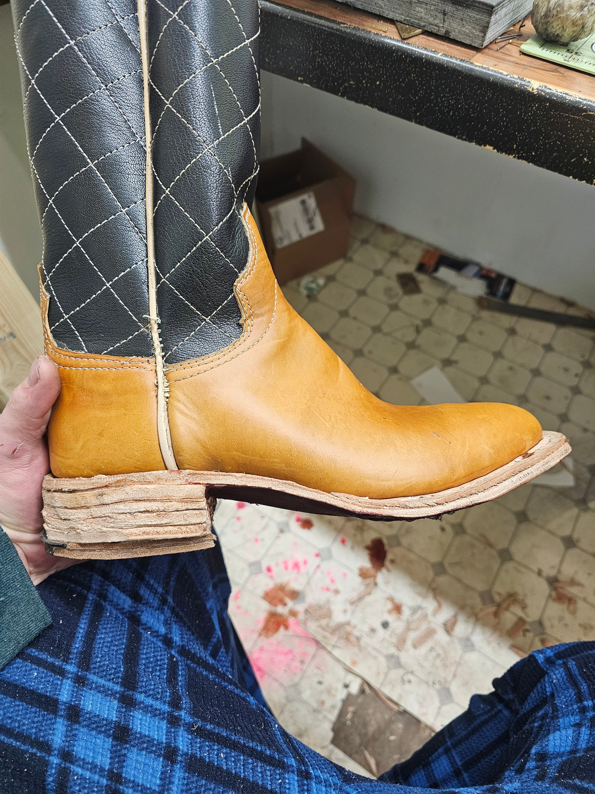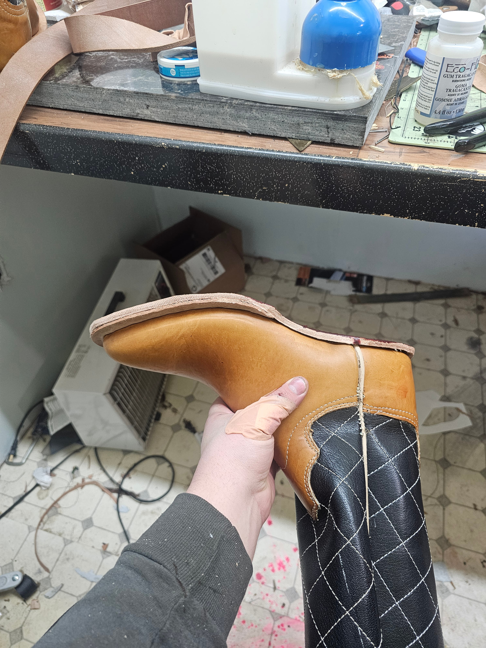 Boots are welted, shanks covers are cemented on and pegged, and We’ve got one sole on.