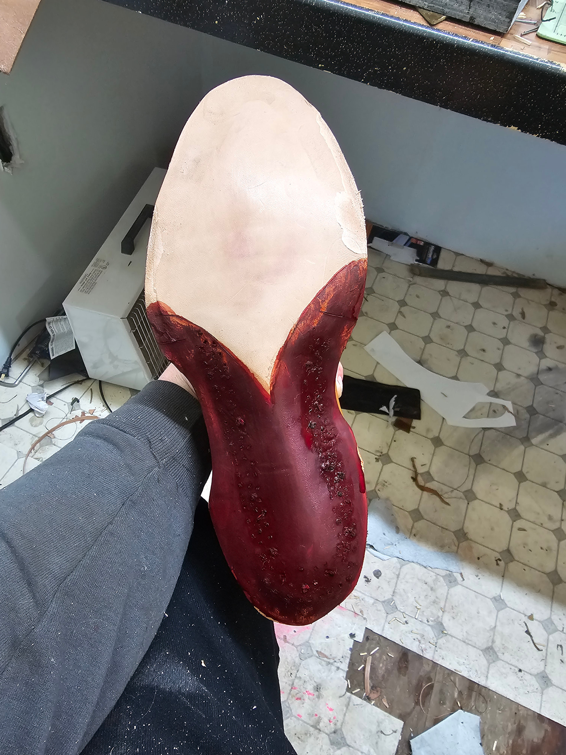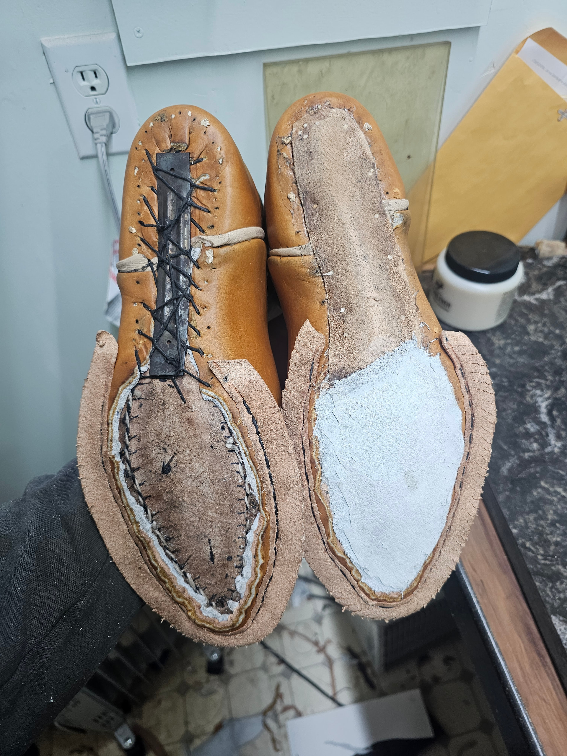 I certainly didnt temper the first sole as well as i should have, as i was able to peg just about right away. I was going to leave the soles entirely natural on this pair, but I slipped with an objectively scary sharp knife cutting my blind stitch, and I figured a dyed shank and heel seat would be more appealing than one that looks like a grisly modern art piece. Gotta do a little more layout and tape the forefoot on the sole to sand the shank area and smooth my heel base; But otherwise, im very happy with how these have gone so far.