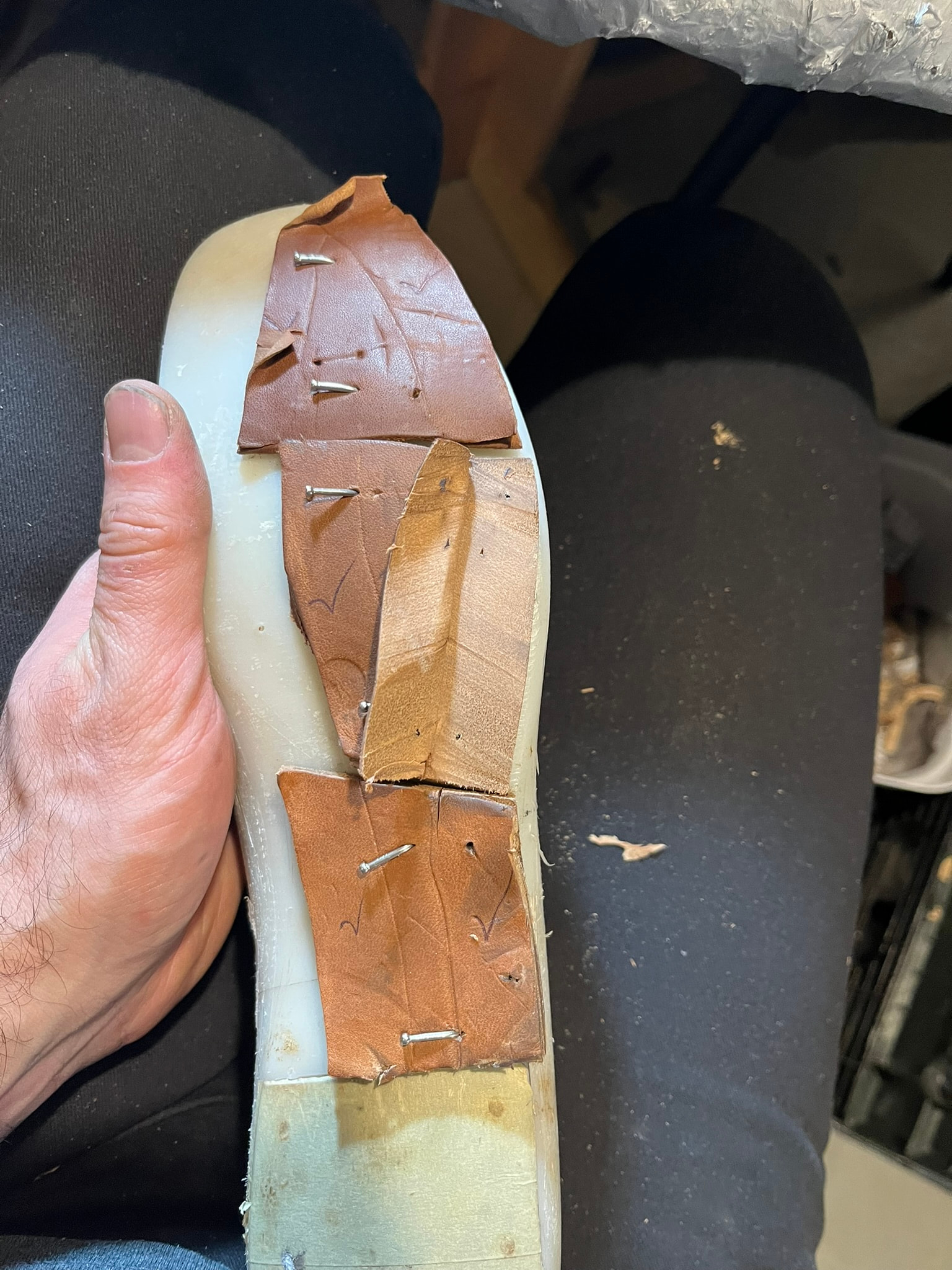 - Trim the pieces up to roughly cover the shank and forepart of a last I had.