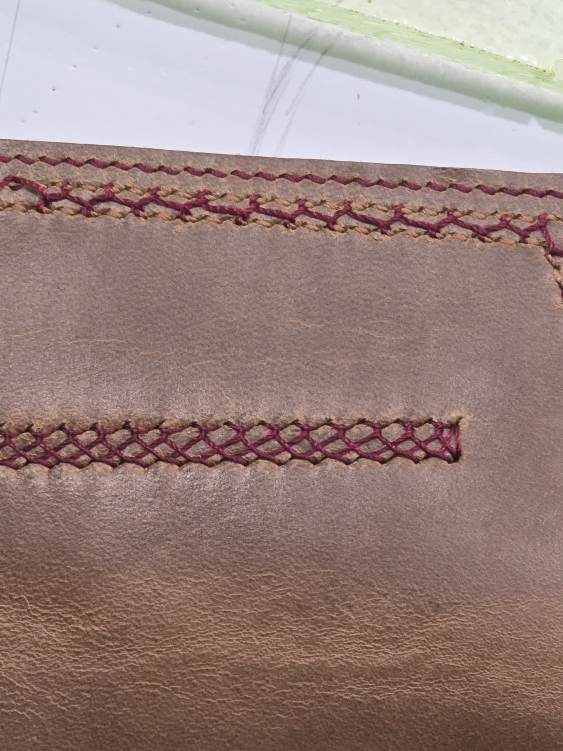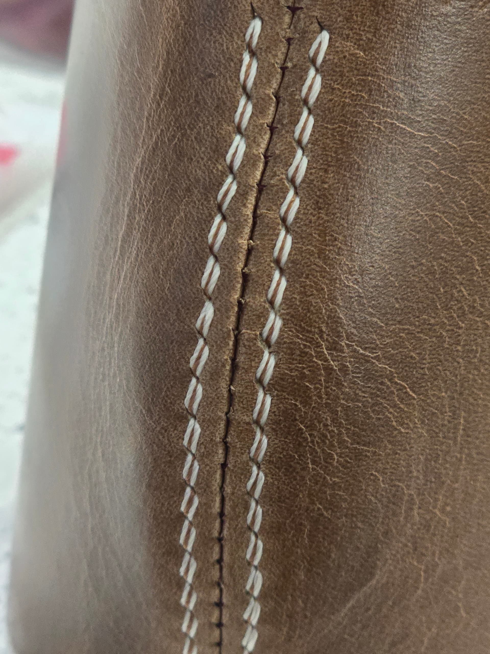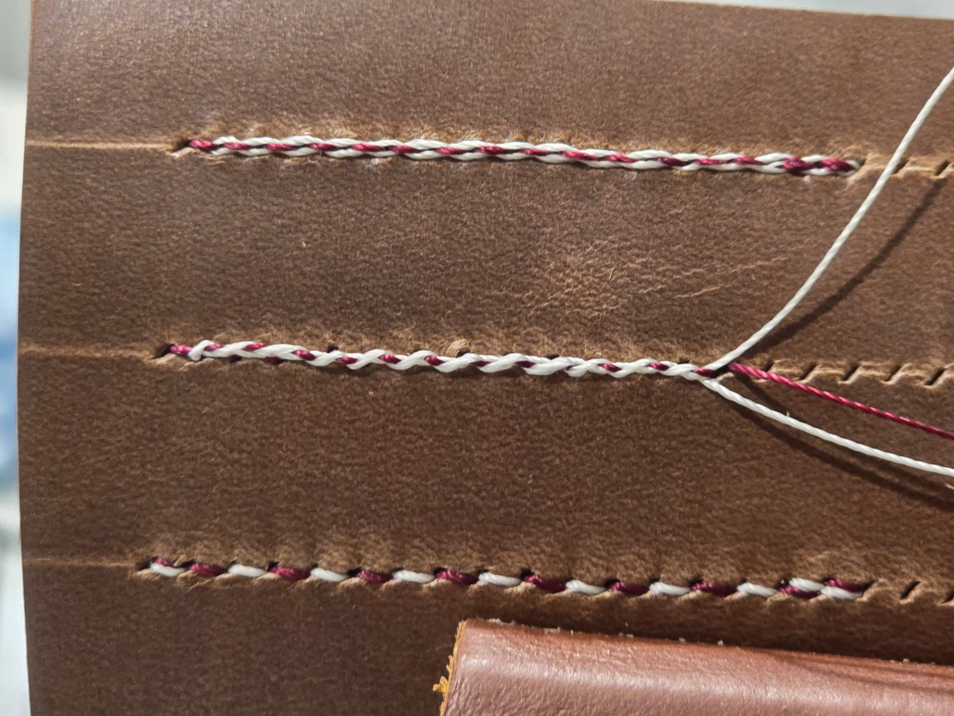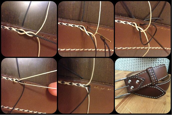 - saddle stitch with different color threads, top and bottom