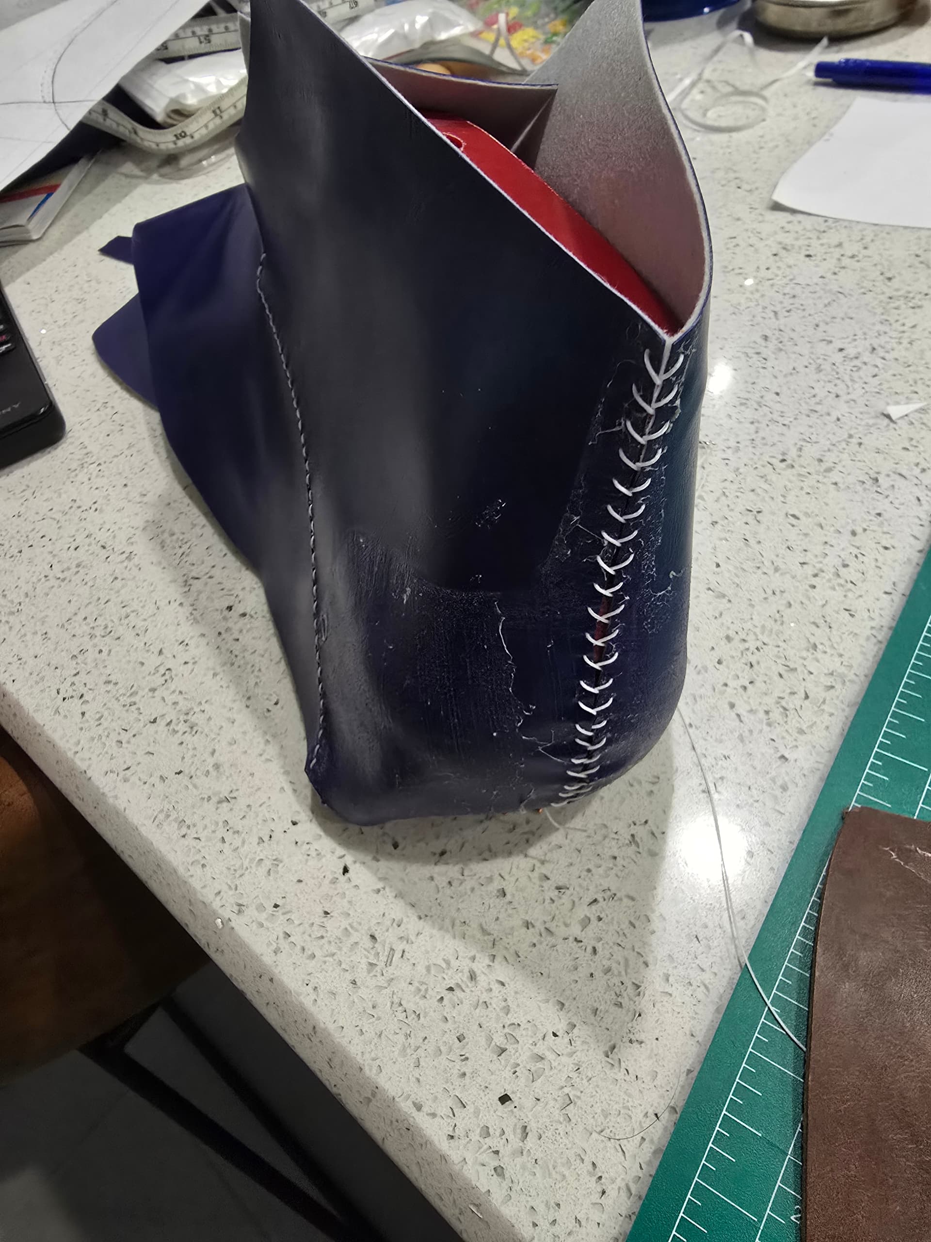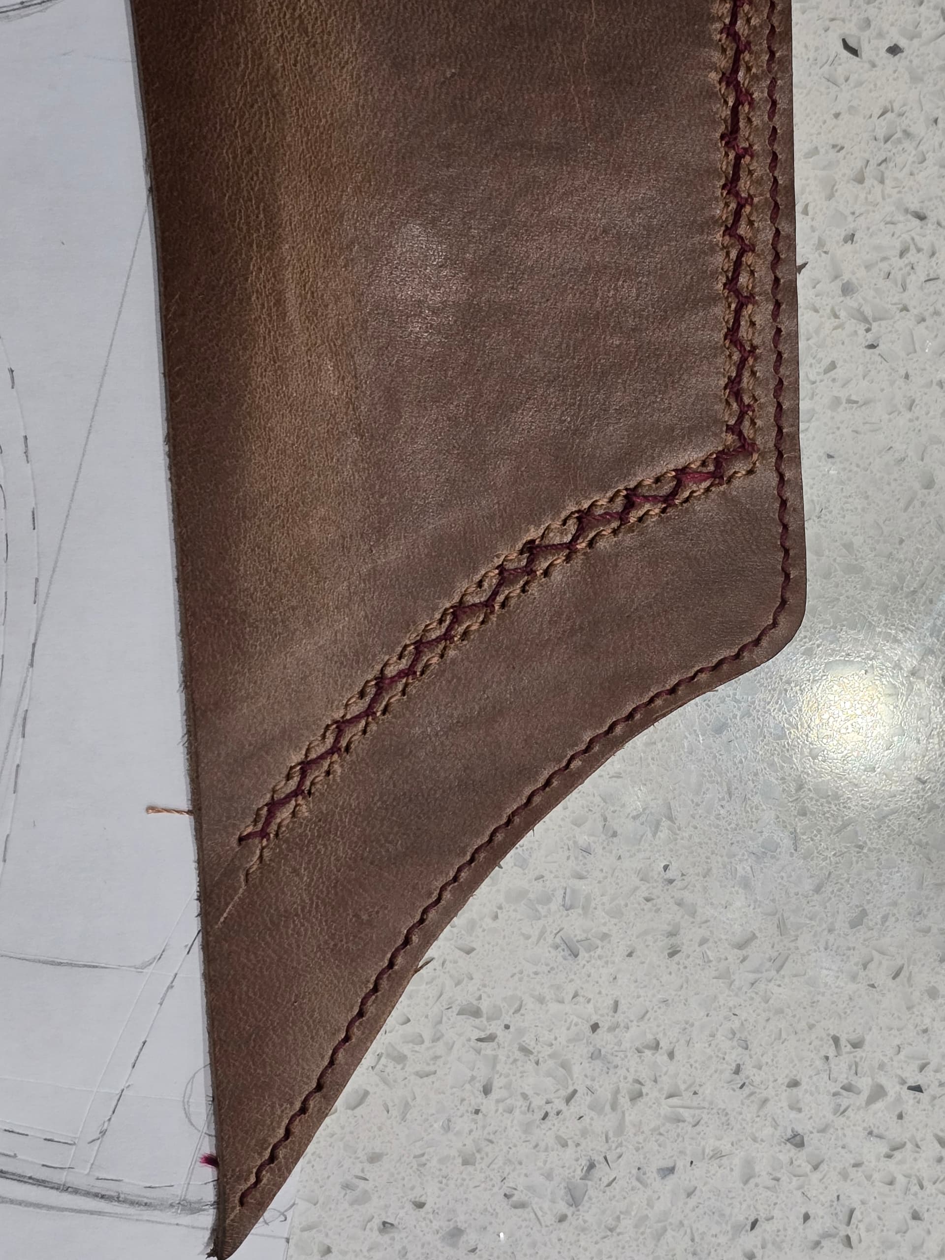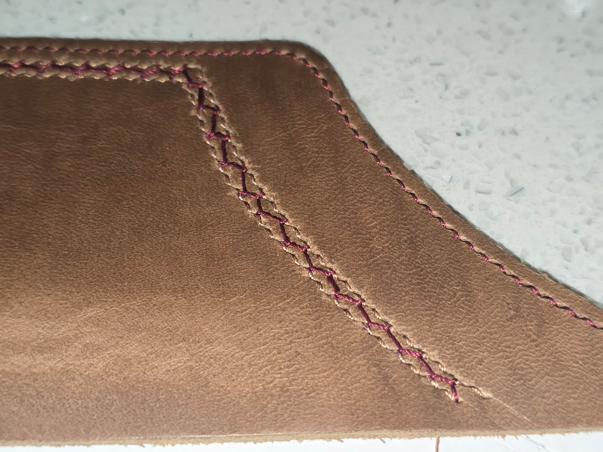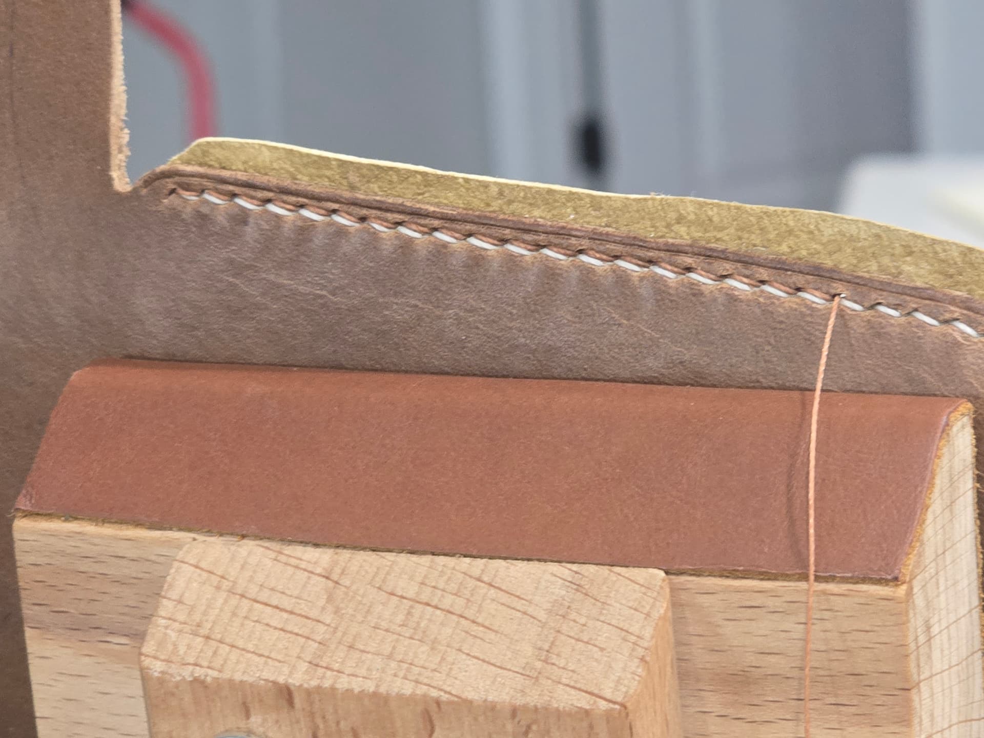- saddle stitch with different color threads, top and bottom