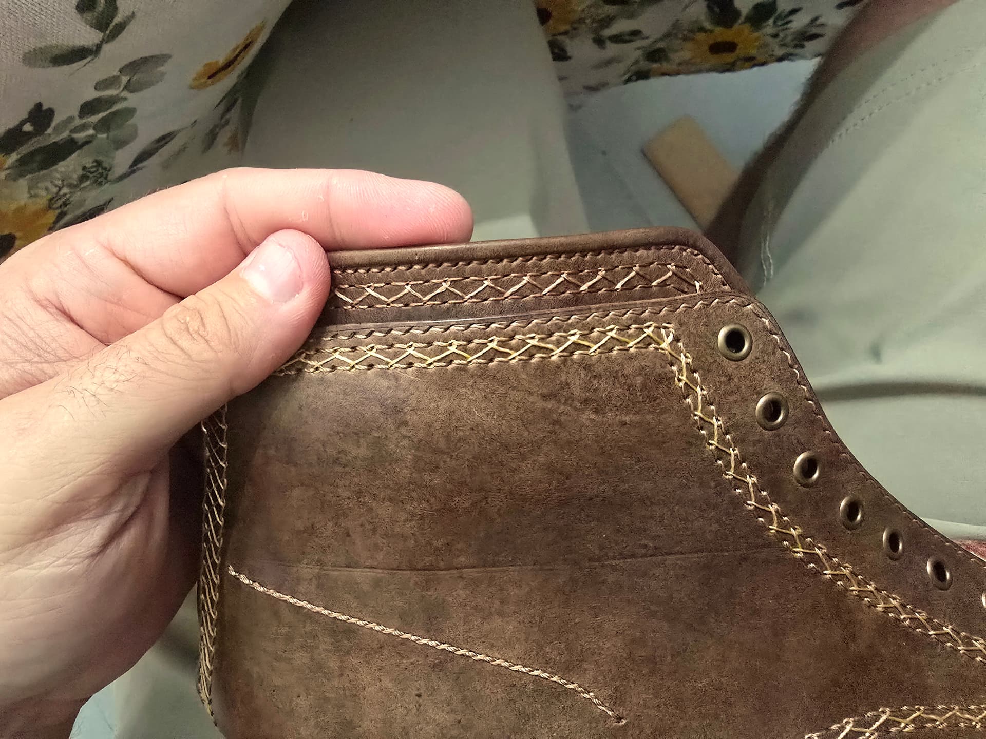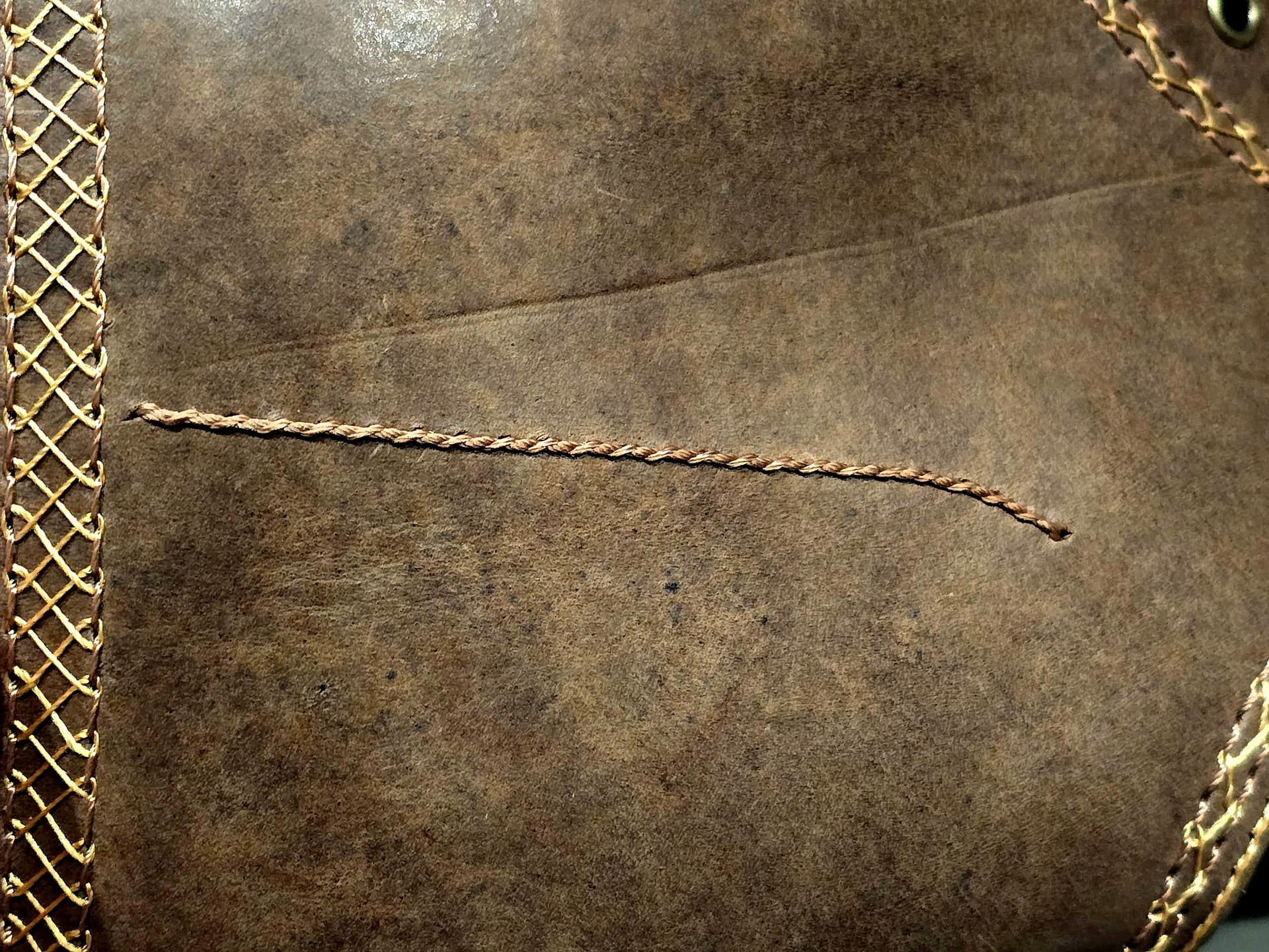The gold thread definitely doesnt help here. It’s too similar to the leather color that it loses definition but not contrasty enough to stand out.