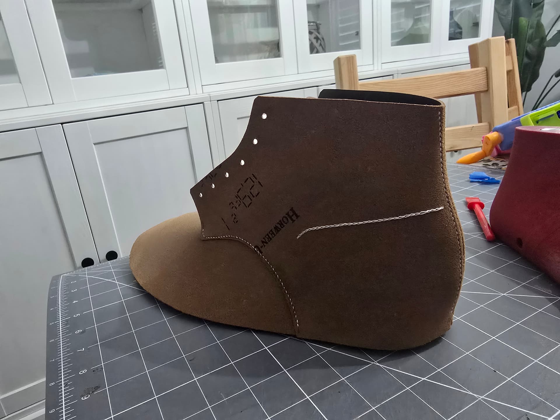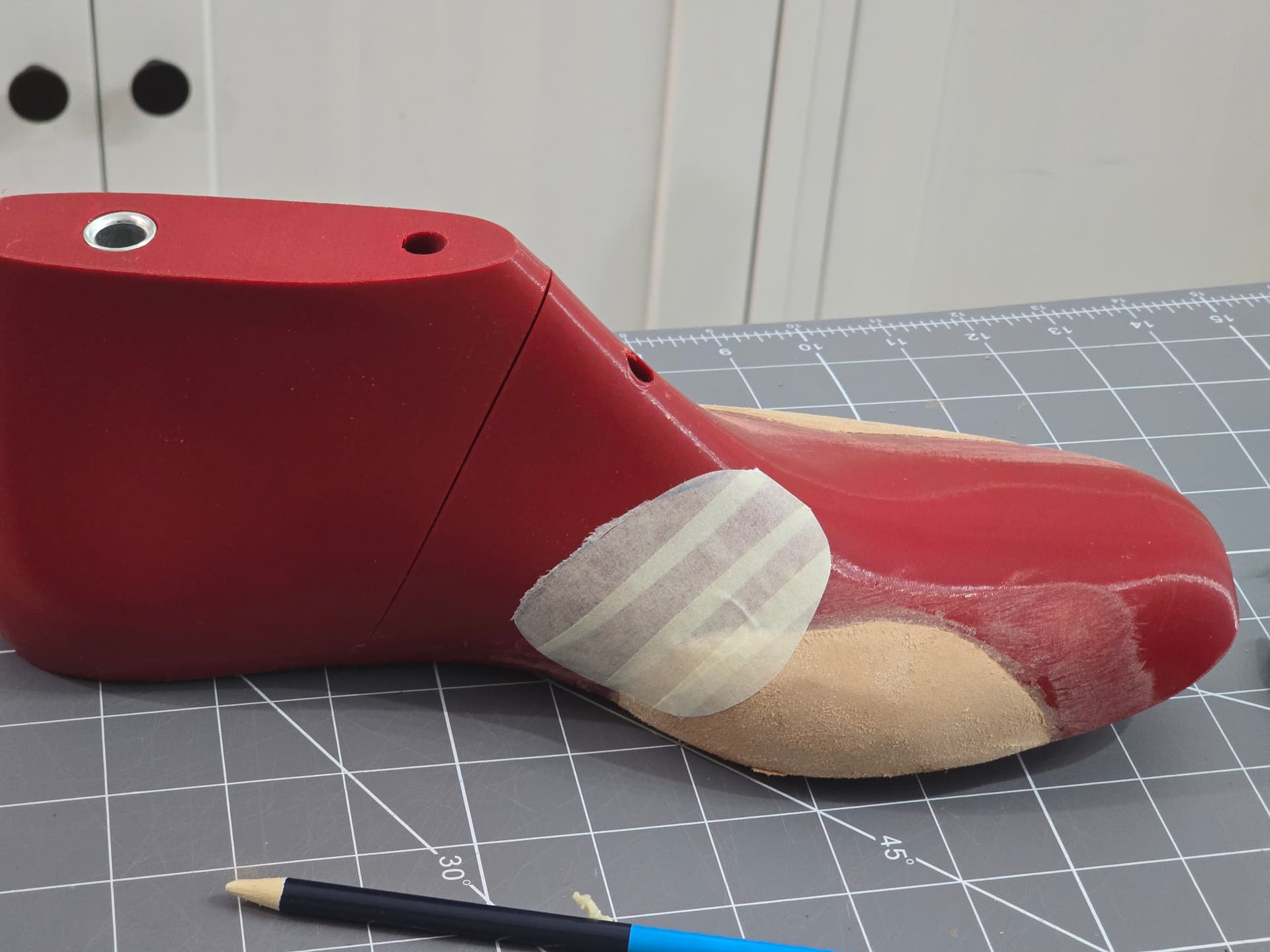 My first test fit mockup felt too narrow. After measuring again against my last, my ball girth was about 5 mm too small. So I added some material on both sides of the last at the ball line to make up the difference