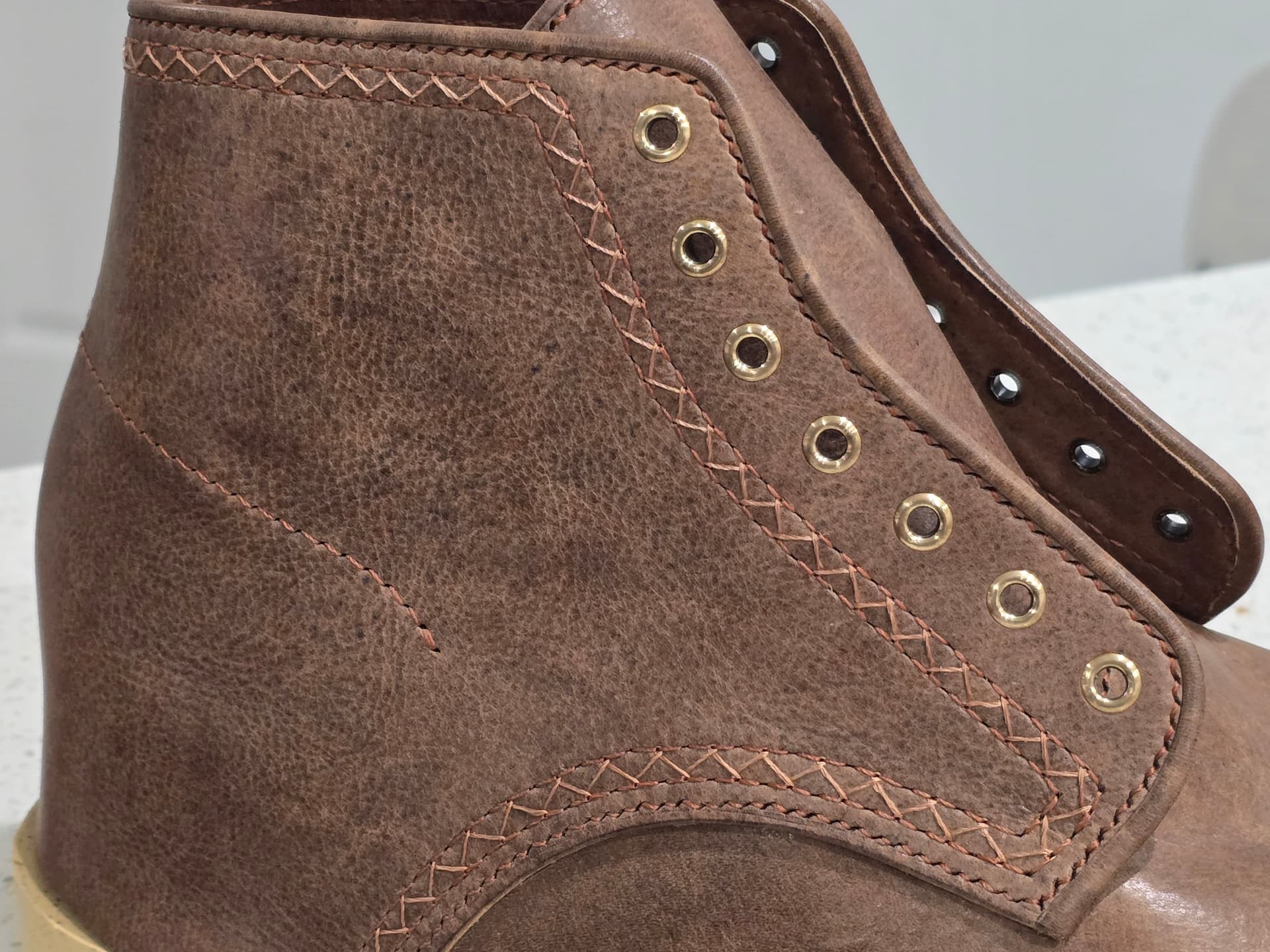 Funny thing is I ended up with pretty much the same stitch pattern, just tweaked the color/thread size/pitch going into the final makeup and that calmed things down a lot. Only thing that simplified was sticking with a saddle stitch on the heel counter line rather than the whipped stem stitch