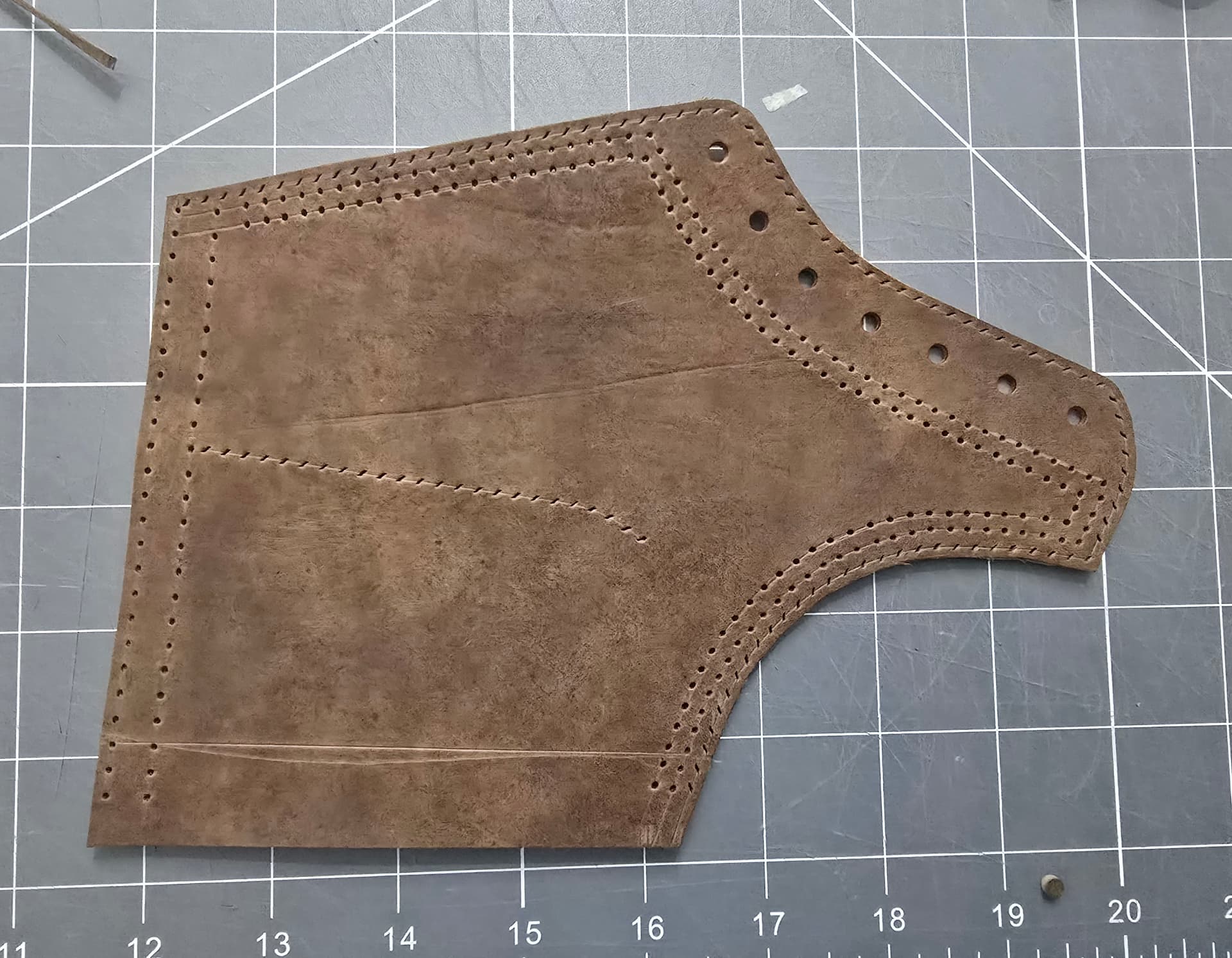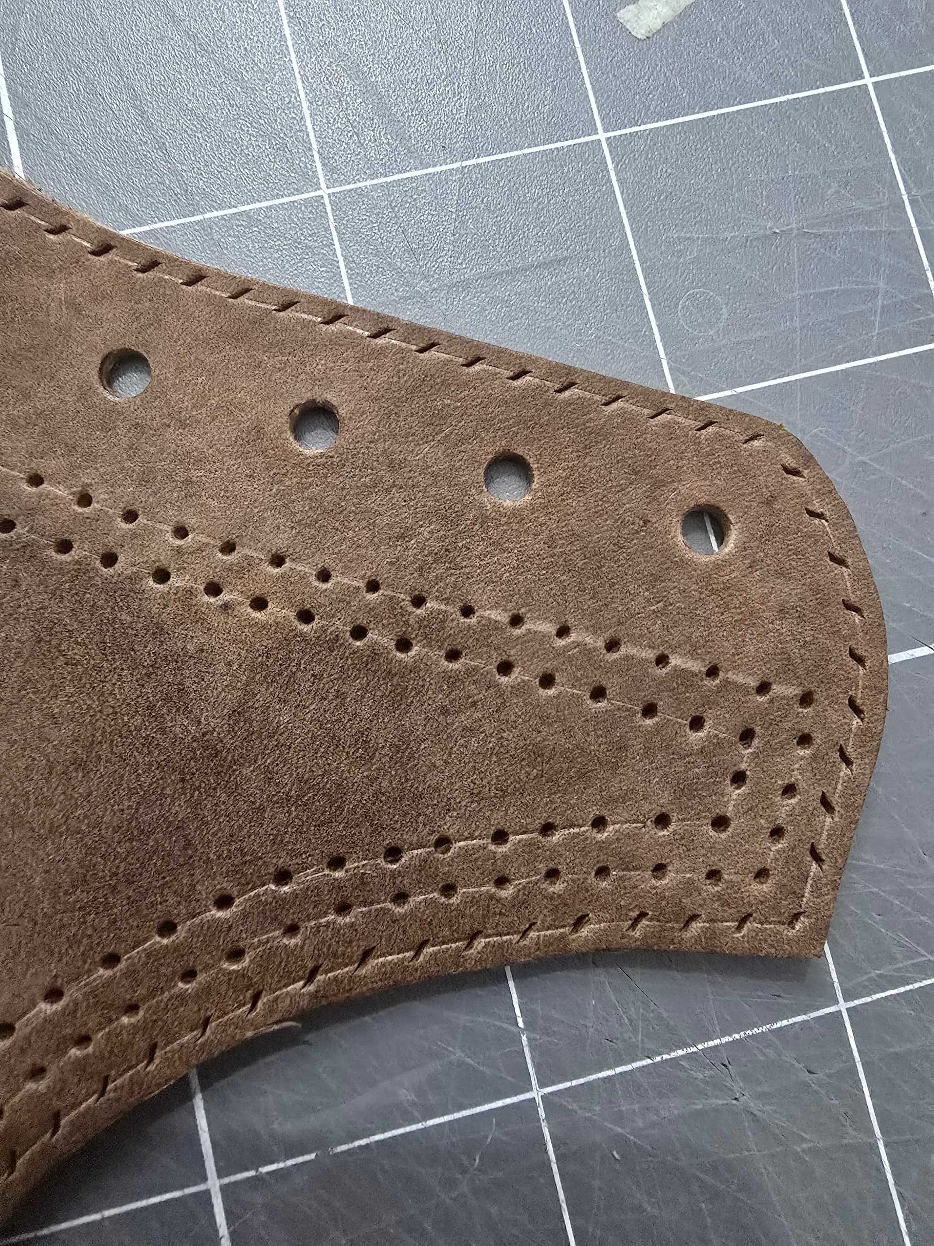 Round holes will get saddle stitched and then herringbone stitched between them. To do so, the holes really need to be spaced the same between the two rows, which obviously doesn’t work easily with different distances around the curves.