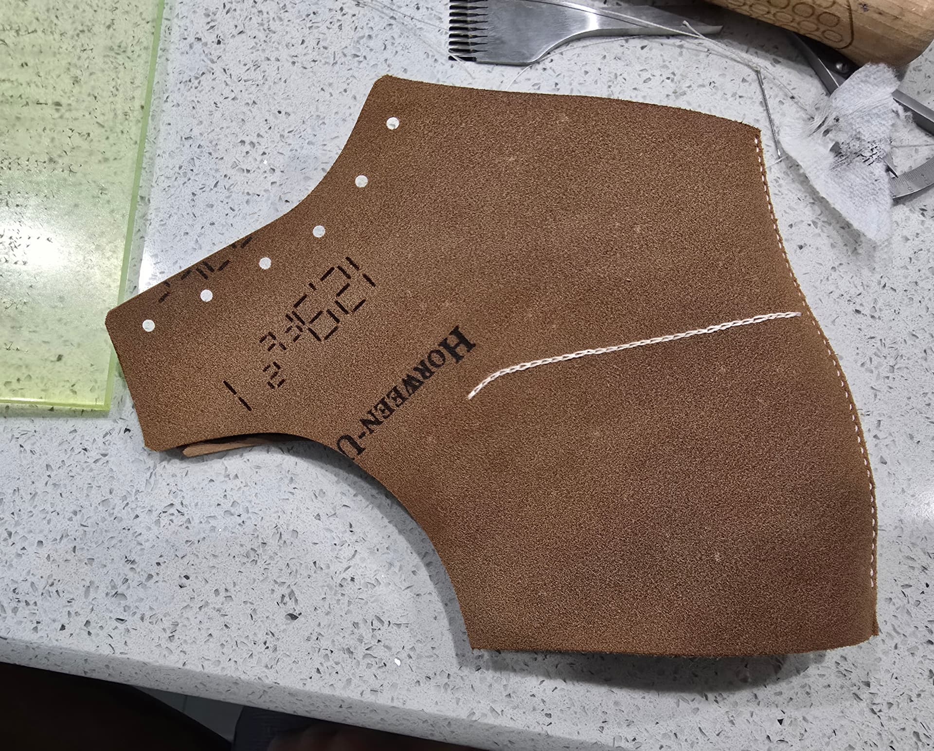 I killed the end of the chromexcel hide I have been using. Have a horween coconut latigo that I bought for making a bag for my wife laying around. There was a section of it with lots of scratches on the top grain, so perfect for wasting on a mock up. Amusingly, it was the section with the tannery stamp on the flesh side, so got a decorated quarter.