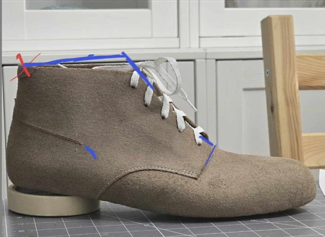 Well, after trying it on and walking around, there are a few visual changes I want to make. Top line needs to rotate up a bit to a steeper angle. Also want to reduce the radius going down the eyelet stay. Bottom of the facings need to be a little less rounded and I want to open the facings up a little. That rear tab needs to go too