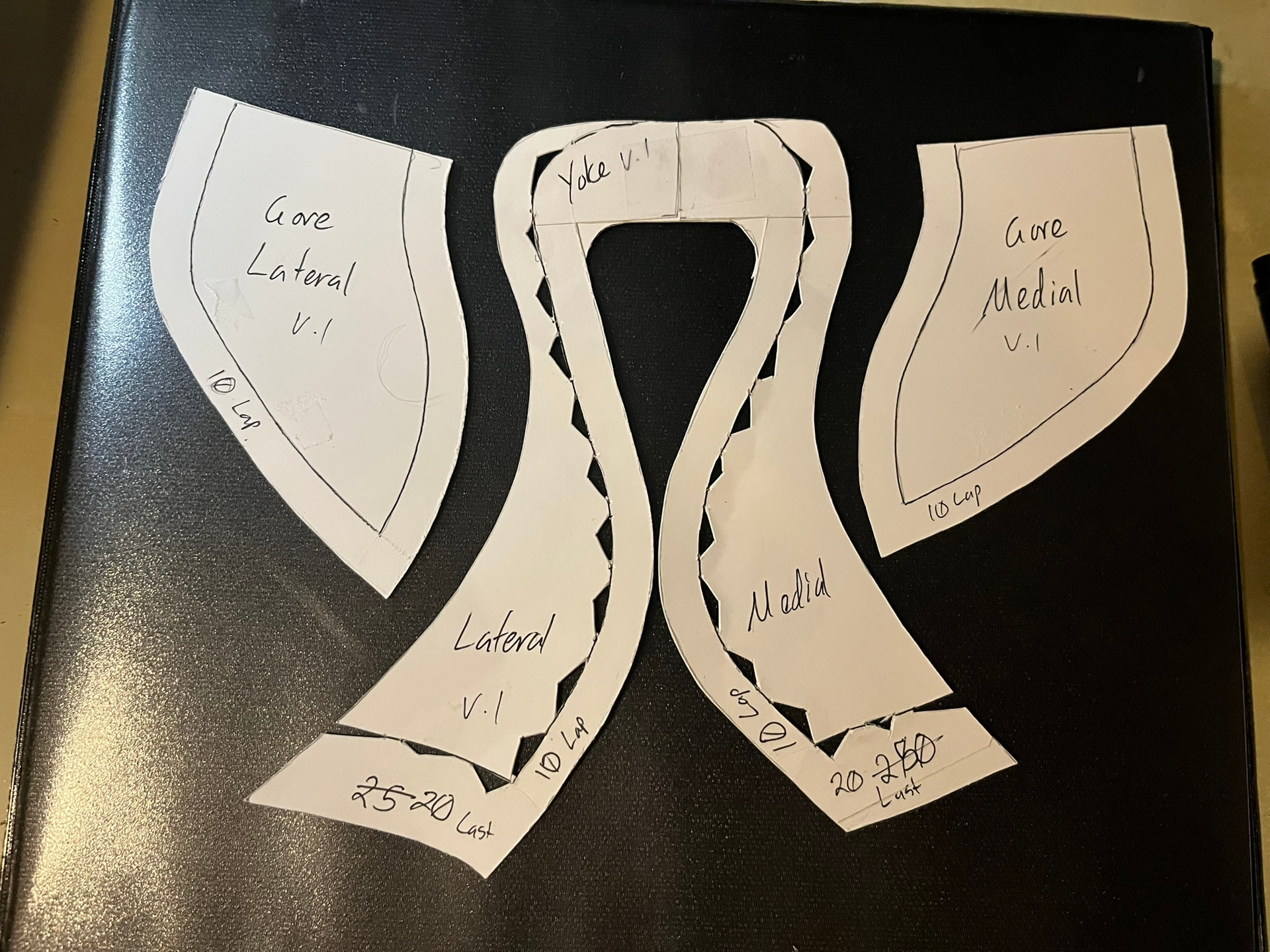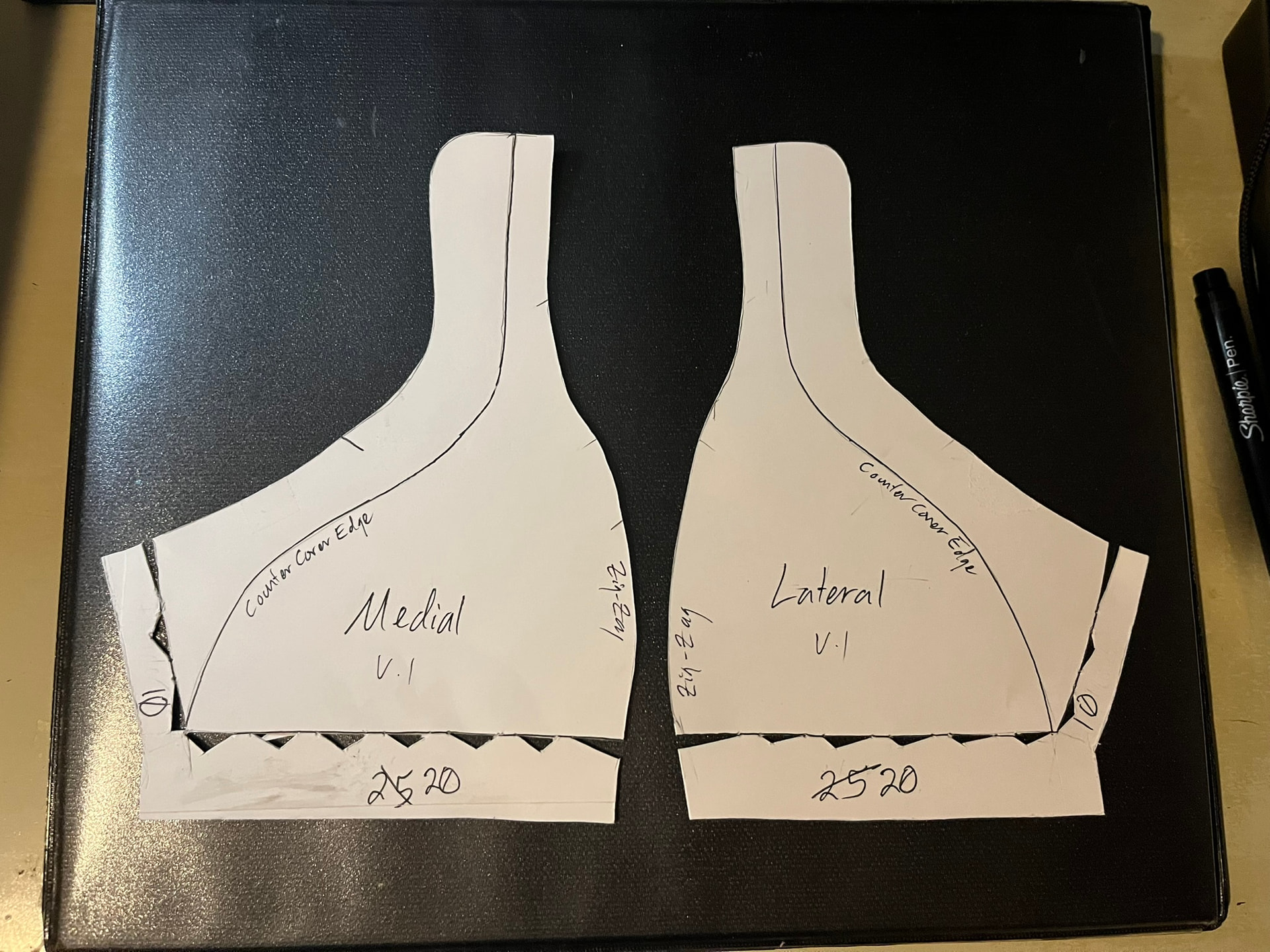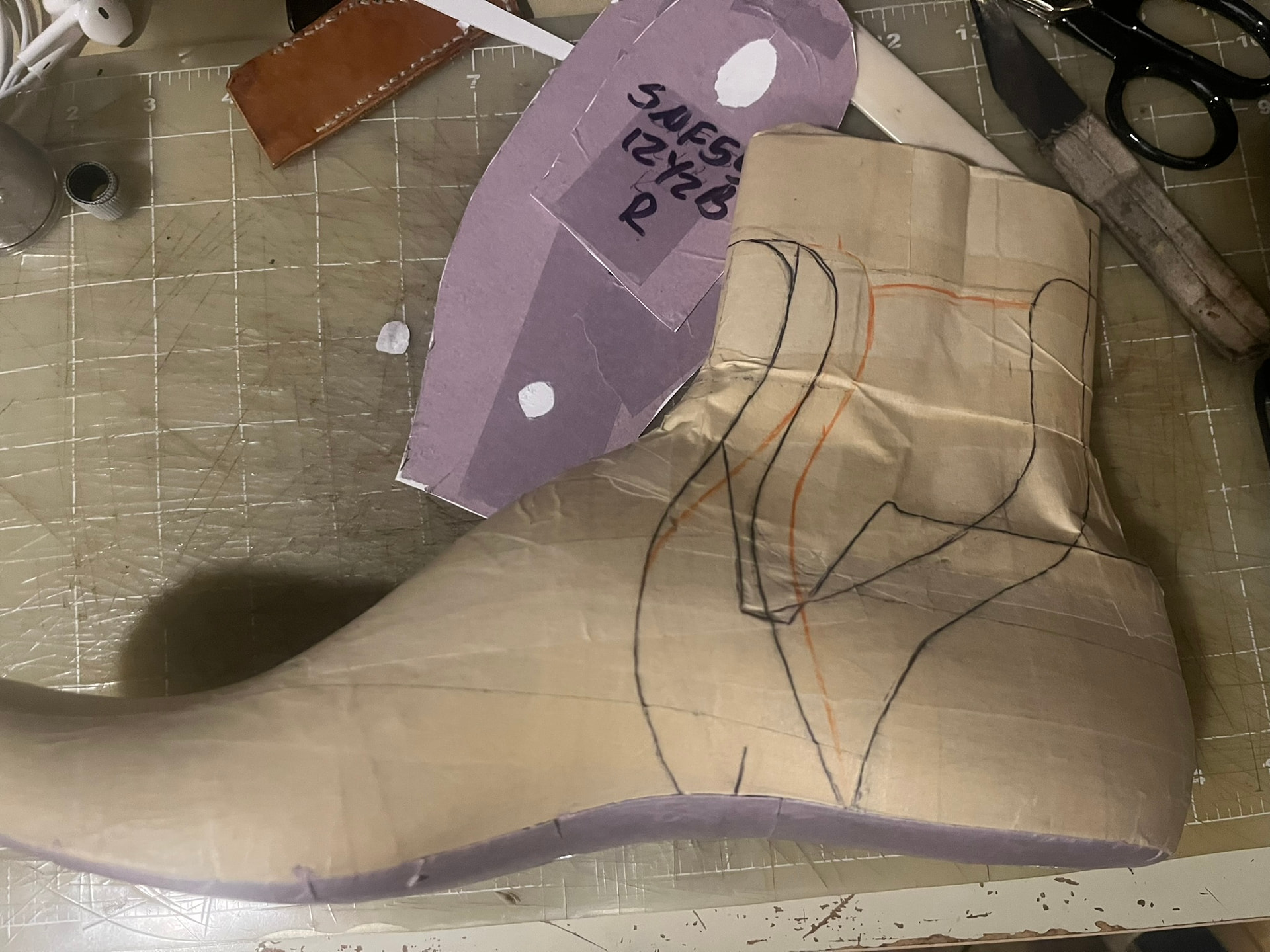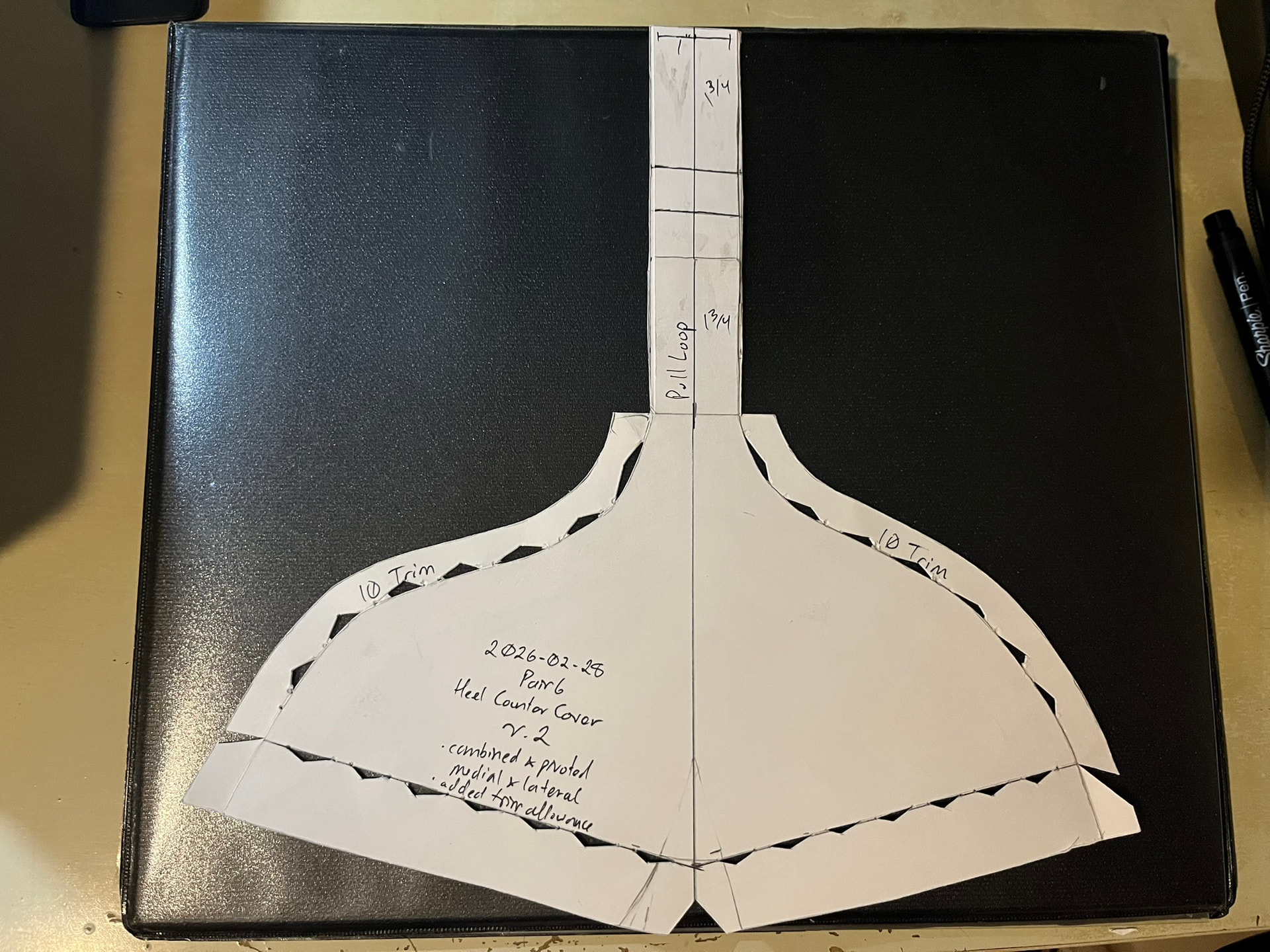 I’m trying for a crimp-free pattern and one-piece combo heel counter cover and backstay. In sketches, I ended up with a bit of a hybrid of Patrick’s Chelsea and Grecian Slipper patterns.