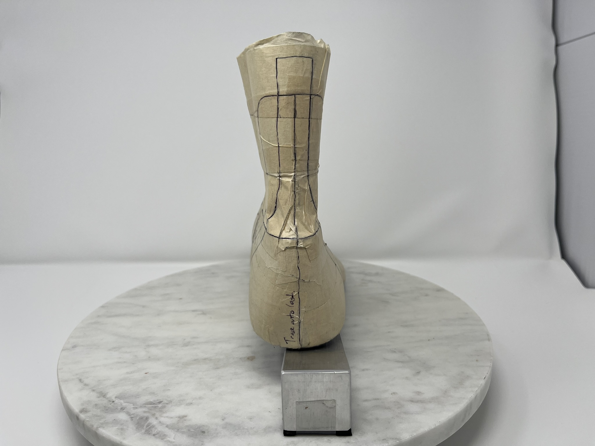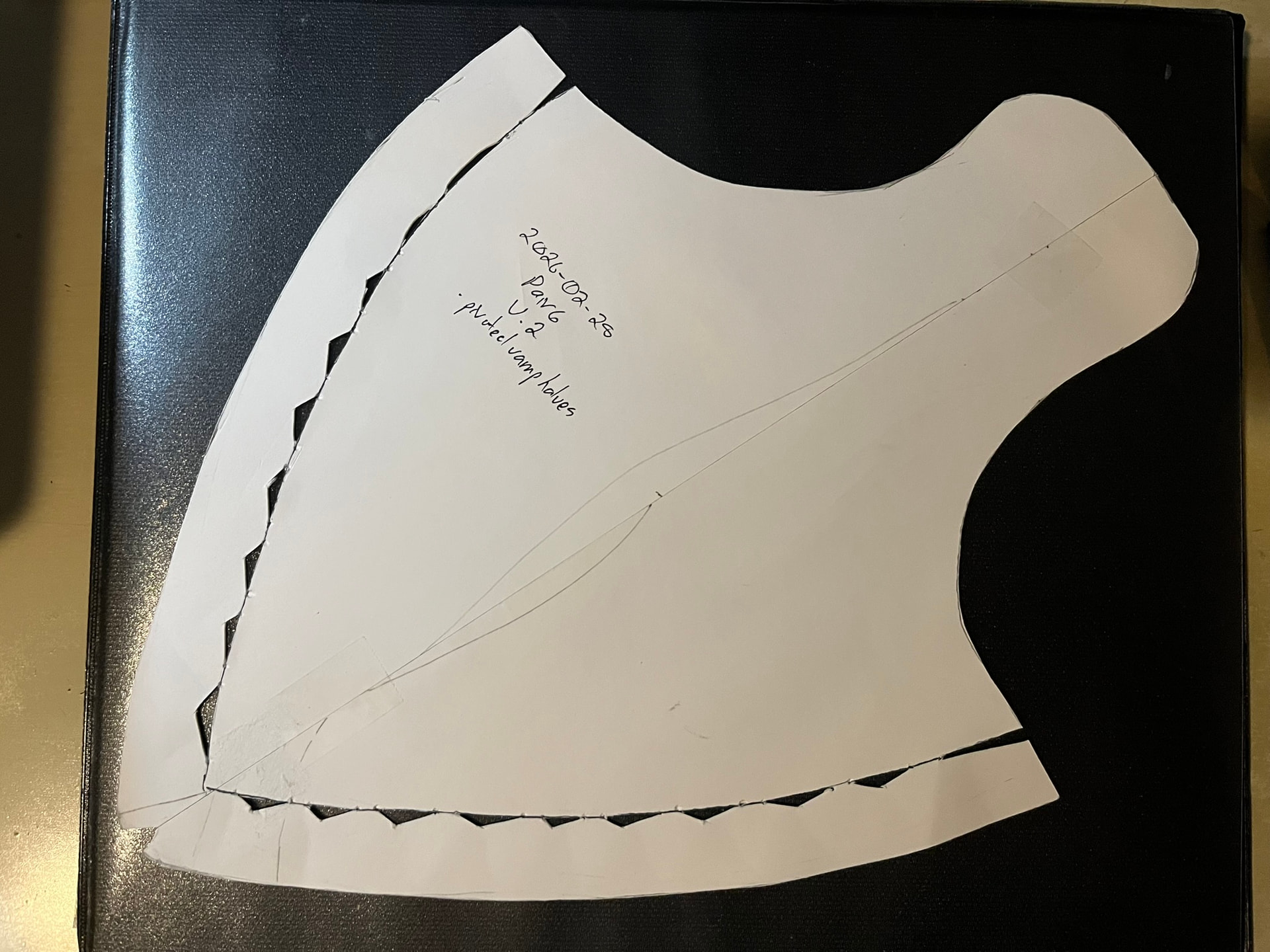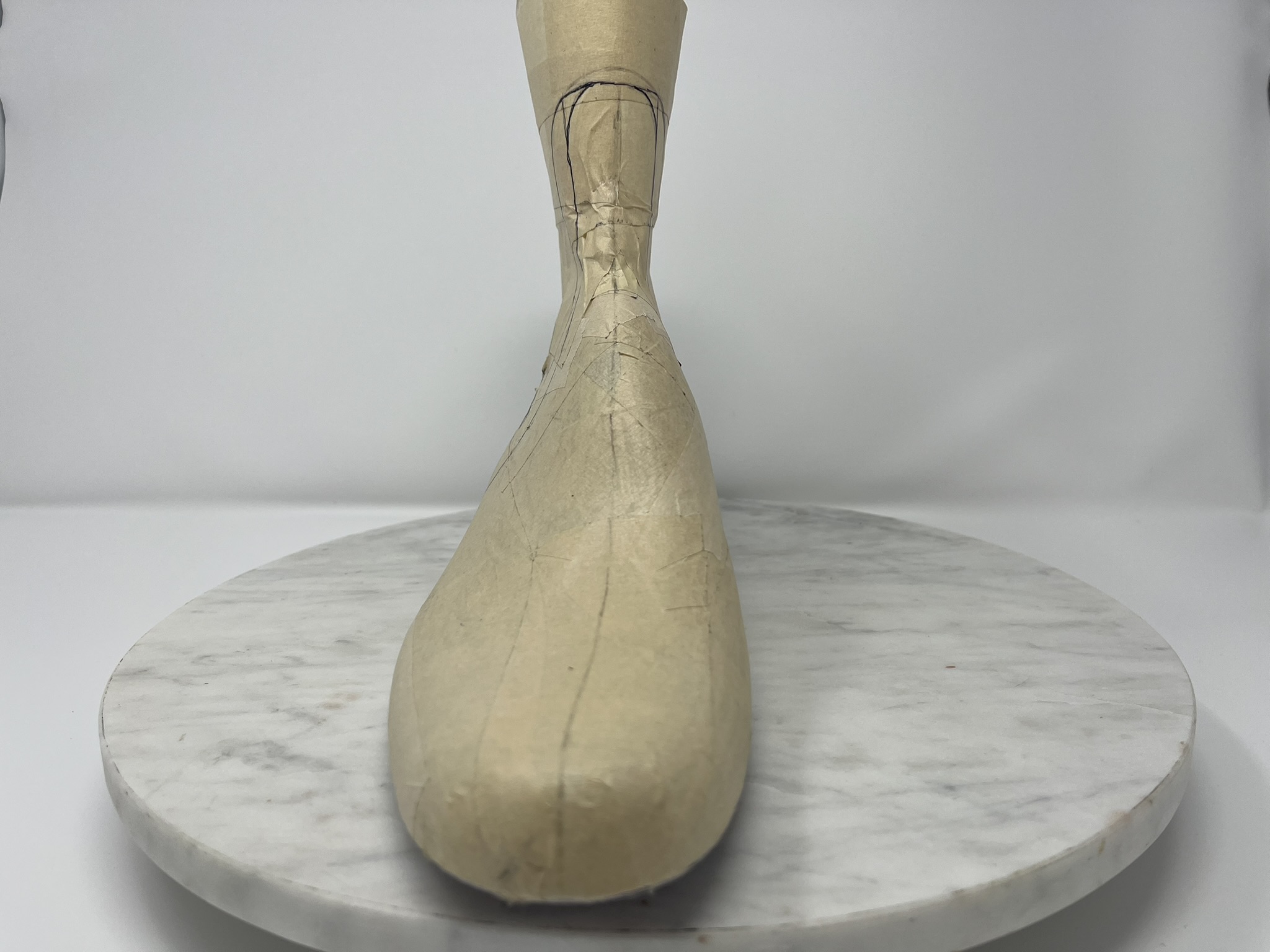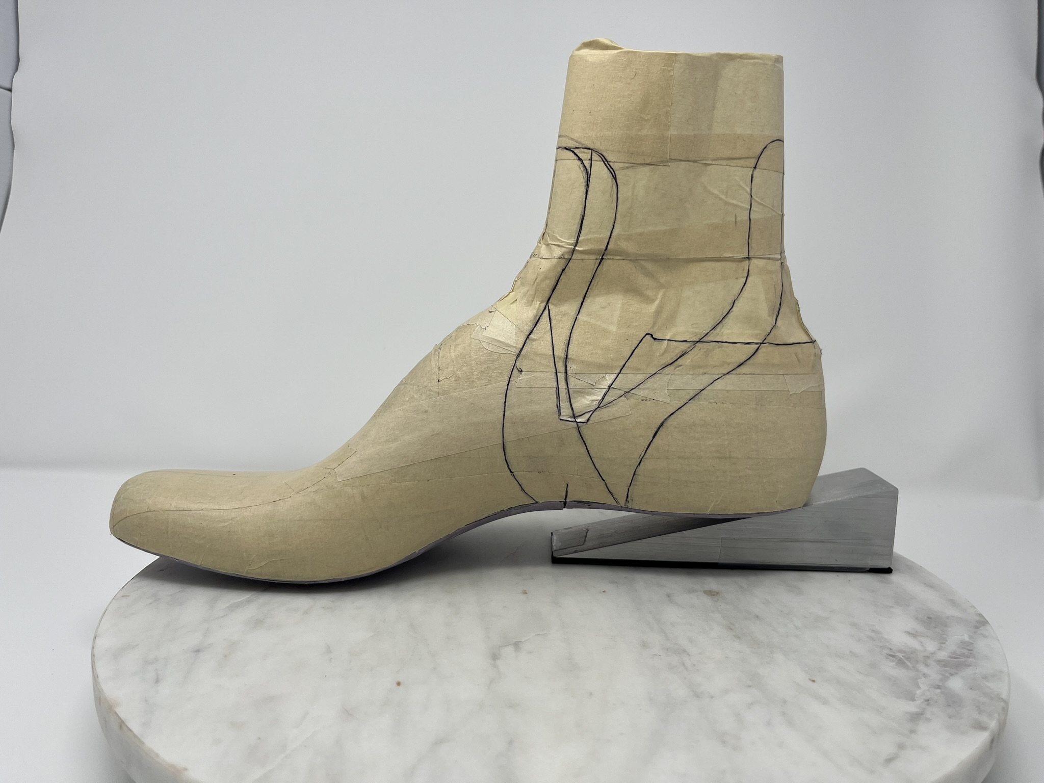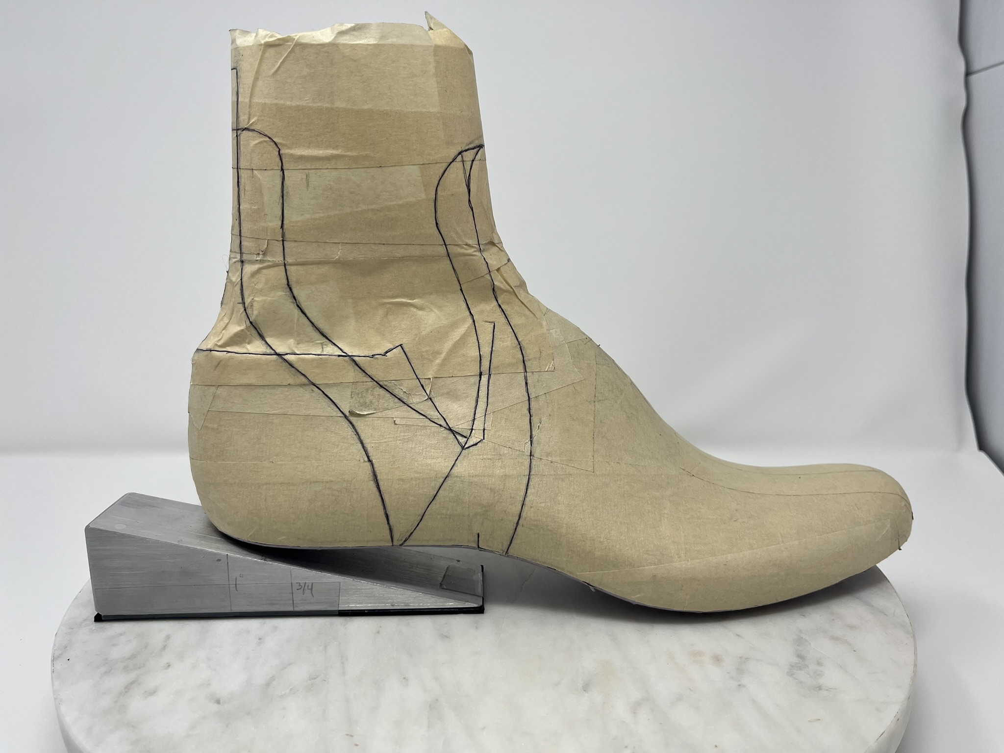 I’m trying for a crimp-free pattern and one-piece combo heel counter cover and backstay. In sketches, I ended up with a bit of a hybrid of Patrick’s Chelsea and Grecian Slipper patterns.