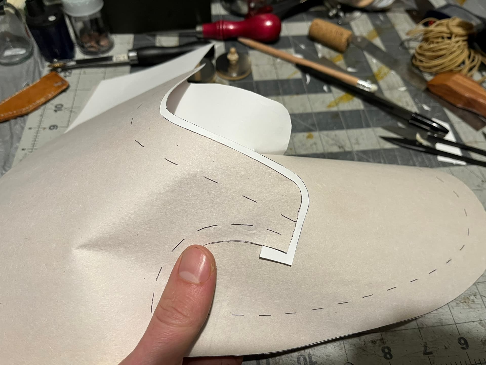 After flubbing the patterning on a pair of derby boots, I decided to take a few hours and play with the patterning again, starting from new tape forms. One of my goals was to try out some of the concepts I had in notes from the Seidich family’s Uppermaking book: