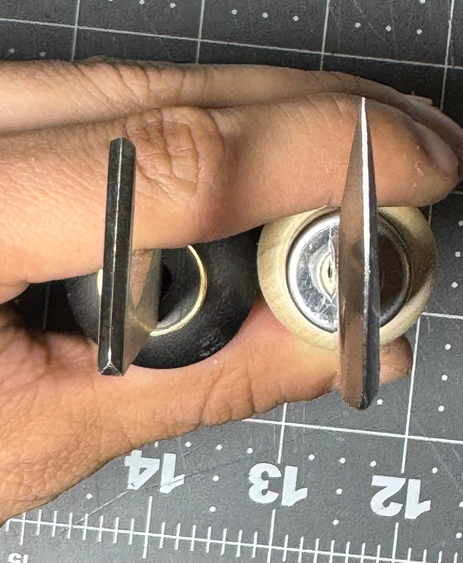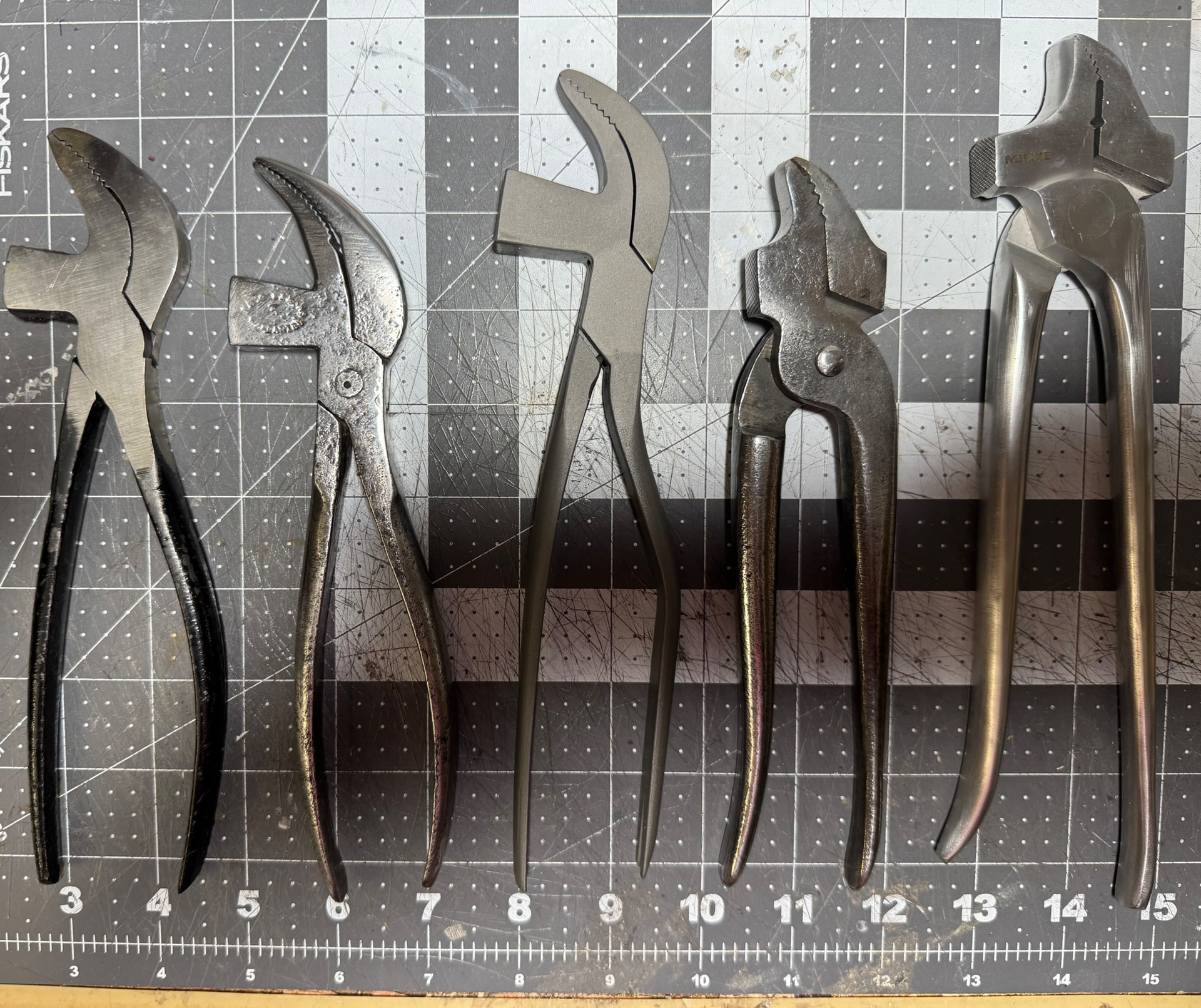 The Chinese lasting pliers are the narrowest I have. They work OK but they feel cheap and don’t have much heft to them. The vintage ones to the right are really nice, much more heft. The Mamoru pliers came with some kind of matte finish (to prevent rust?). They are 5mm wide at the end and have a great heft, similar to the vintage ones. They do not feel as solid as any of the vintage ones or the Minke but are miles better than the Chinese pliers. The vintage German pliers are nice with a good heft but the anchor/hammer does not come out as much as Japanese or Swedish style. Its hard to get good leverage unless I pull very close to the end of the lasting allowance. The Minke pliers are the widest (15 mm) and heaviest. They were the first ones I purchased and are amazing in all regards.