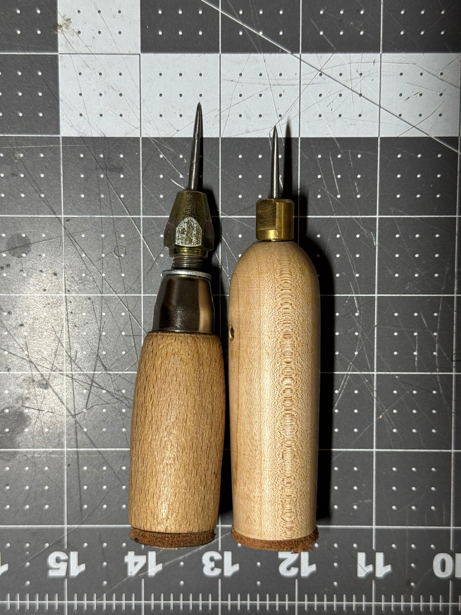 From left to right: Waist stitching awl Mamoru, Welting awl Mamoru