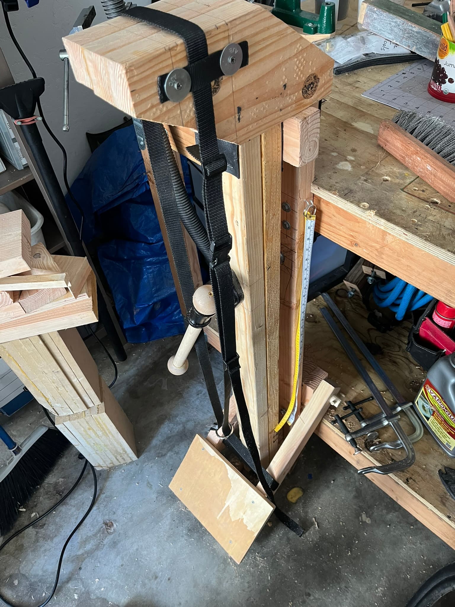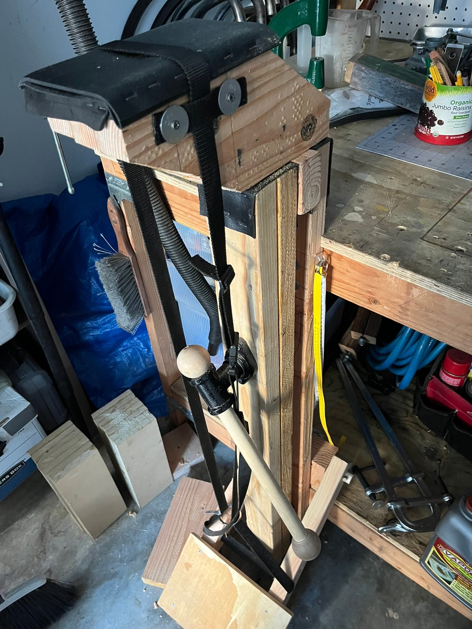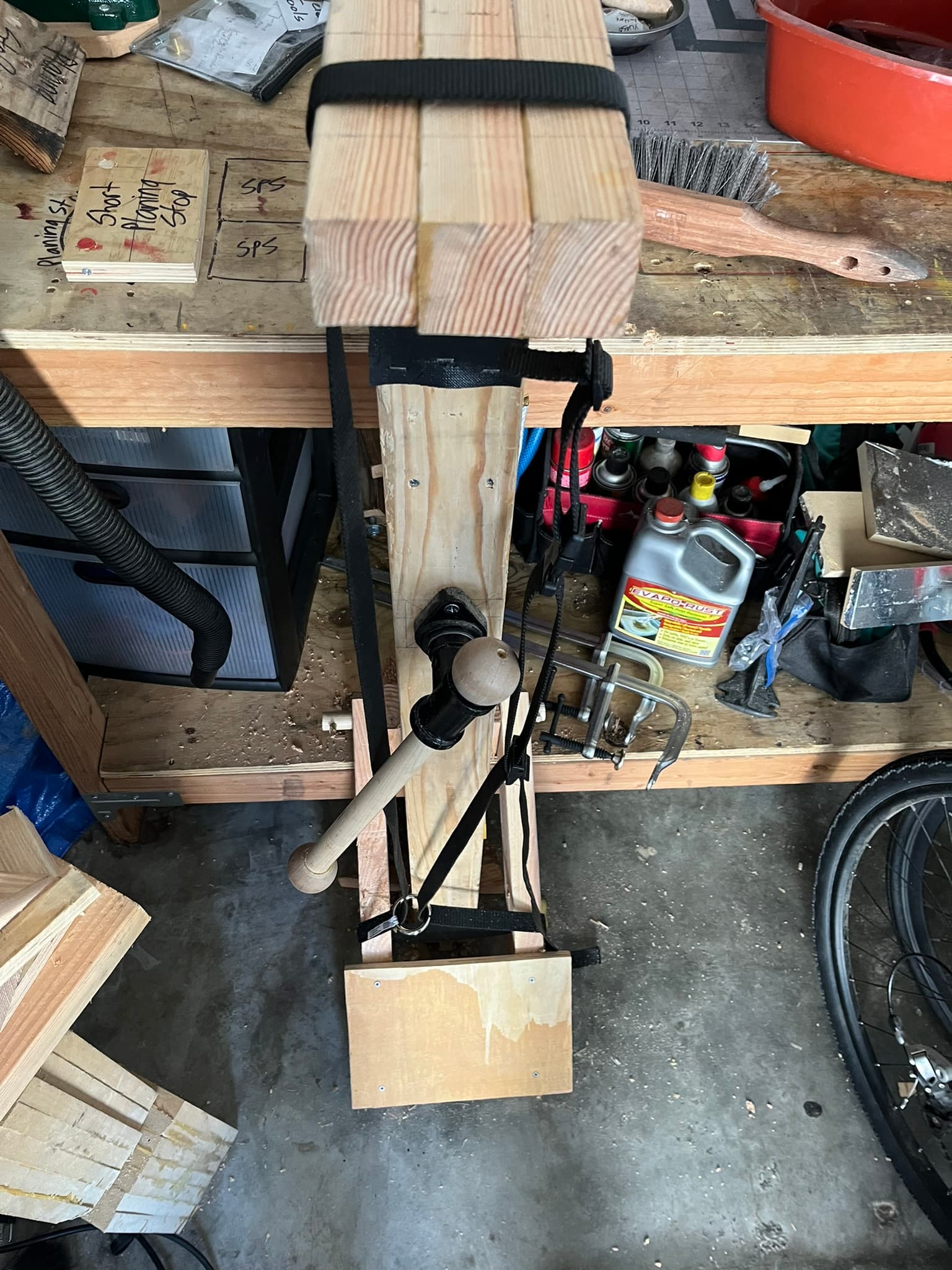 One of the weaknesses of this combo is that the foot pedal for tensioning the strap for the stand can’t be right next to the bench, because that’s where the bottoms of the legs of the vise are. I worked with what I had and made something that works, but the angle of the foot board is uncomfortably steep. I’ll probably end up making some different pedal.