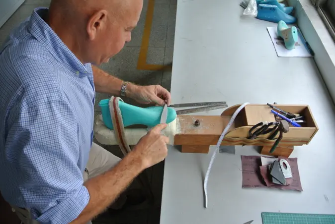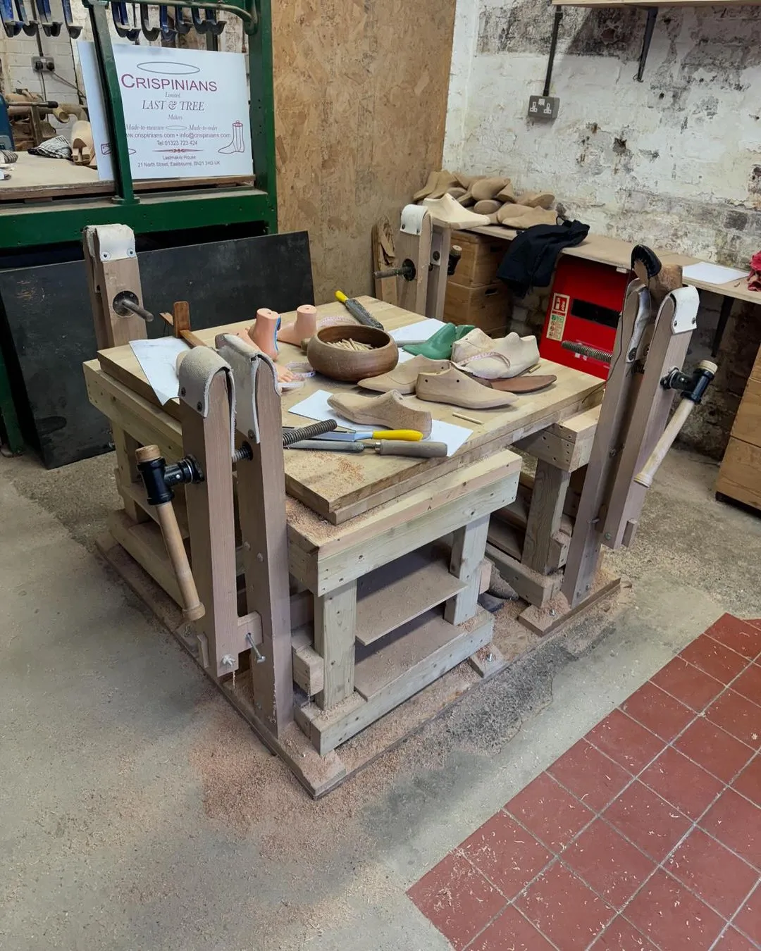 Basically, the “last vise” is a woodworker’s leg vise with some padding lining the jaws. The lastmaking stand or cradle works more like a shave horse, but with a strap rather than a pivoting wooden hold-down jaw.