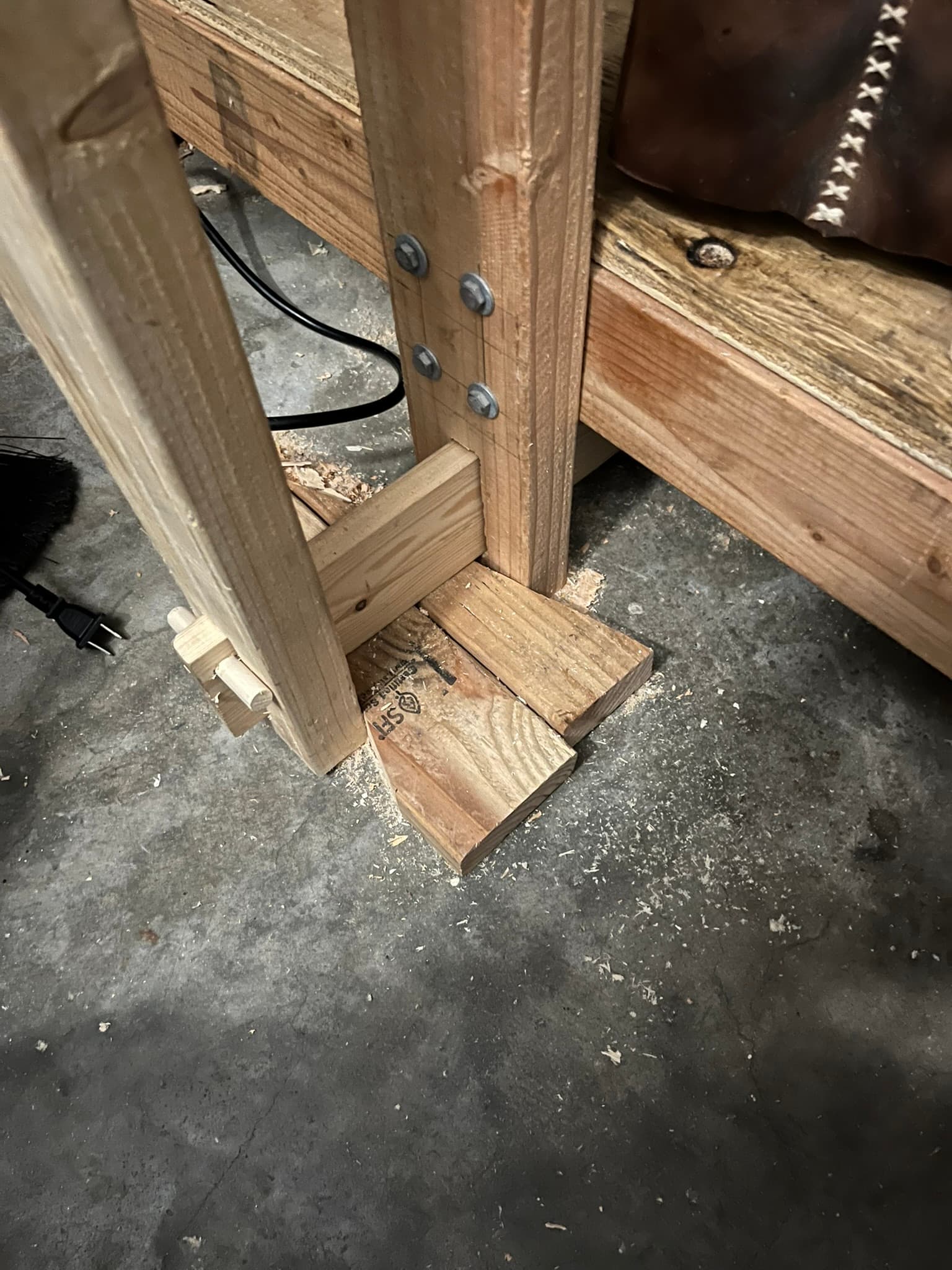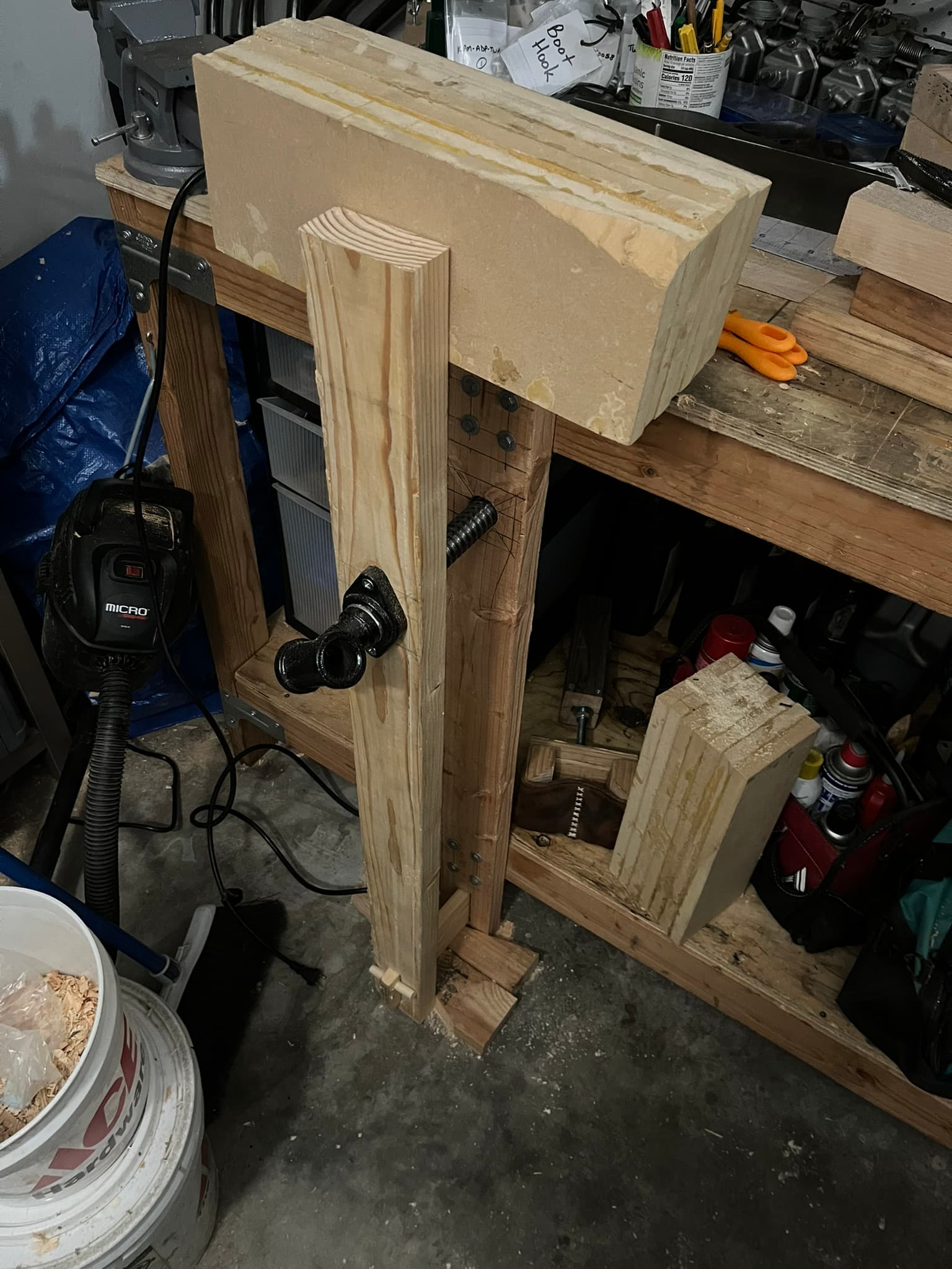 I originally built the vise with a single 2x4 for the moving leg. It wasn’t long before I went back and doubled up the leg with another 2x4, glued and screwed together. I was afraid the extra weight might rack the screw, but that hasn’t proved an issue. The leg is now much stiffer.