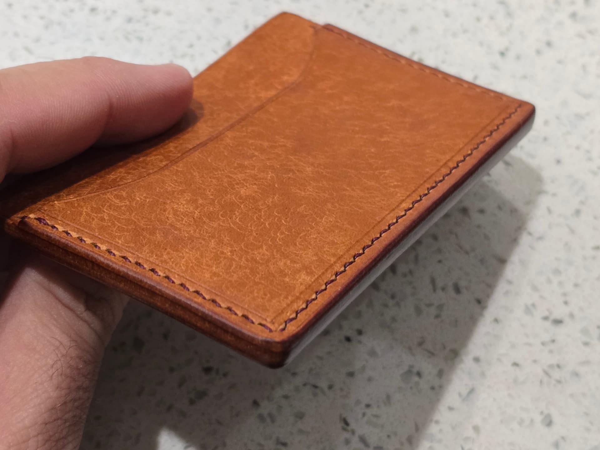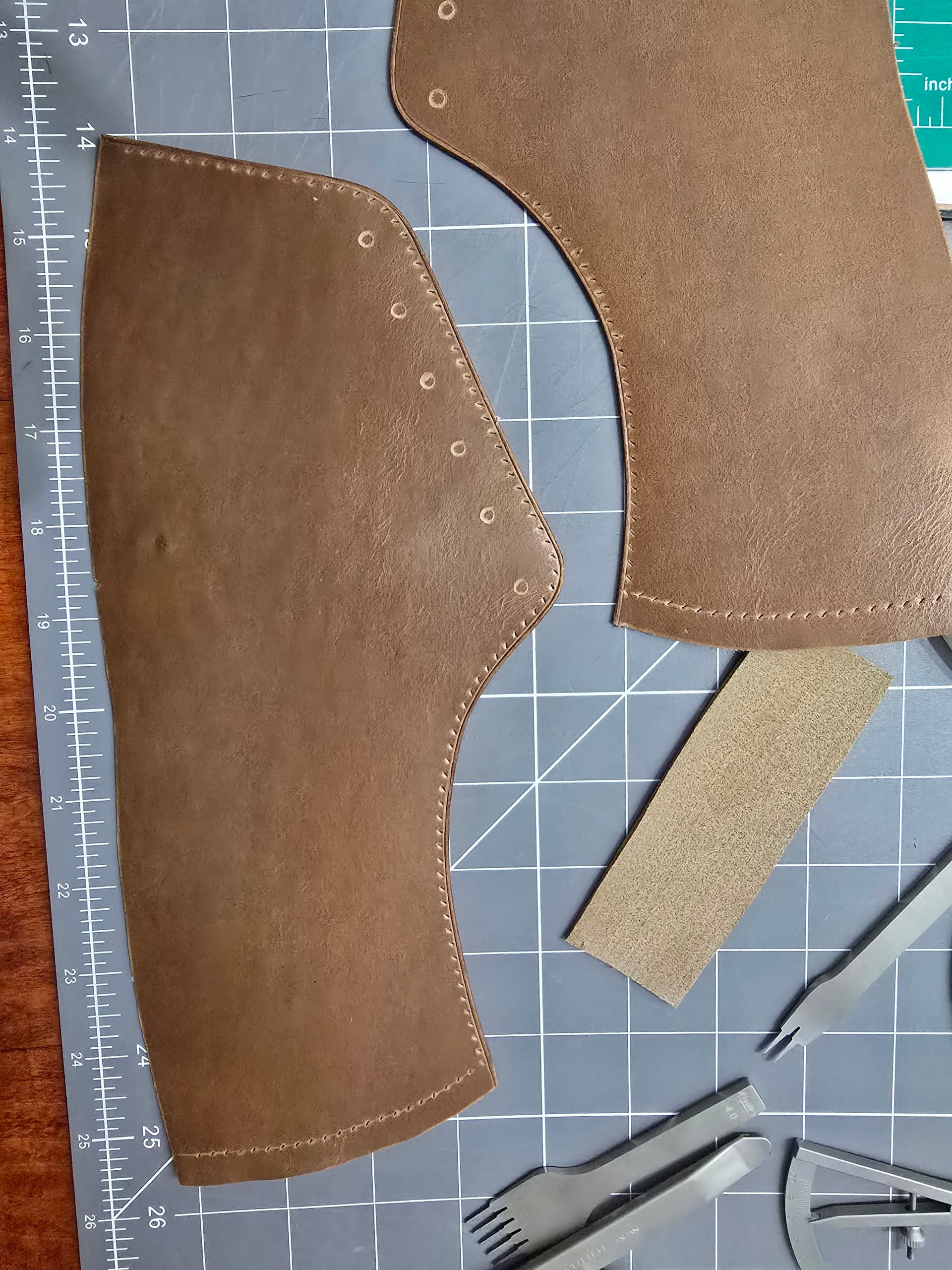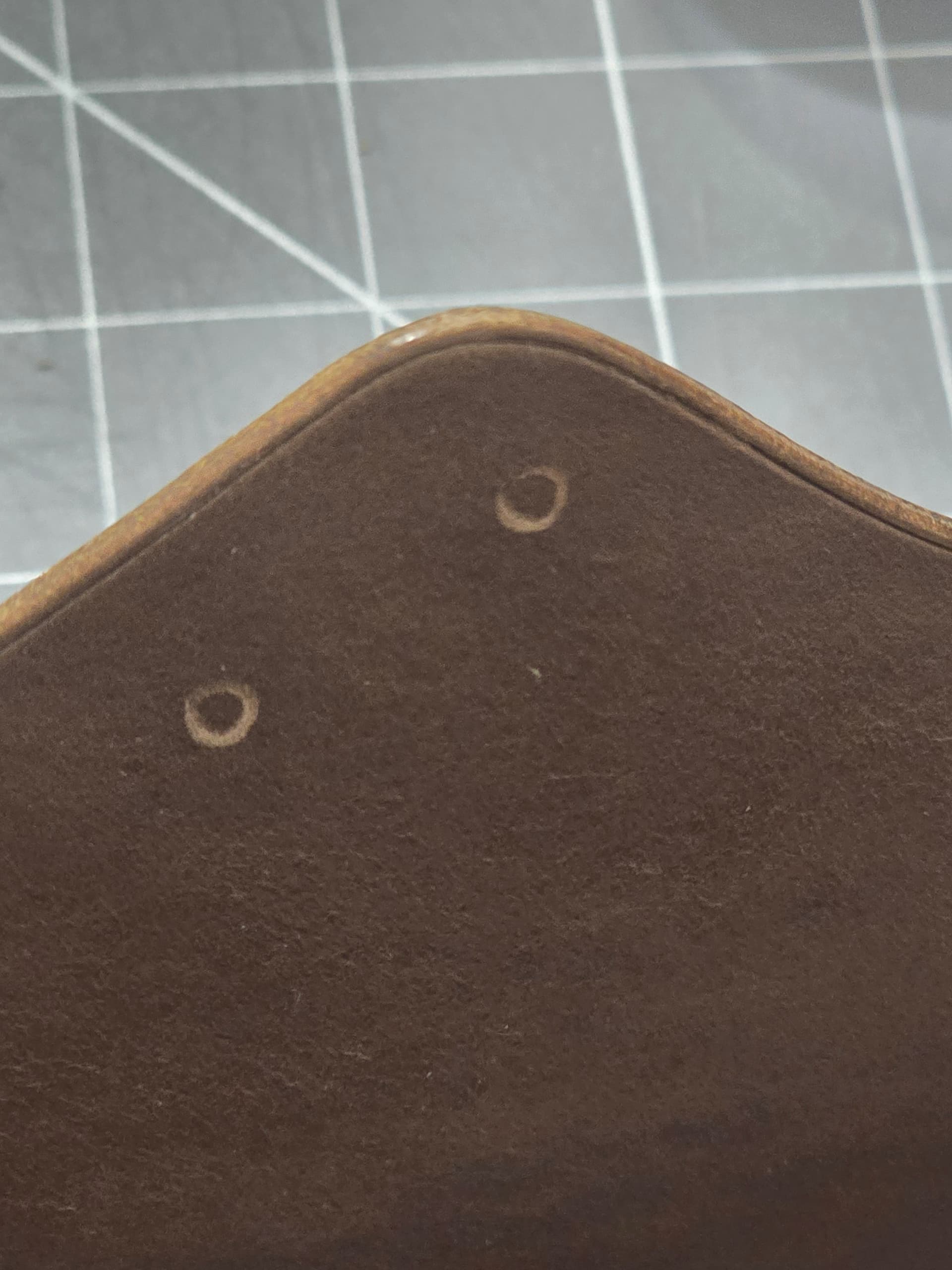 Process wise right now, I wet the edges with diluted tokenole, then sanded with 320 grit. Raising thw edge a bit helps with edge creasing. I then ran a 1.5mm heated edge creaser along all the exposed edges then edge beveled. Wet with dilluted tokenole again, resand with 320, then sand with 600, burnish with straight tokenole, sand with 1000, burnish again. Then start to lay out stitch hole placement.