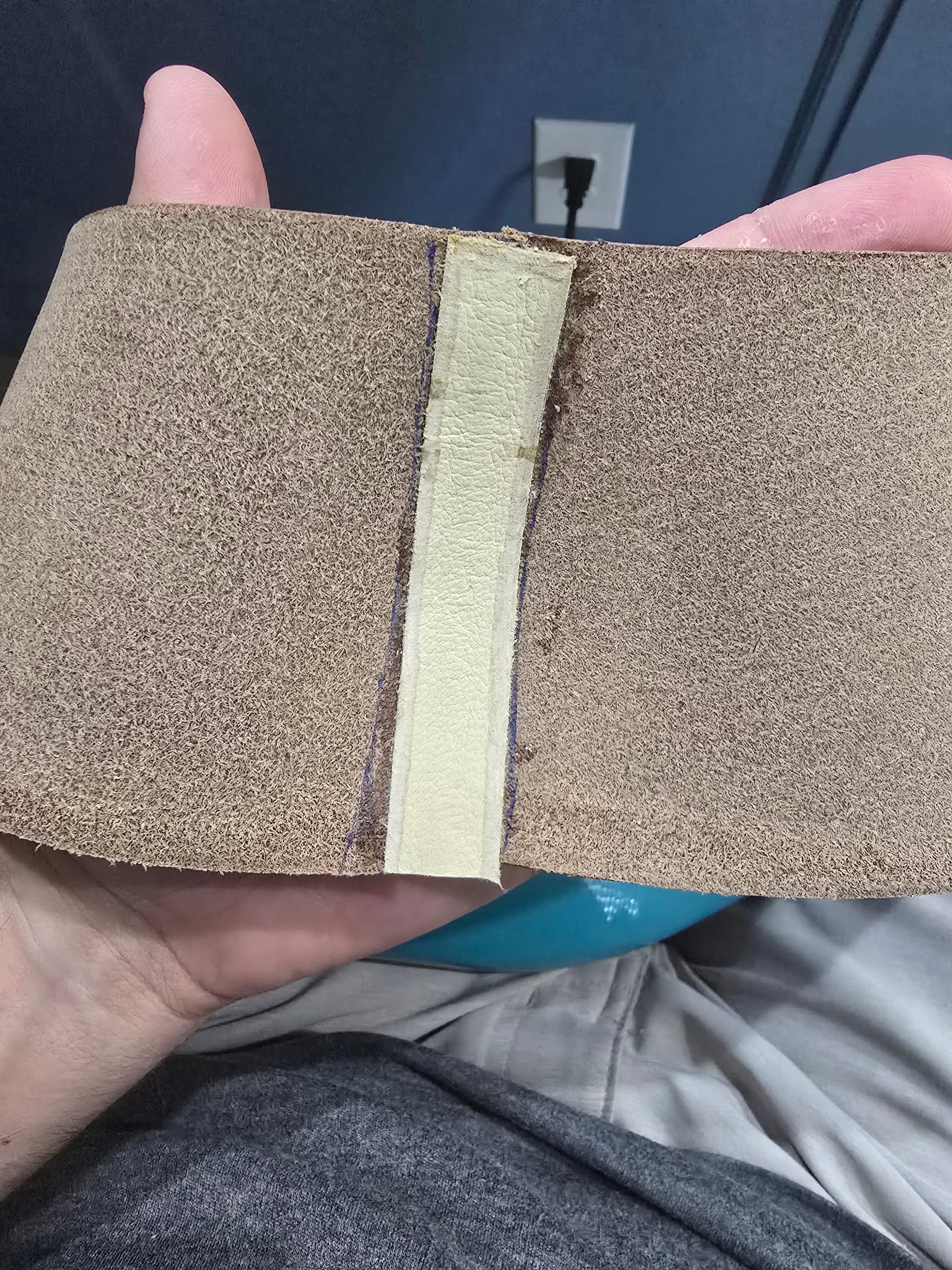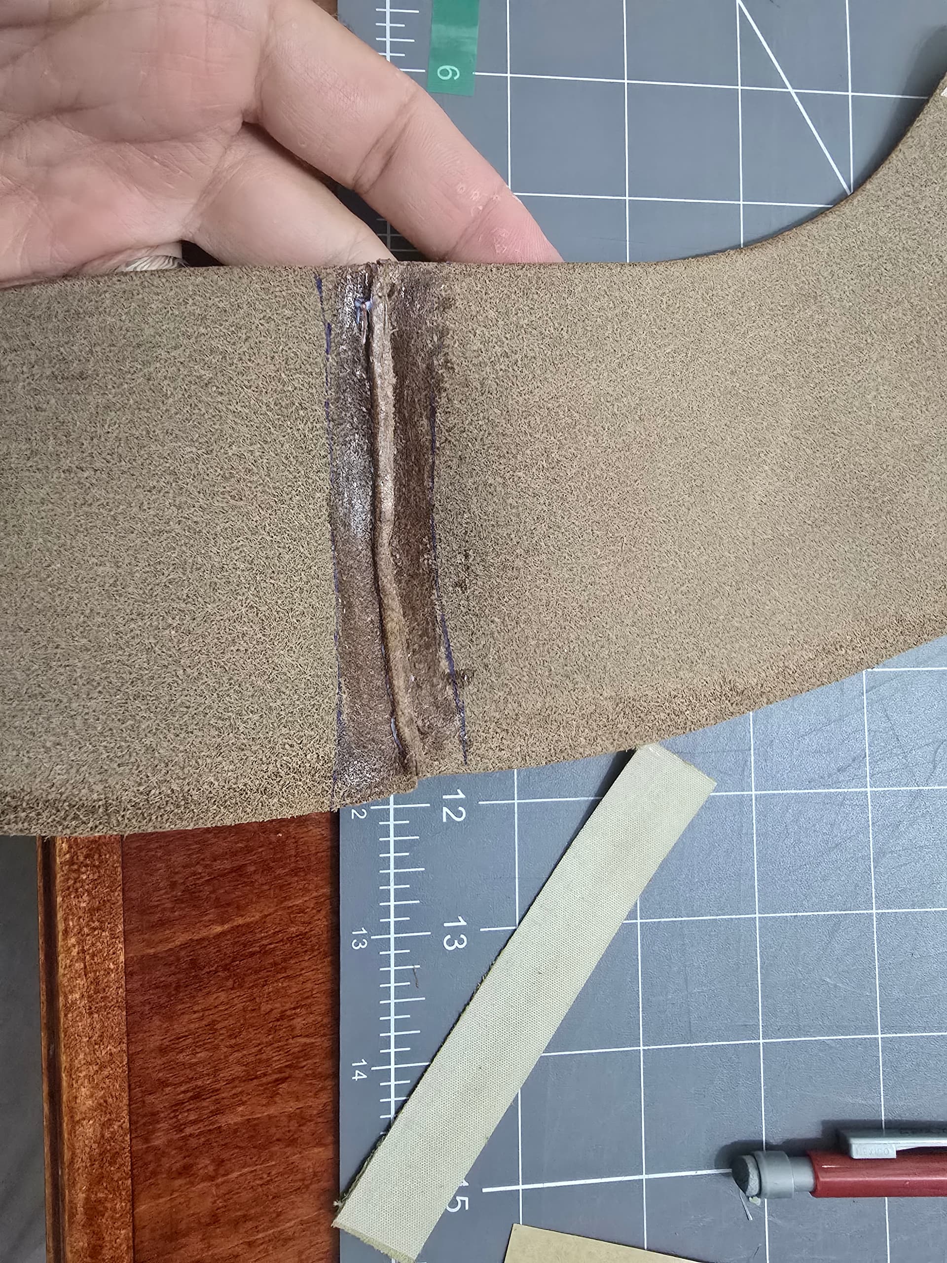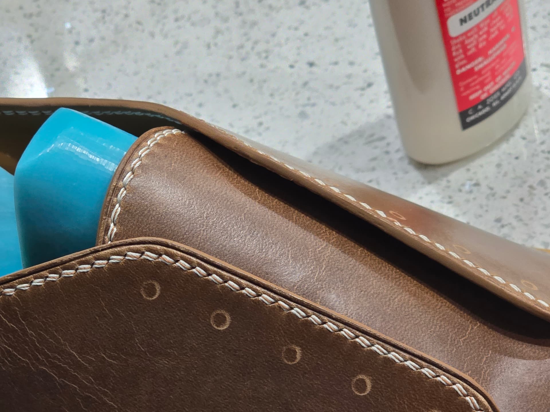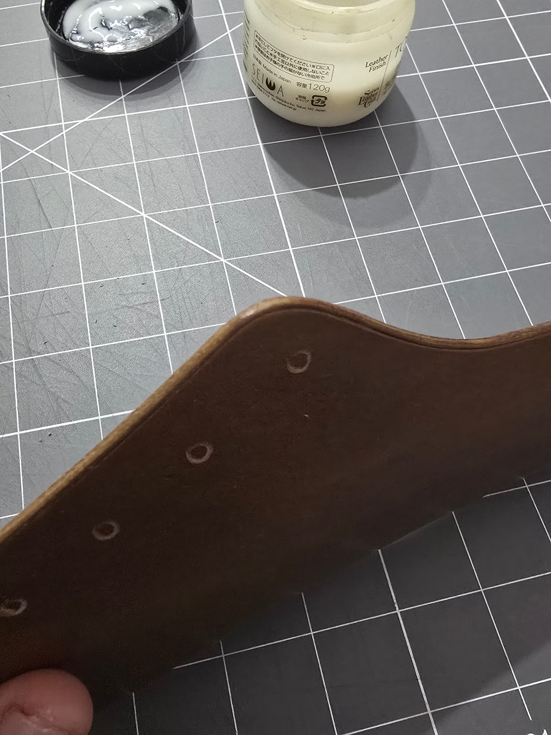 Process wise right now, I wet the edges with diluted tokenole, then sanded with 320 grit. Raising thw edge a bit helps with edge creasing. I then ran a 1.5mm heated edge creaser along all the exposed edges then edge beveled. Wet with dilluted tokenole again, resand with 320, then sand with 600, burnish with straight tokenole, sand with 1000, burnish again. Then start to lay out stitch hole placement.