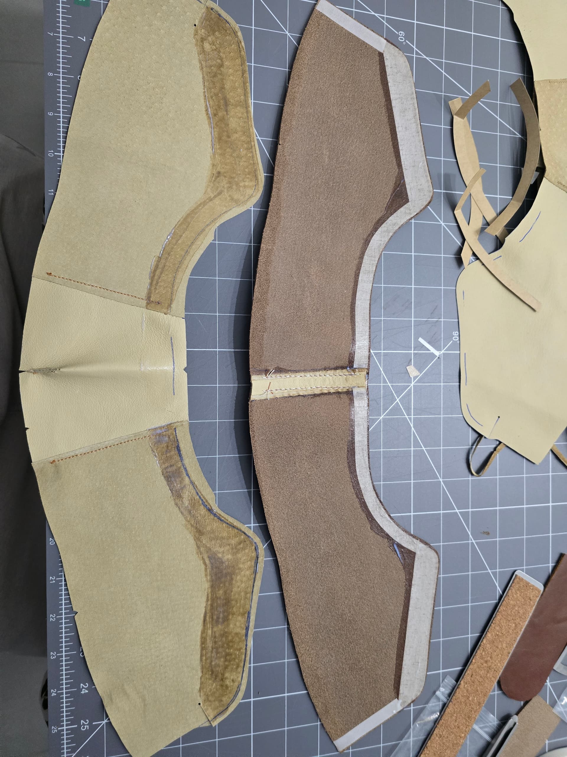 Starting assembly on the uppers. Didn’t quite leave enough trim allowance to do a full french seam on the back of the heels, but can at least get a reinforcement in for the seam.