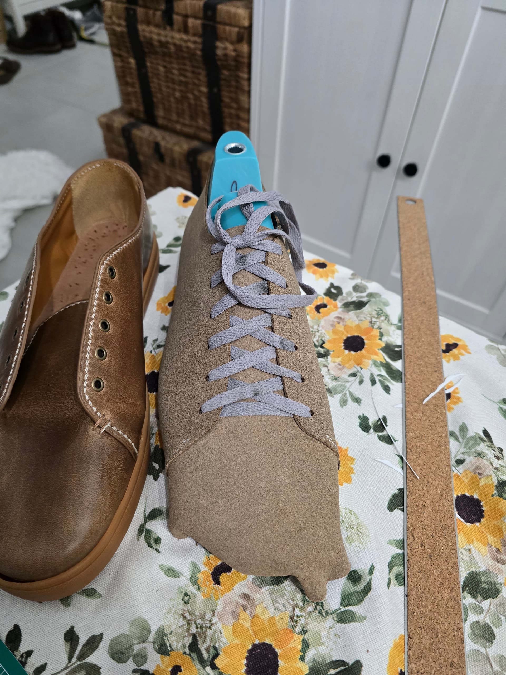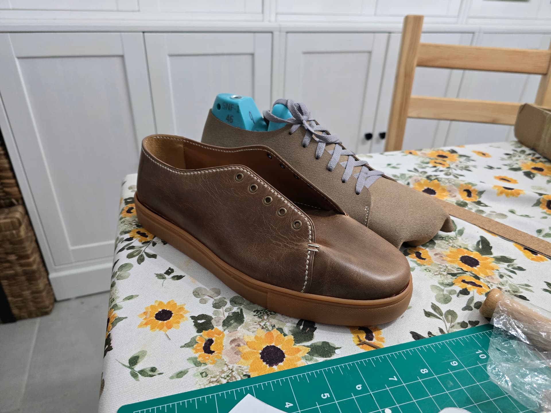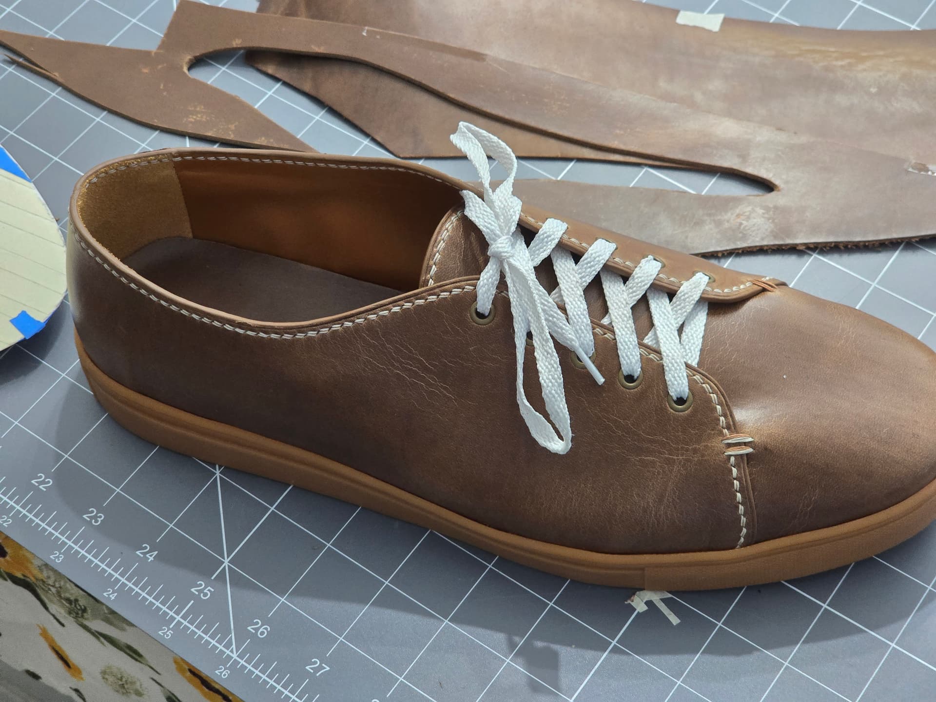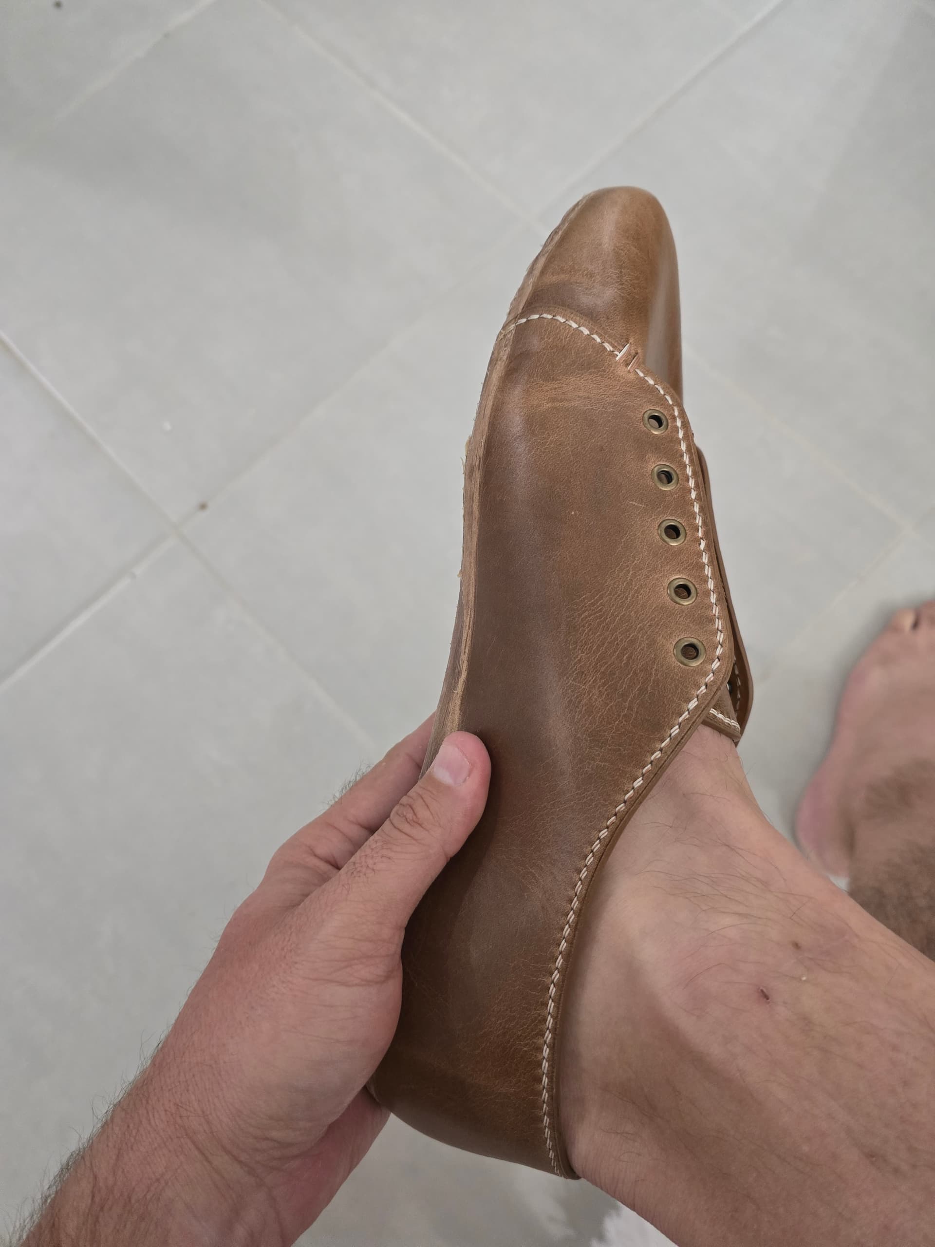 So I am doing a rev 2.0 to correct some of my mistakes from the first time around. They’re very much a super low, show all your ankle summer shoe. I want to add an extra eyelet up top to come up higher in the ankle. Also debating if I want to revisit some of the edge finishing. Currently, the uppers were made like I would a watch strap, with the edges creased and painted, etc.