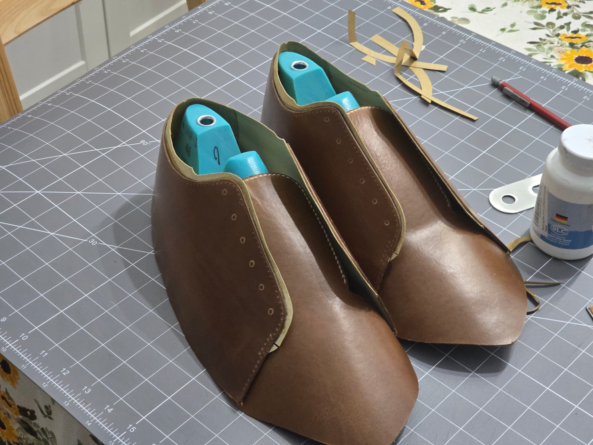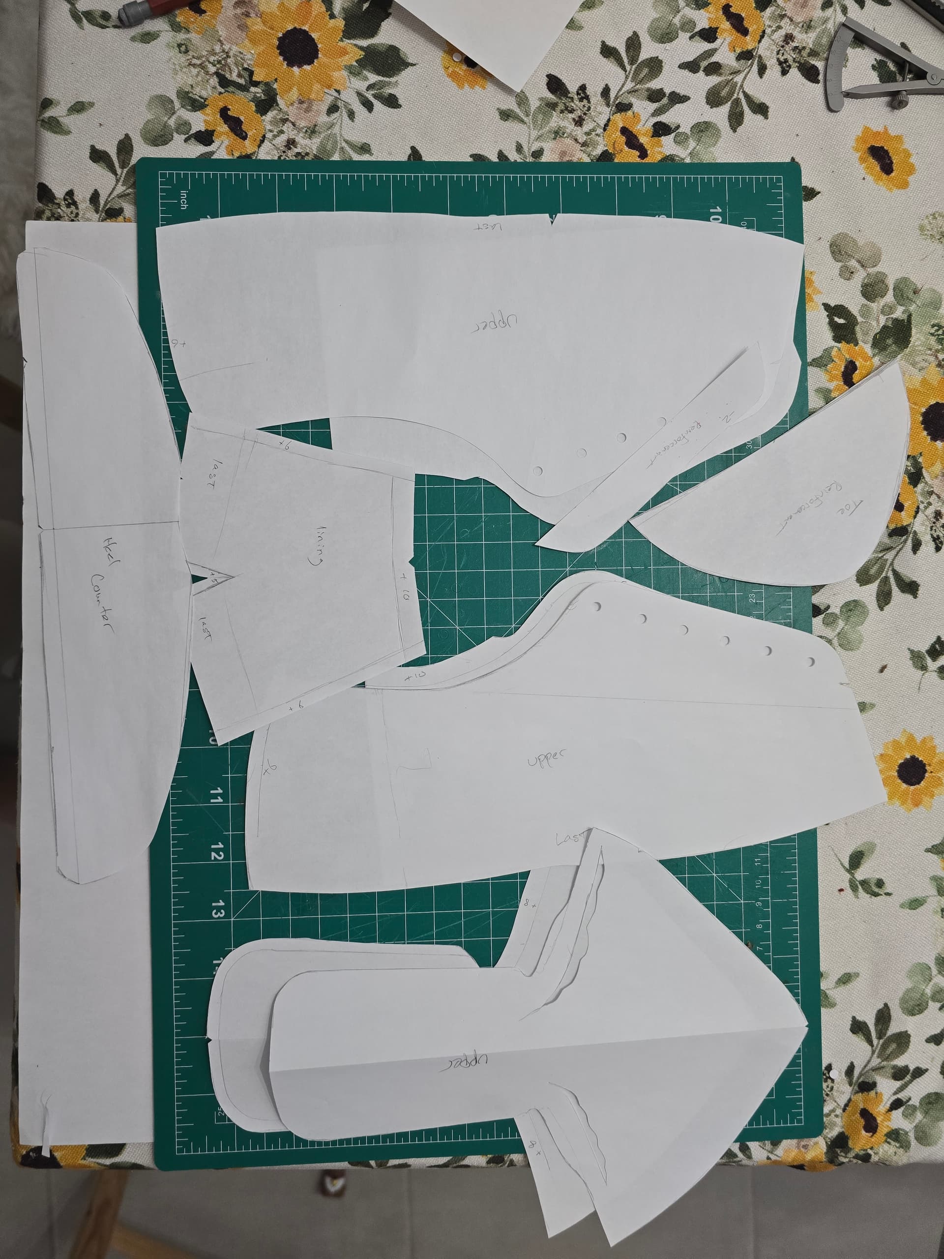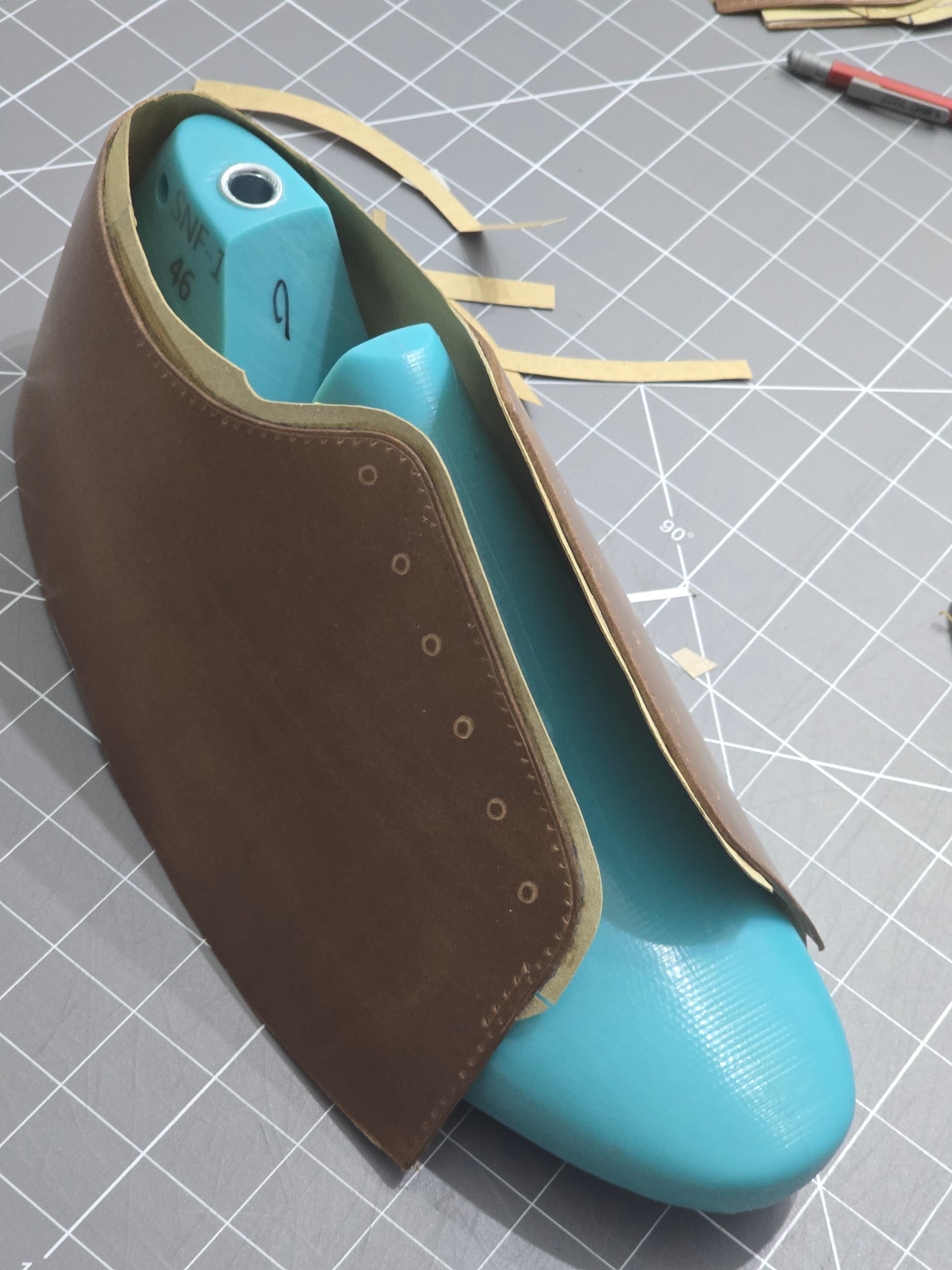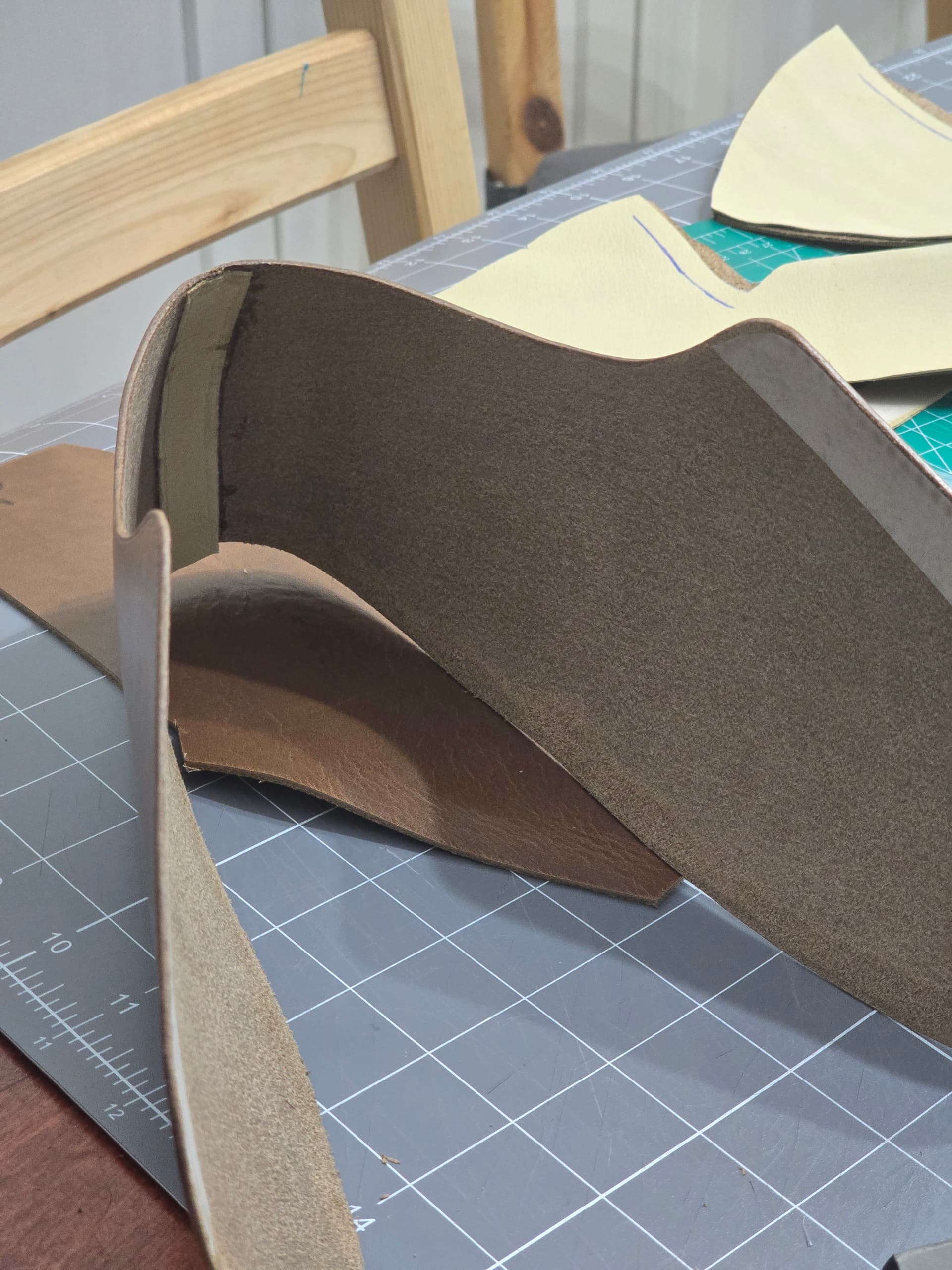 The first time through I didn’t have a toe puff or heel stiffner. It definitely needs them. This time around, i will be using some thin thermoplastic material for those stiffners. I have the templates for them cut, but haven’t cut/skived yet.
