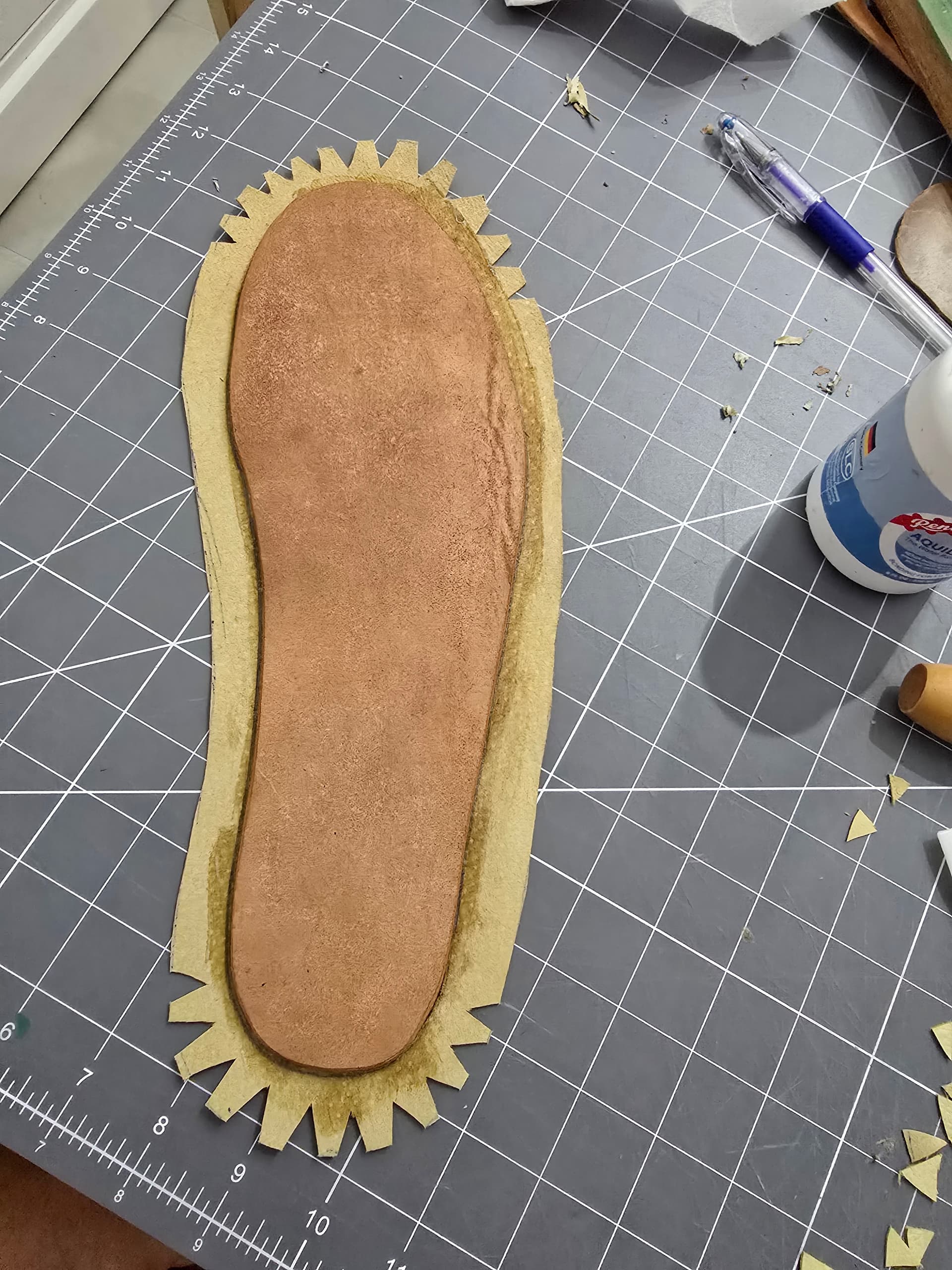 Started filling in the bottom. Went with leather instead of cork since the cup sole has a bunch of pockets that I could forsee encouraging breakdown of the cork in unsupported areas. Got it all leveled out, so next step is to attach the cup soles.