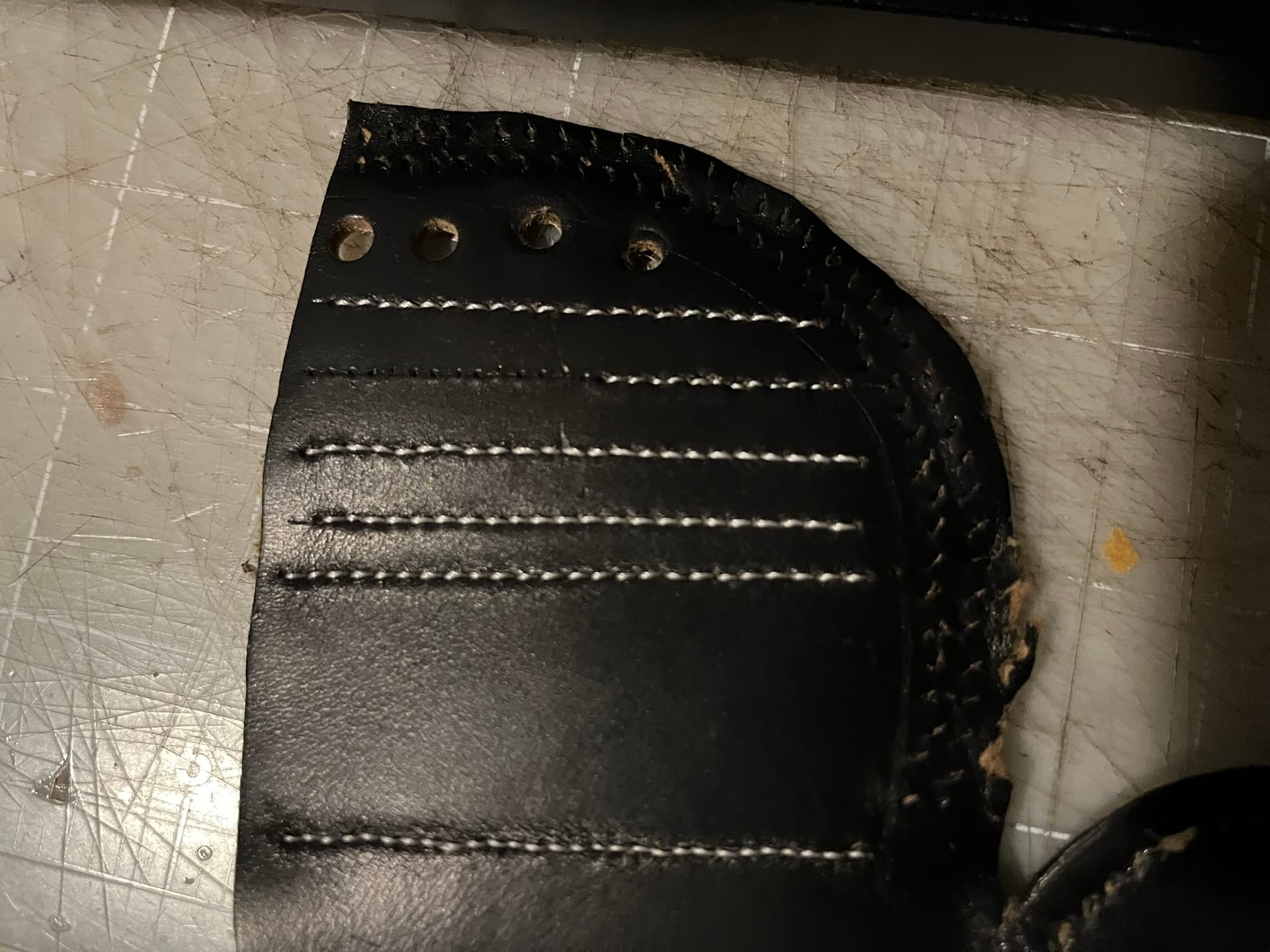 It’s possible to get a neat slanted effect with backstitch if you’re careful to make sure the threads cross the same way in the holes each time. I’m tempted to find some place on the outside of an upper where I can use that. I could even do it with different thread colors, creating a candy-cane spiral effect. Black and white over brown leather might look neat.