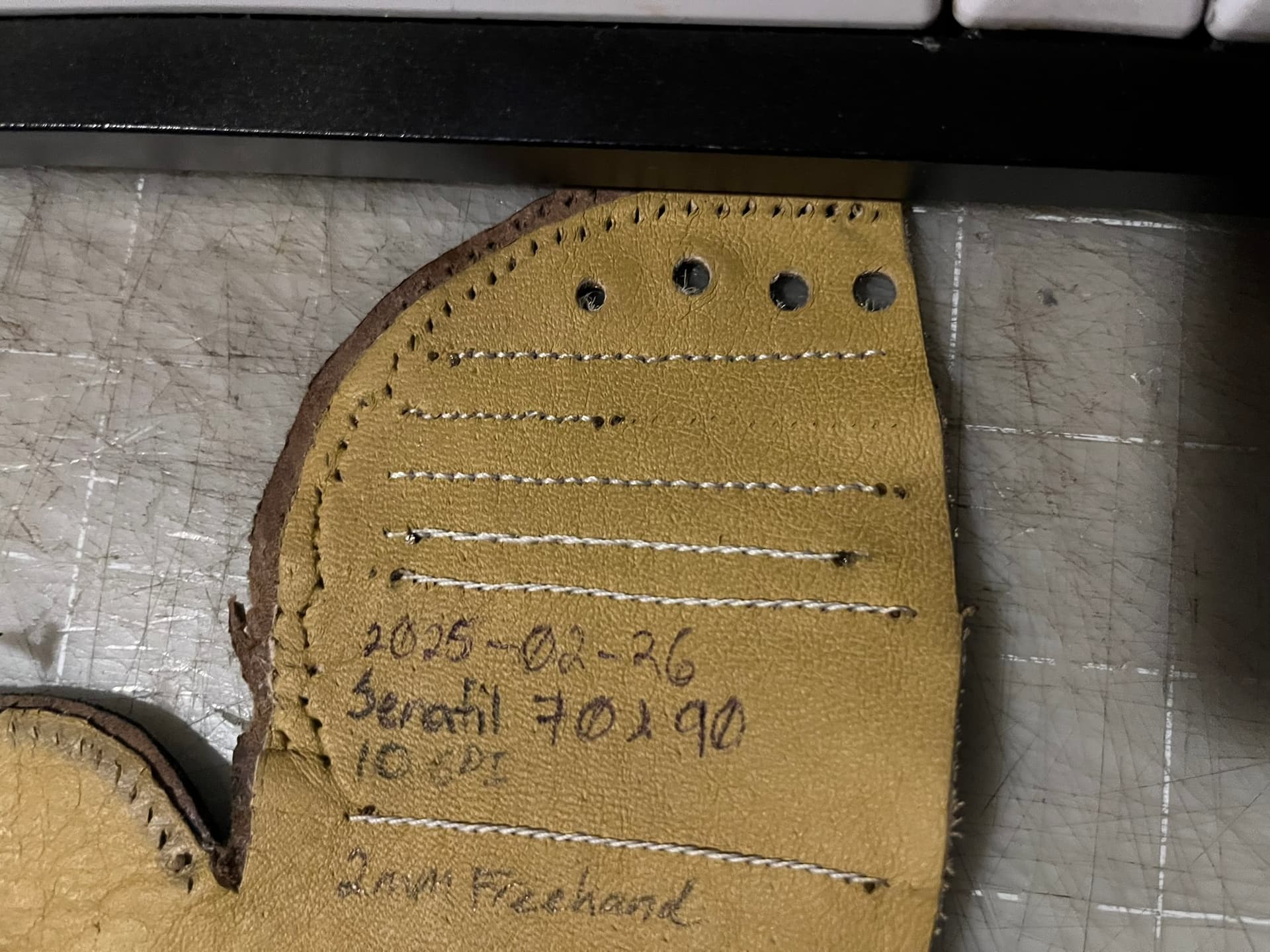 Having closed my fourth pair, I’ve taken a little break to do some experiments in fine hand upper sewing. In particular, I’ve been interested in hand stitchlines finer than 8 SPI or 3 millimeters center-to-center, with threads thinner than 0.020" or 0.6 millimeters.
