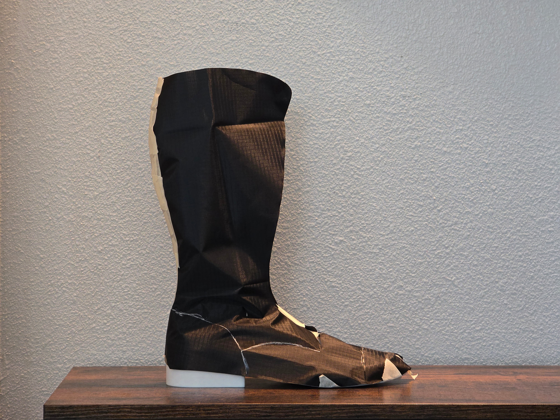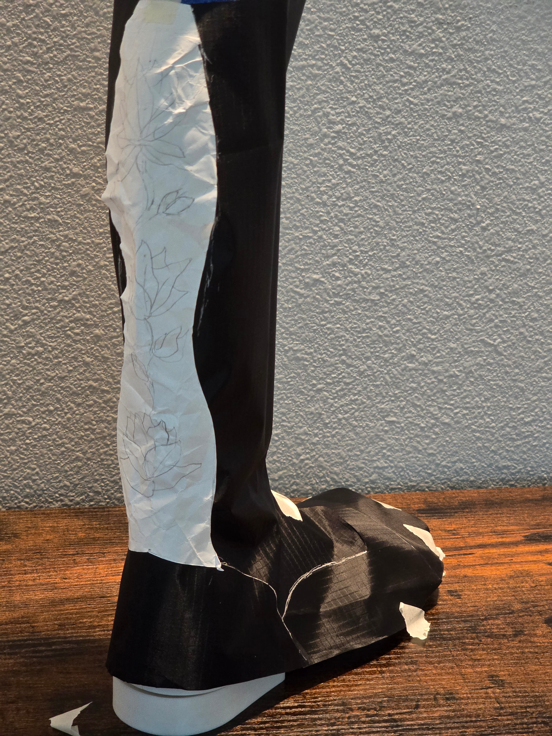 Rough pattern mock up in tyvex. Upper calf curve at the top line needs go not cut in quite as much. I will add a little girth there. Otherwise, feeling pretty good about it. Next is to start working out the shape of the backstay to sort out how much space is available for doing inlays without looking unbalanced.