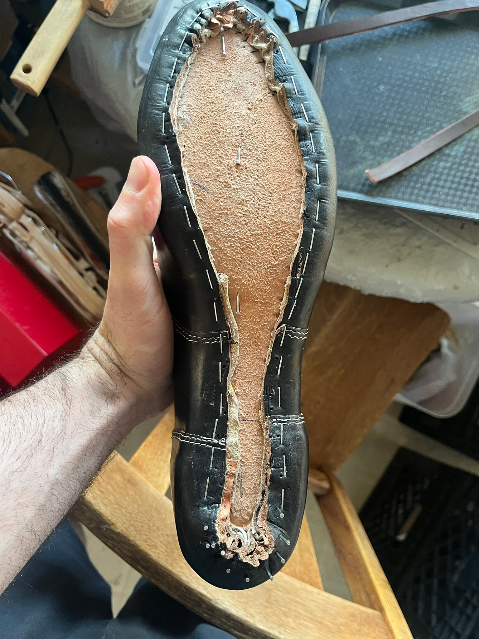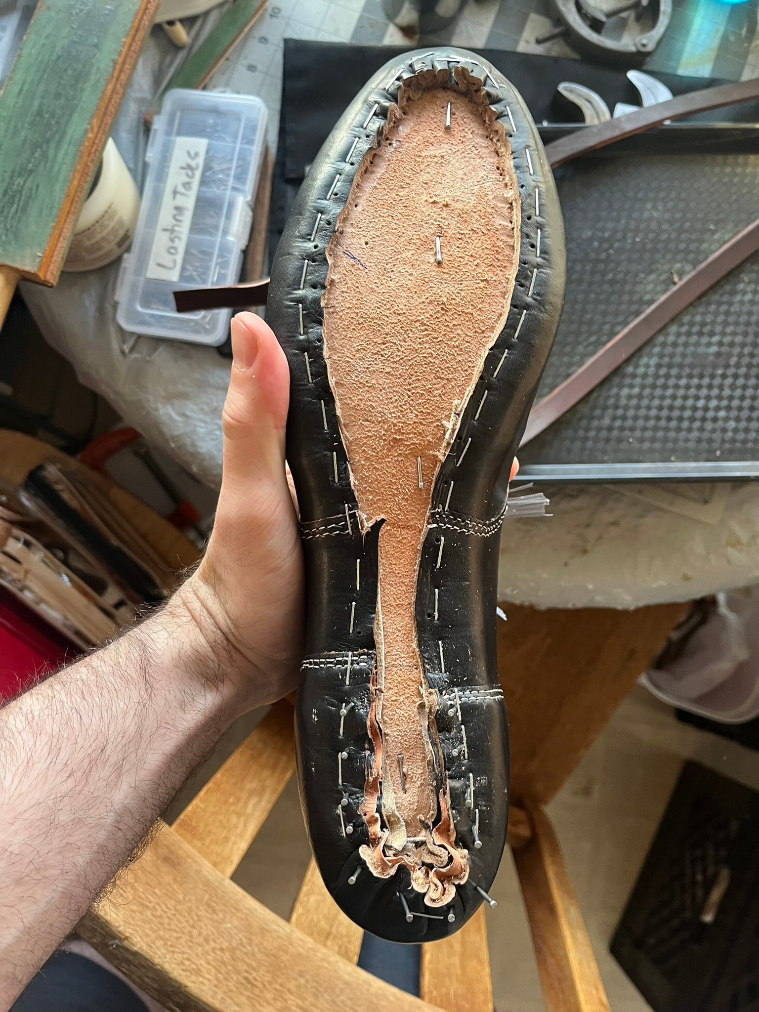 I do suspect that the first, cheap sole bend that I’m just now coming to the end of may be somewhat to blame. It’s definitely been rolled very hard. I’m not paying for JR soles anytime soon. I’m still kind of shocked how pricey those are, even from my local shoe supply. But I’m going to try some cut stock outsole blanks next time I’m by, probably from Keystone. I’d frankly trade some durability to keep hand outseaming fun.