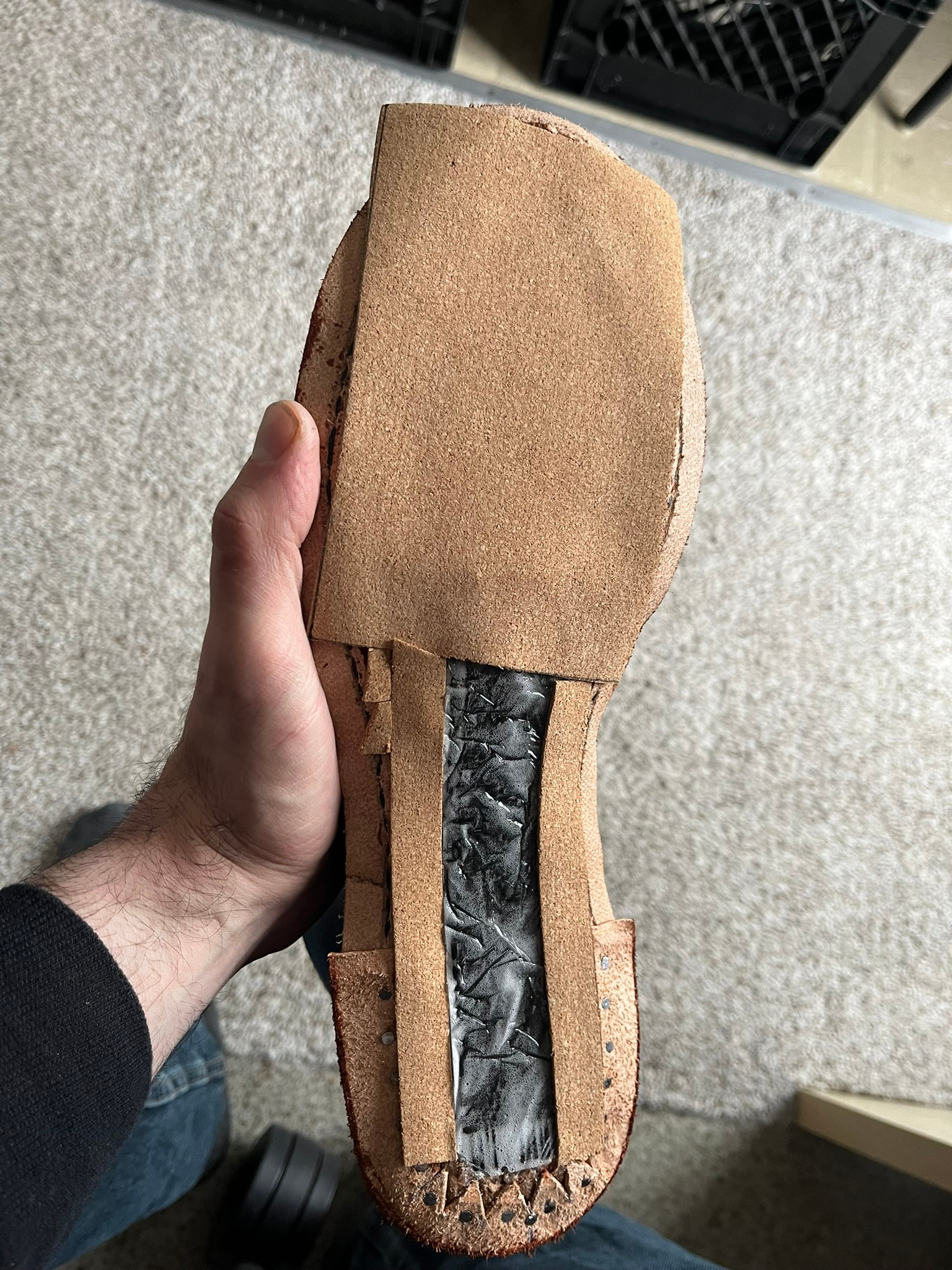 That turned out to play particularly badly with the thick sole leather heel counters I put in these. As a result, I’ve got one grinning stitch and some visible waviness around parts, above the rands.