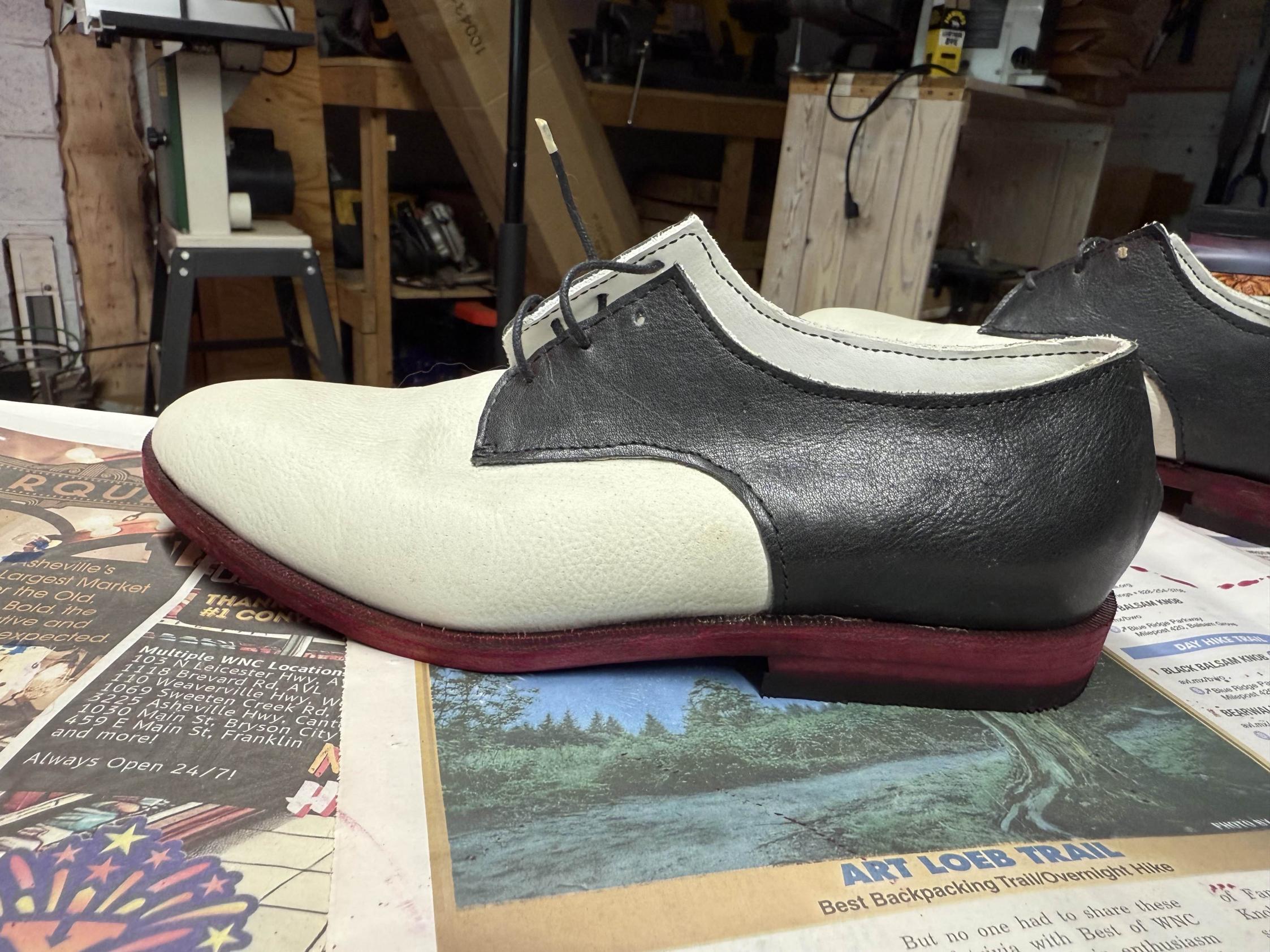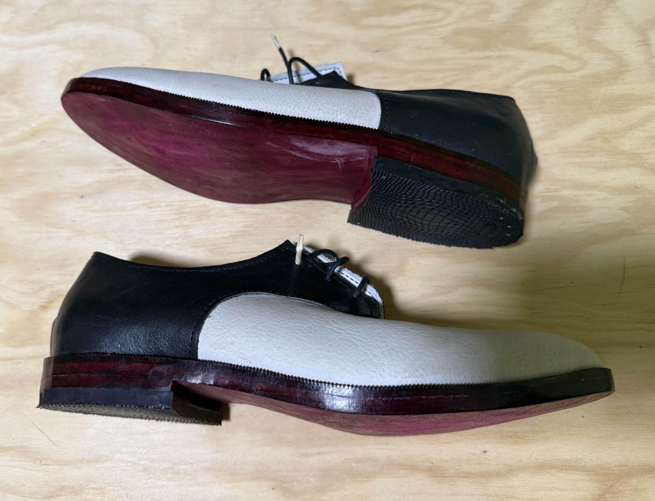 They are little cemented construction black and white derbies with false welt and dark red soles. I have toplift on the heel but not the front of the shoe, as I wanted to be able to slide around when dancing. They are not exactly a saddle shoe pattern, these were made to replicate a paper-thin pair of shoes I loved in college and walked through the soles of before I knew of any cobblers.